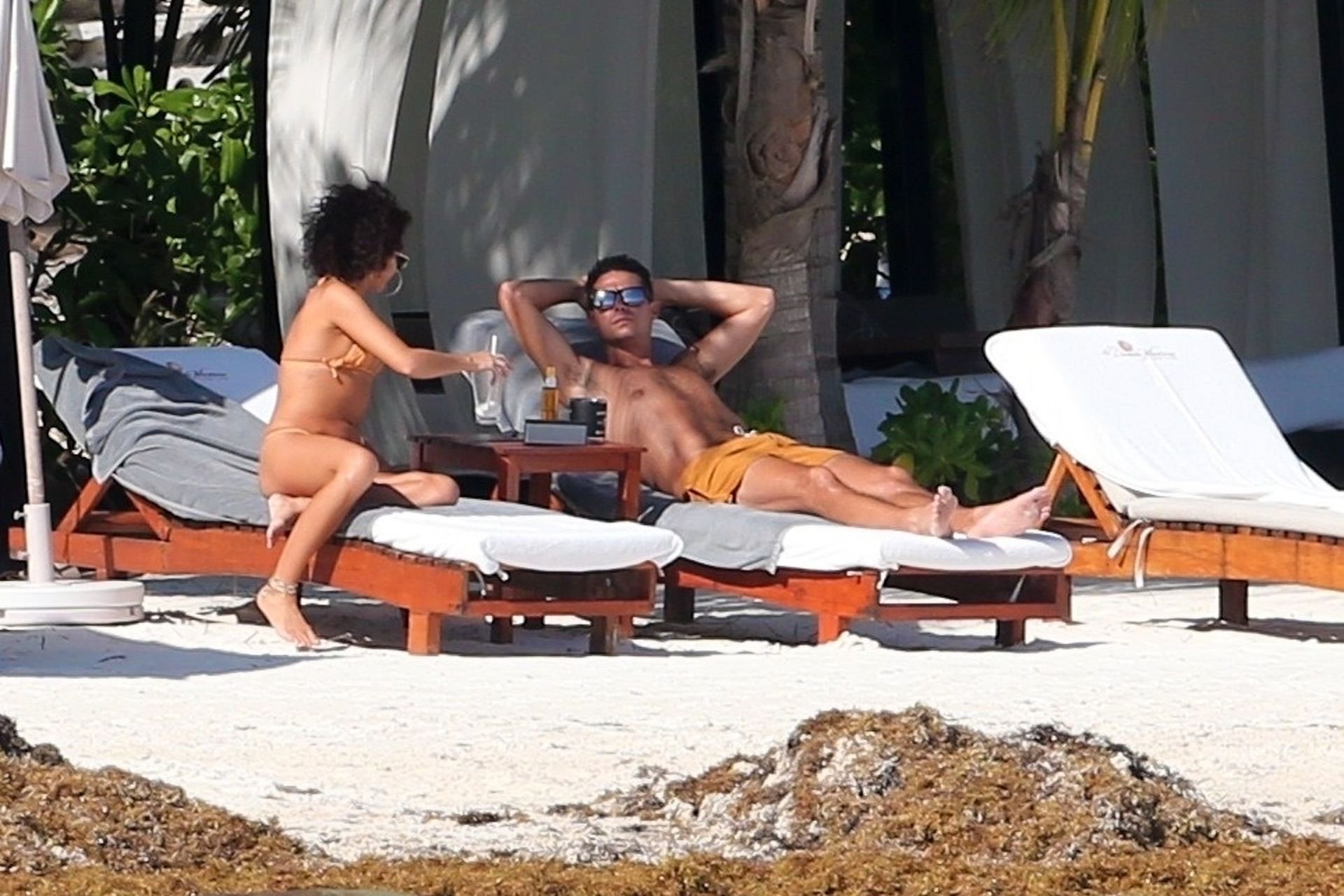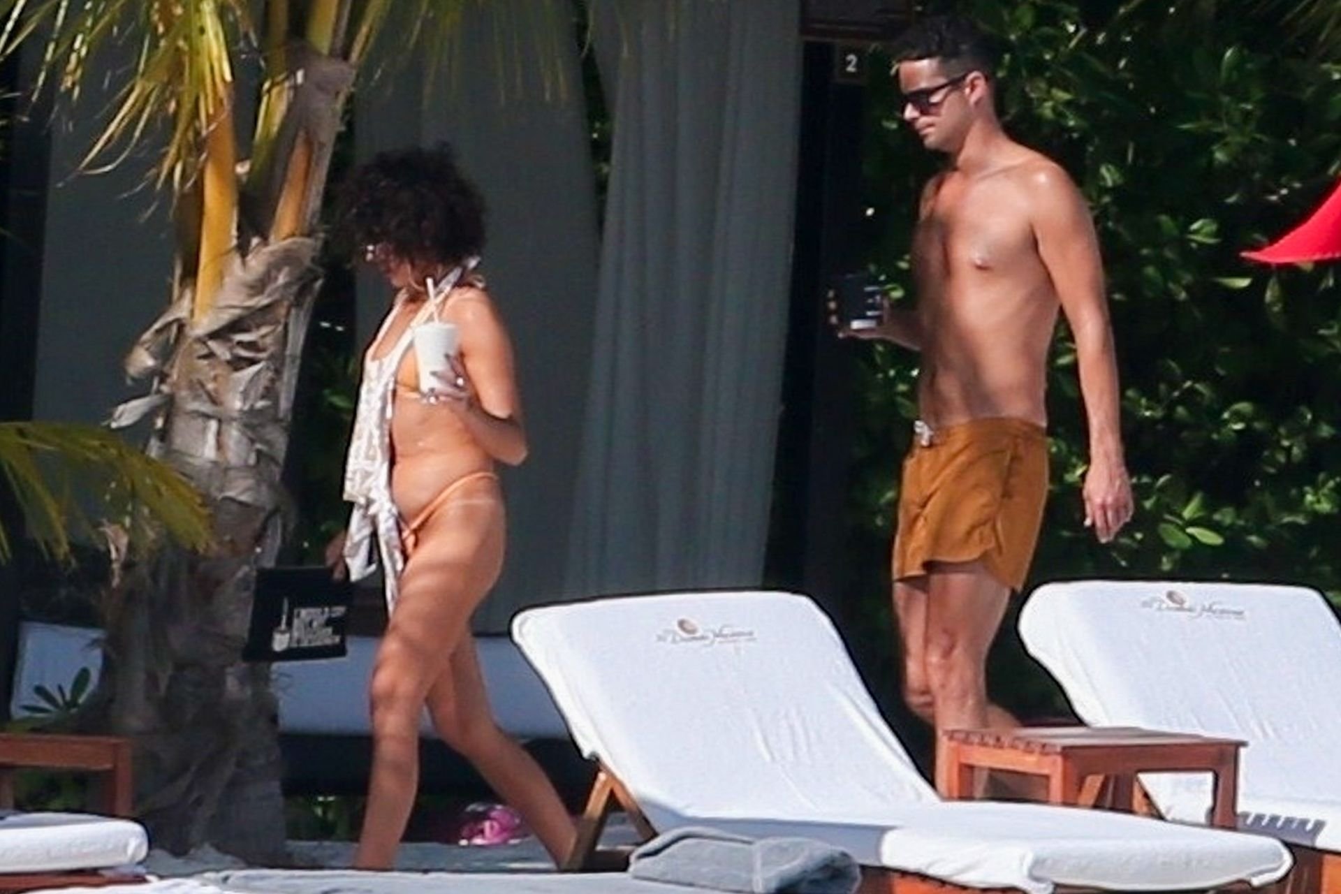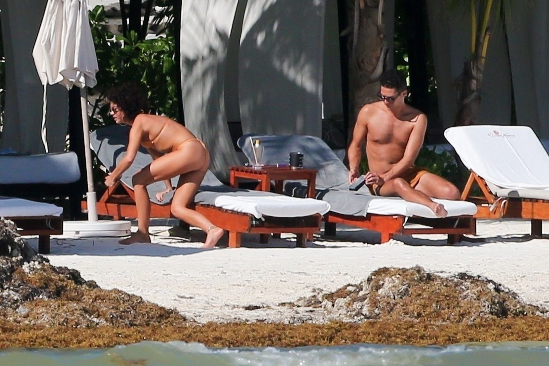 “Modern Family” y la estrella de The Fappening muestran su figura delgada en un bikini, mientras ella y su novio disfrutan de bebidas frías en la playa de su hotel juntos, 01/04/2019.