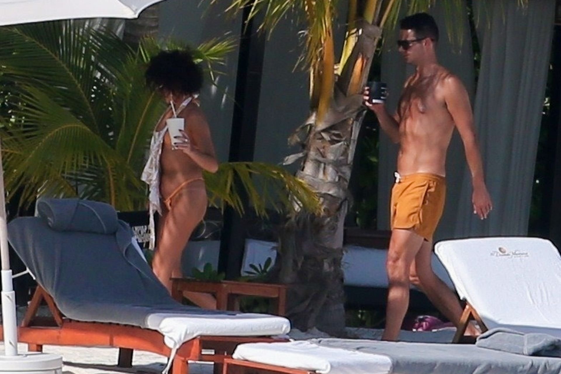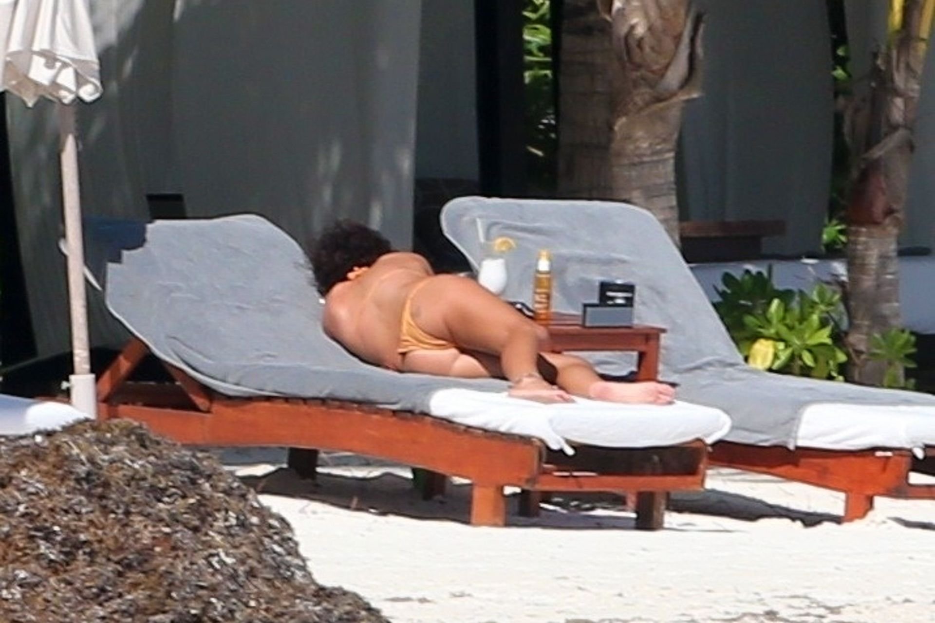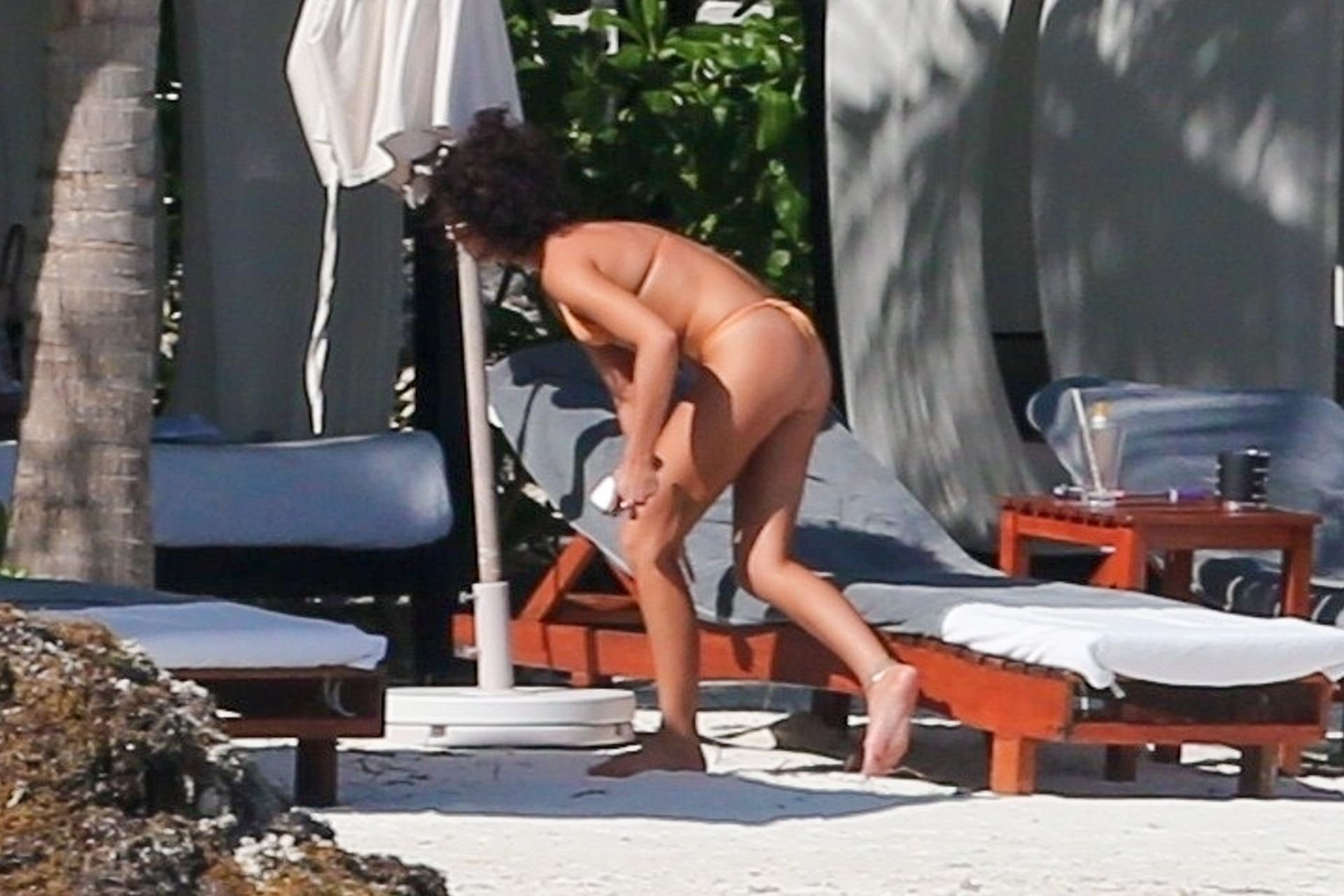 “Modern Family” y la estrella de The Fappening muestran su figura delgada en un bikini, mientras ella y su novio disfrutan de bebidas frías en la playa de su hotel juntos, 01/04/2019.