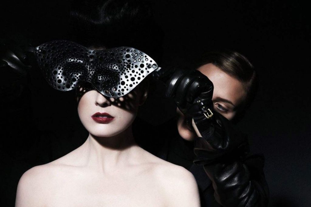 Check out how burlesque diva Dita Von Teese & hot blonde actress Scarlett Johansson posed for Flaunt Magazine cover page by James White! Dita was nude, while Scarlett wore a black corset and tights for this fetish photoshoot! Mistress was touching Von Teese; she made her kneel like a dog on a leash!