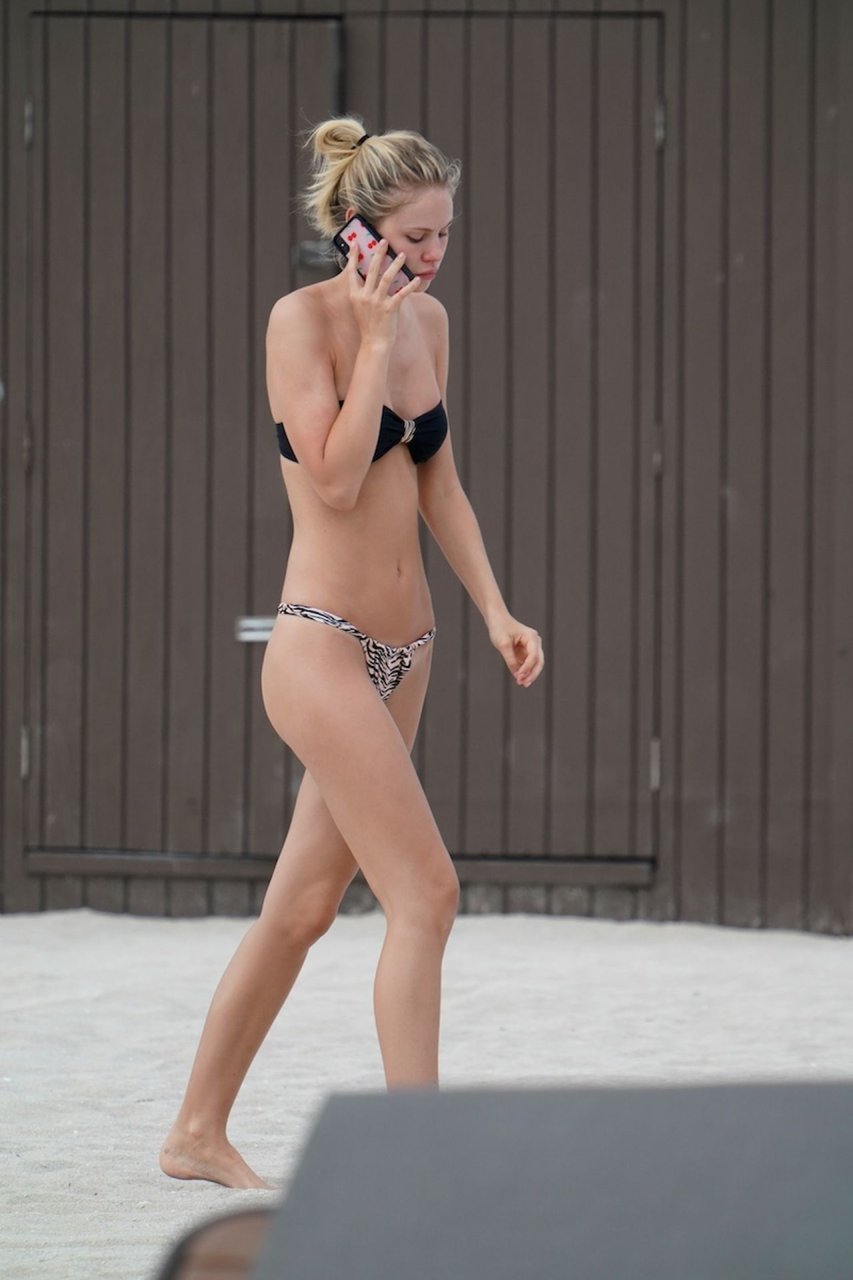 American skinny model Scarlett Leithold (22) was seen in a mismatched tiny bikini at the beach in Miami, 06/08/2019.