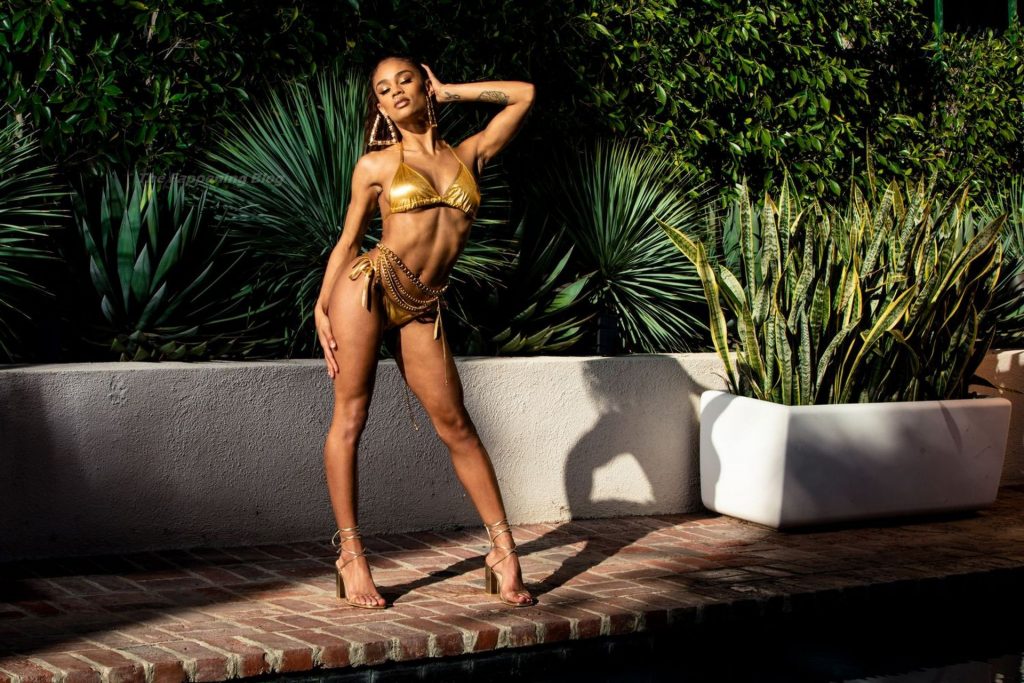 La actriz porno y modelo Scarlit Scandal también es conocida como Twistys Treat del Mes (2021). En la nueva sesión de fotos, se ve en forma mientras se quita un bikini dorado!