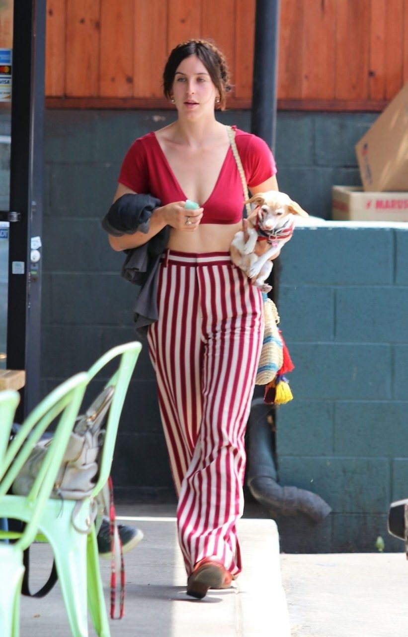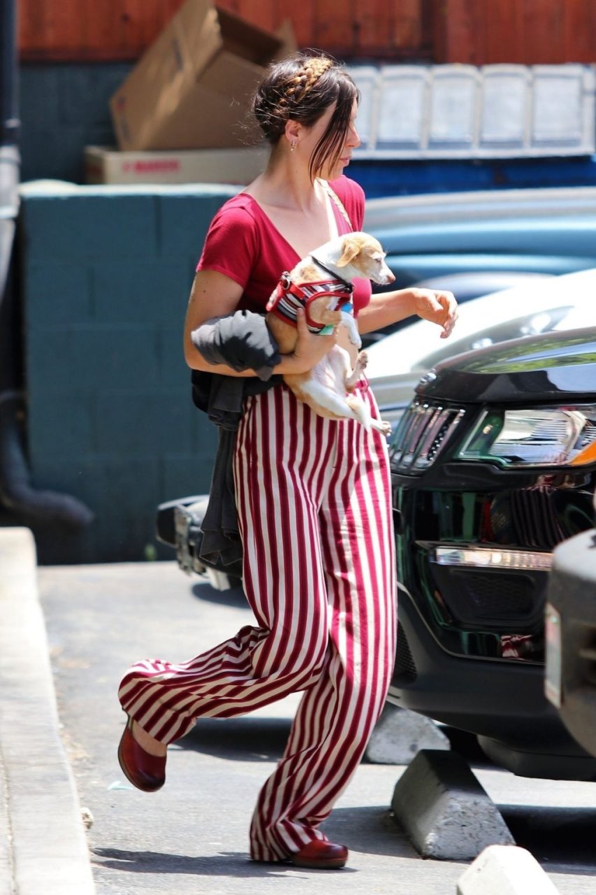 La actriz Scout Willis está en Los Ángeles haciendo una aparición fuera de una tintorería con su cachorro en las manos, 07/09/2019. La actriz lleva pantalones a rayas rojas/blancas combinados con una camiseta de cuello en V pronunciado.