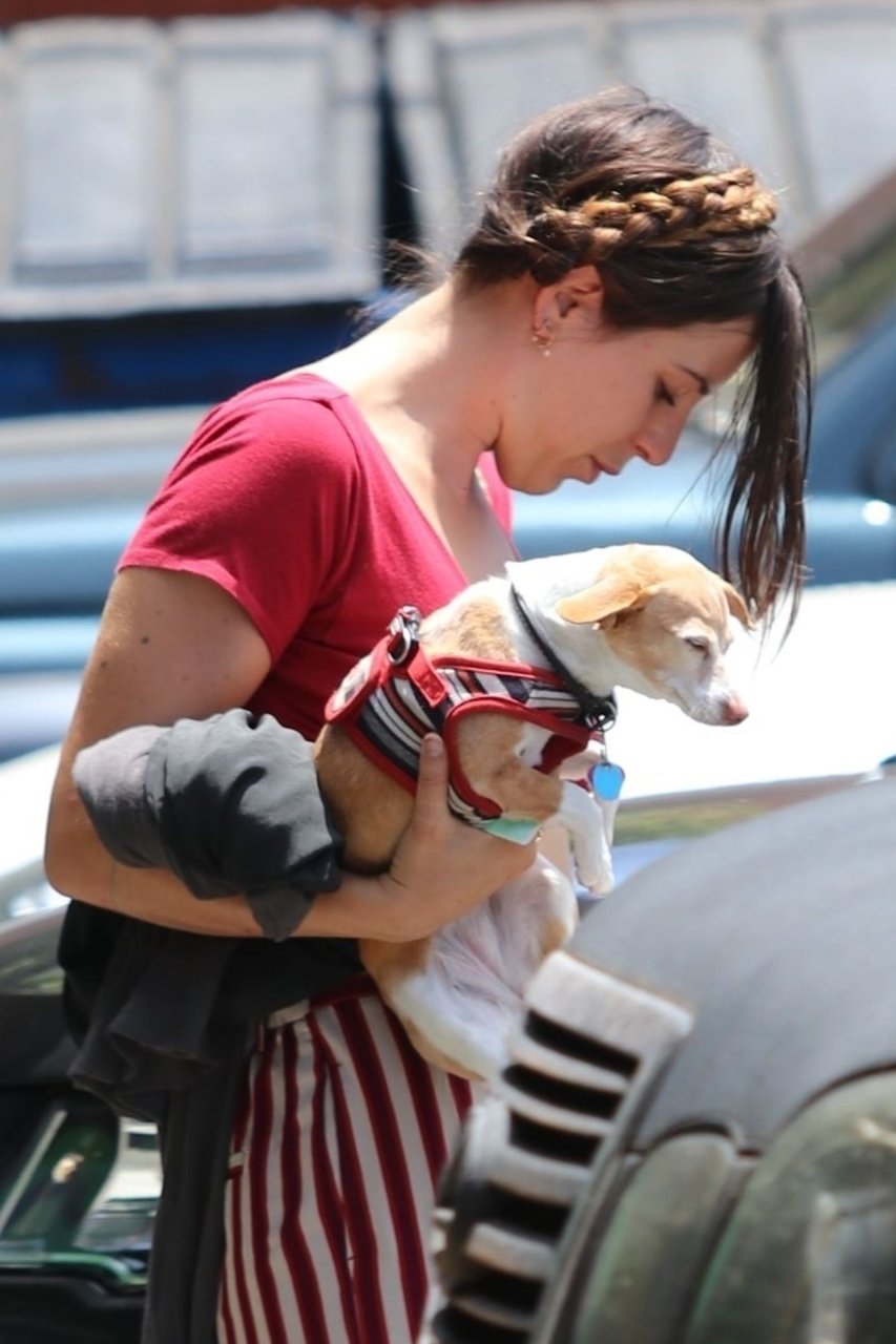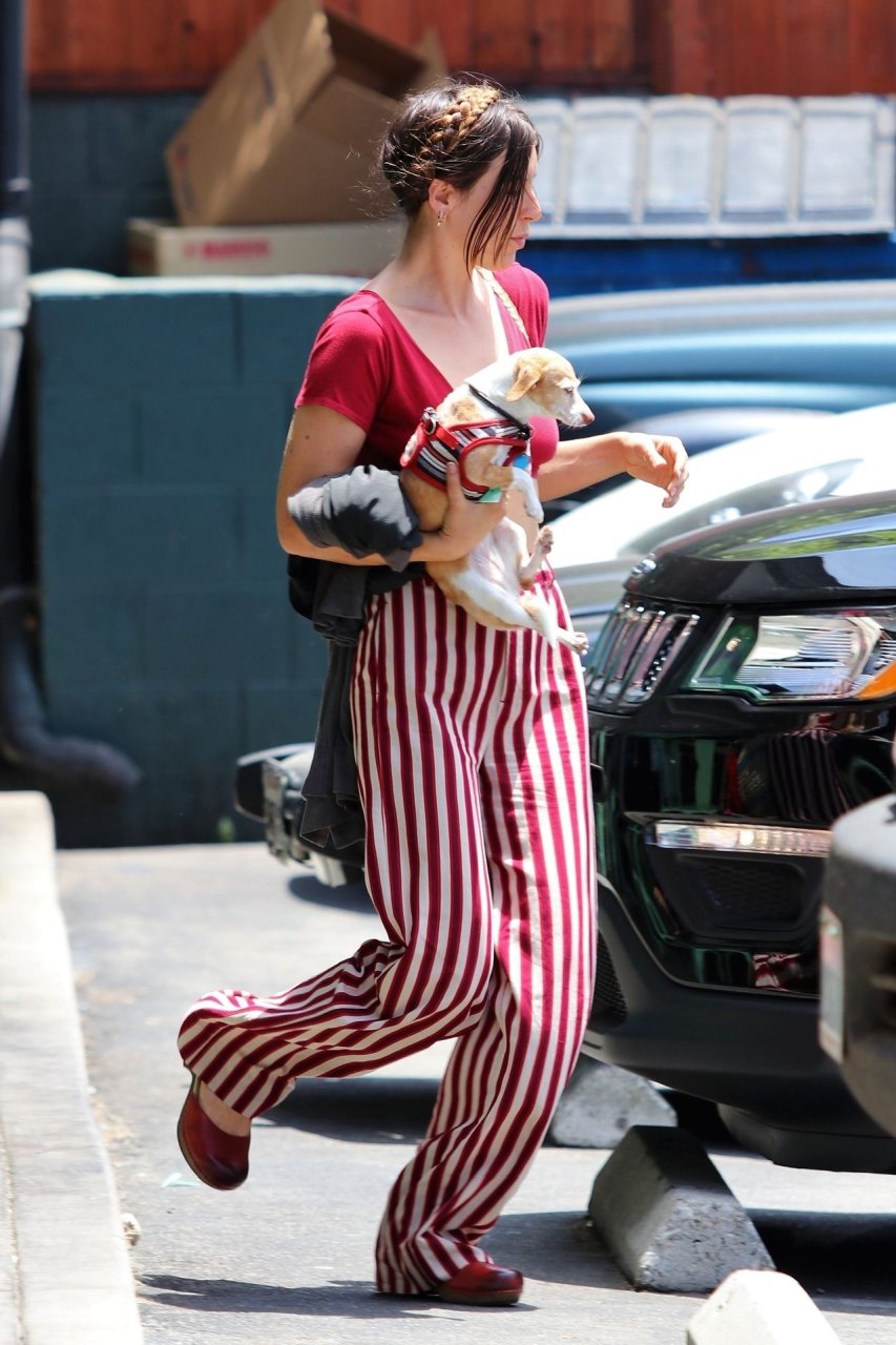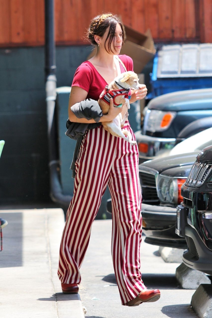 La actriz Scout Willis está en Los Ángeles haciendo una aparición fuera de una tintorería con su cachorro en las manos, 07/09/2019. La actriz lleva pantalones a rayas rojas/blancas combinados con una camiseta de cuello en V pronunciado.