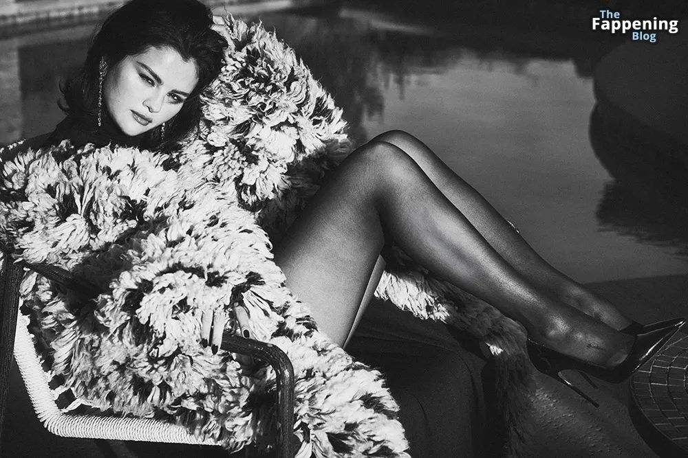 Selena Gomez aparece en su sesión para Hollywood Reporter luciendo lujosa piel, medias transparentes y un ambiente junto a la piscina—este es su look más espectacular hasta la fecha.