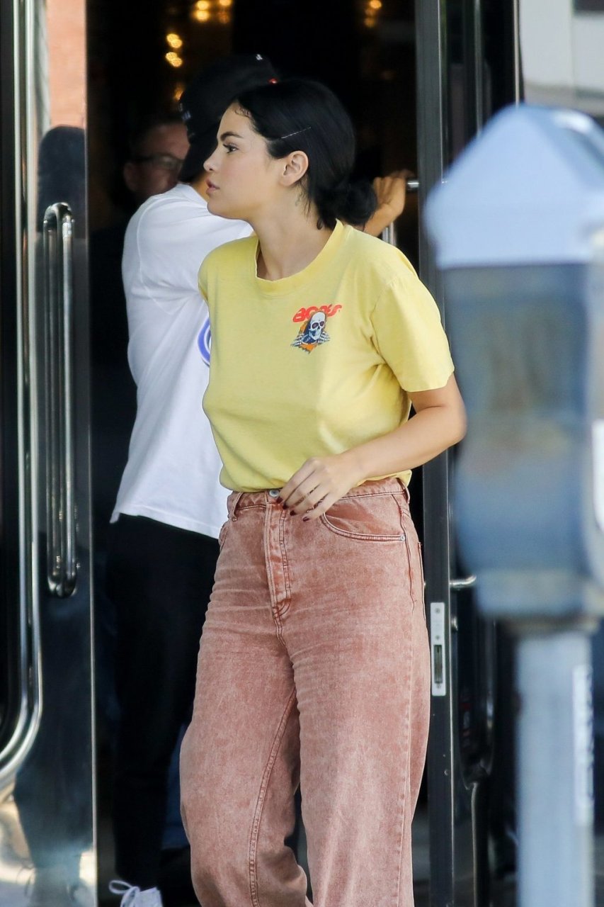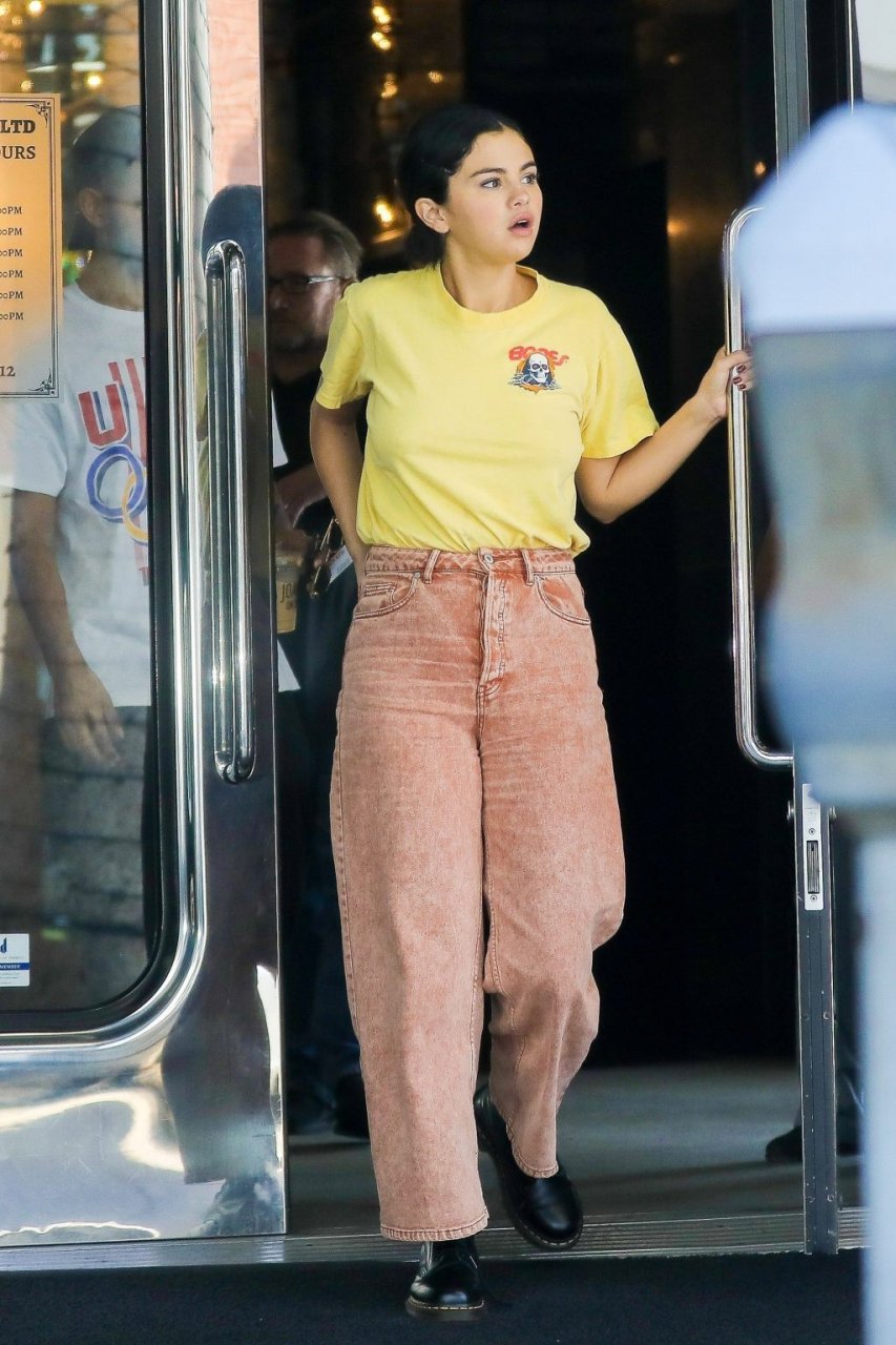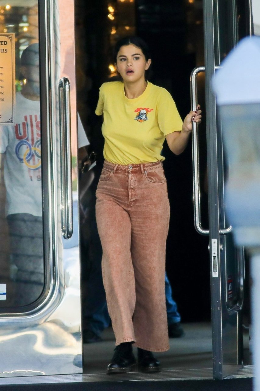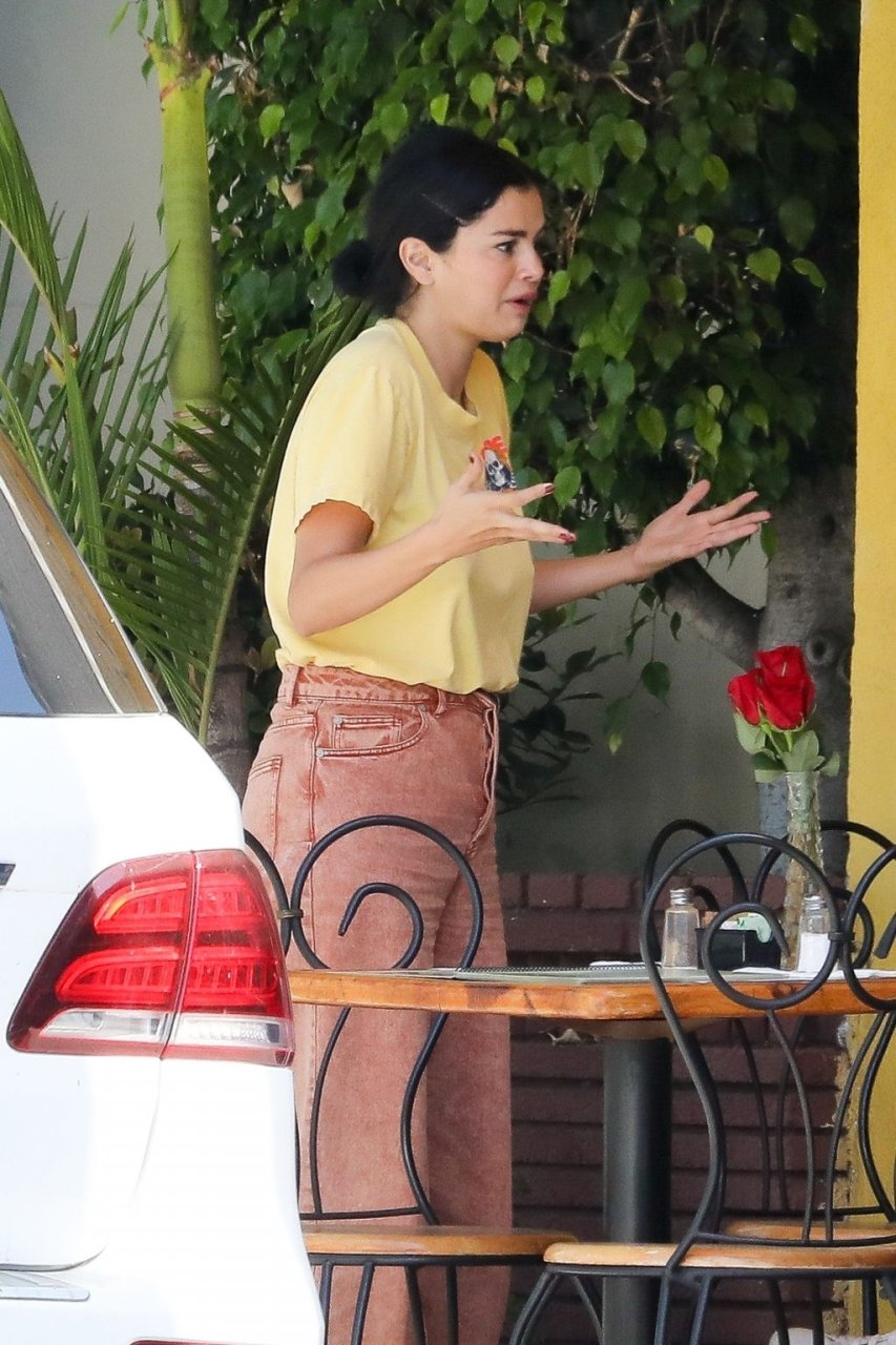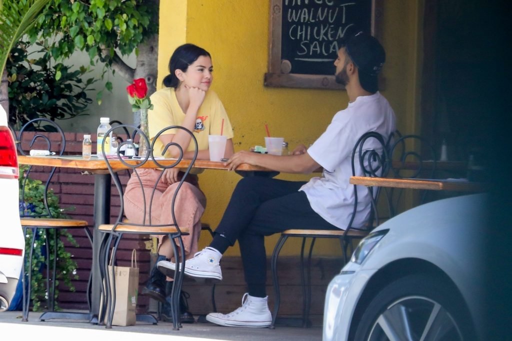 Selena Gomez disfruta de un desayuno al aire libre con un hombre desconocido después de comprar en XIV Karats, Ltd en Beverly Hills, 21/09/2018. Selena parece enamorada mientras charla con su amigo luciendo una camiseta de Bones skate boarder con jeans rojos acid wash y botas de cuero Dr. Martens, durante su salida casual matutina en LA.
