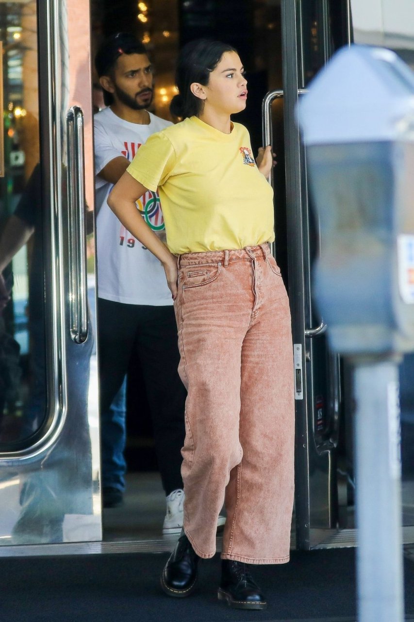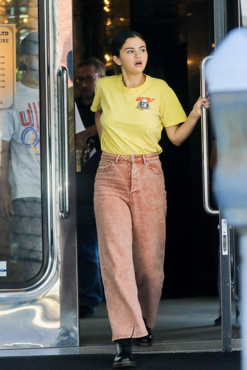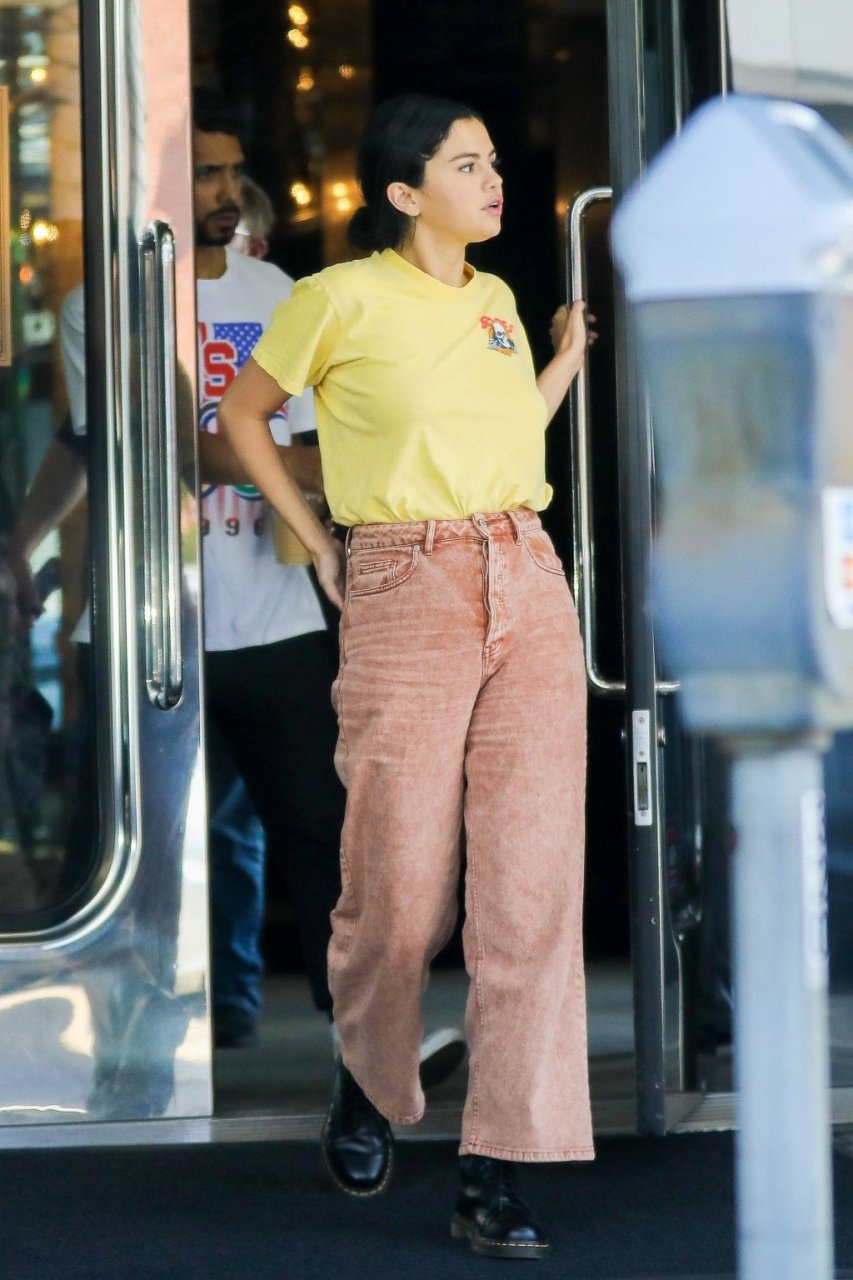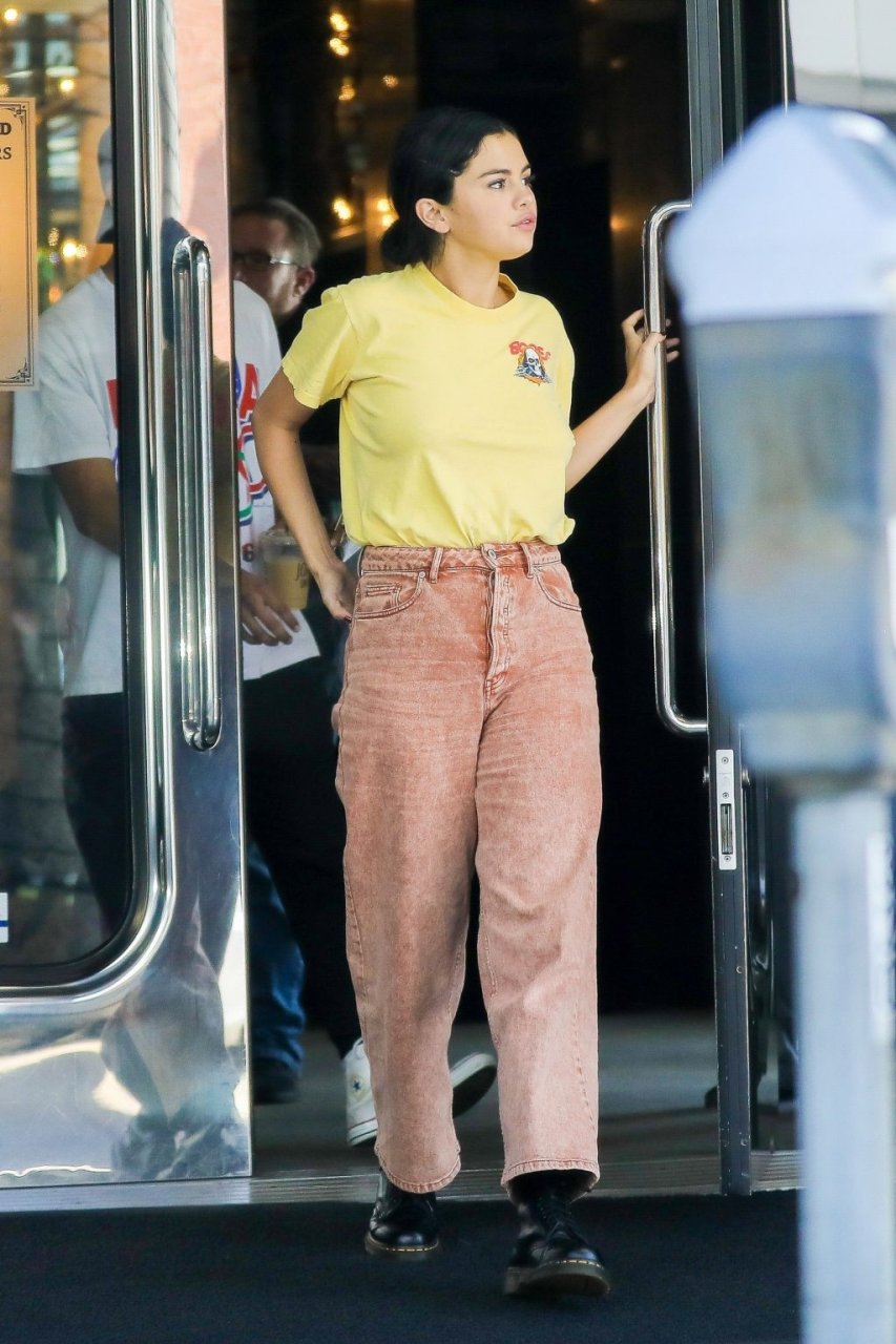 Selena Gomez disfruta de un desayuno al aire libre con un hombre desconocido después de comprar en XIV Karats, Ltd en Beverly Hills, 21/09/2018. Selena parece enamorada mientras charla con su amigo luciendo una camiseta de Bones skate boarder con jeans rojos acid wash y botas de cuero Dr. Martens, durante su salida casual matutina en LA.