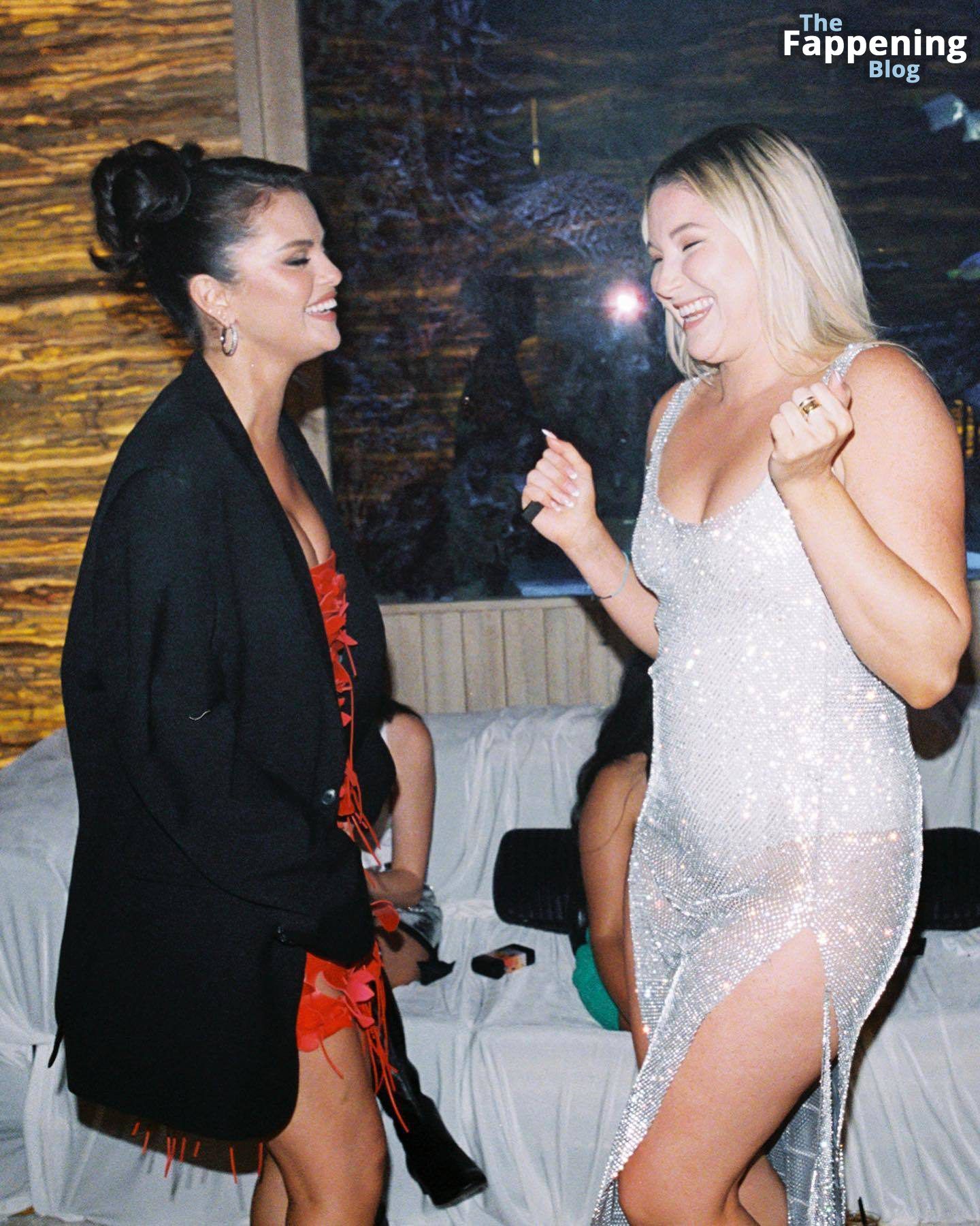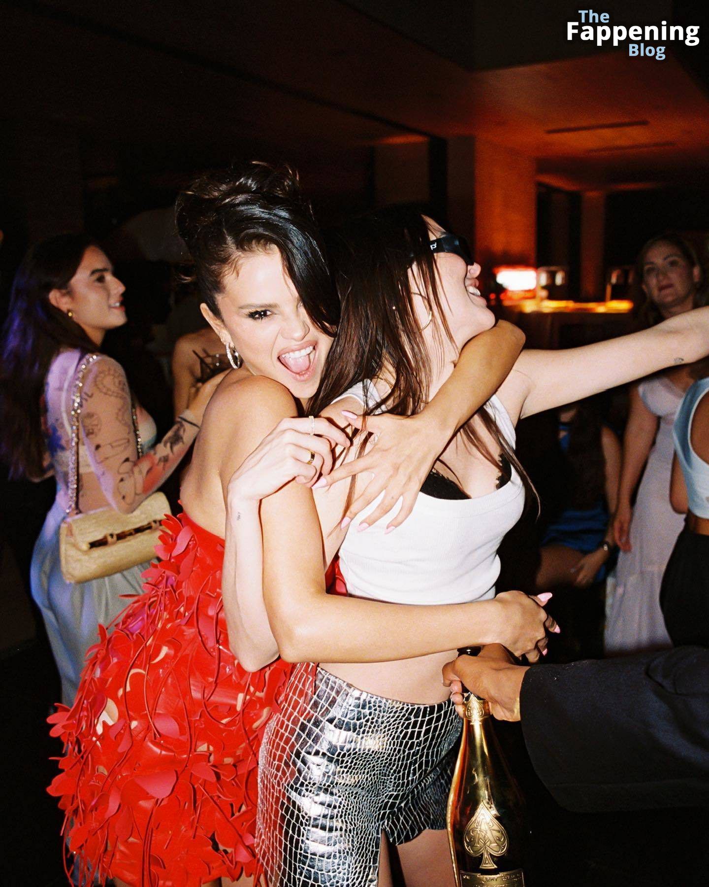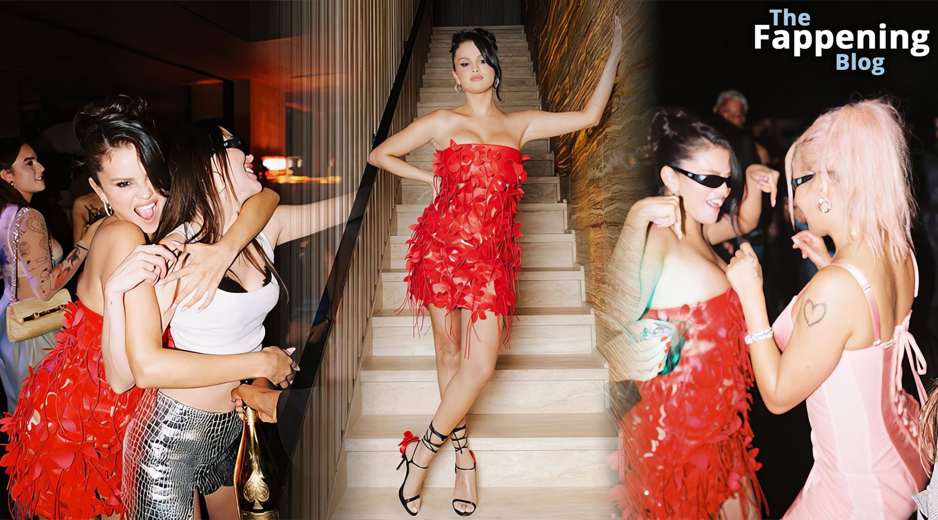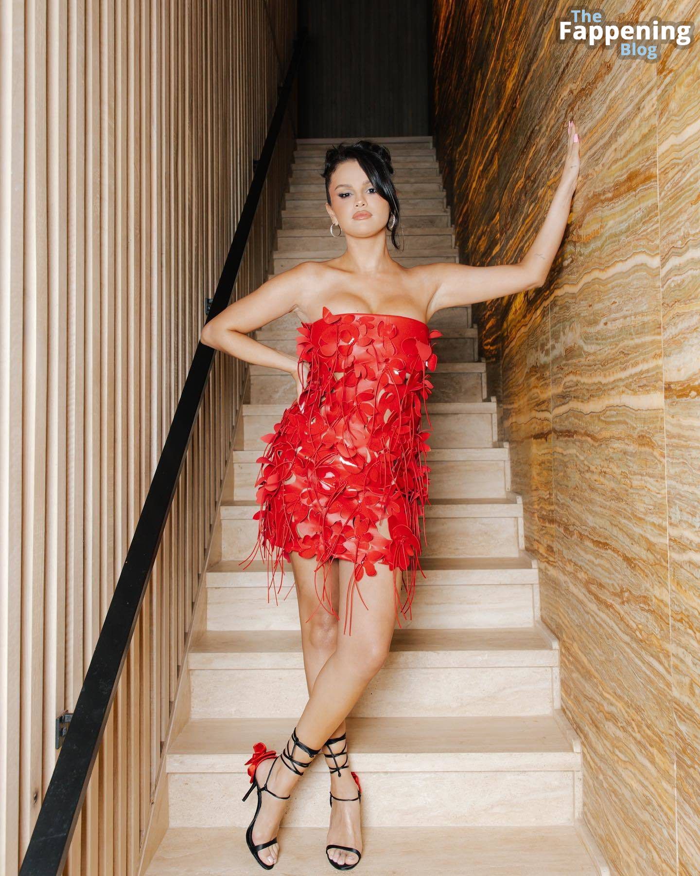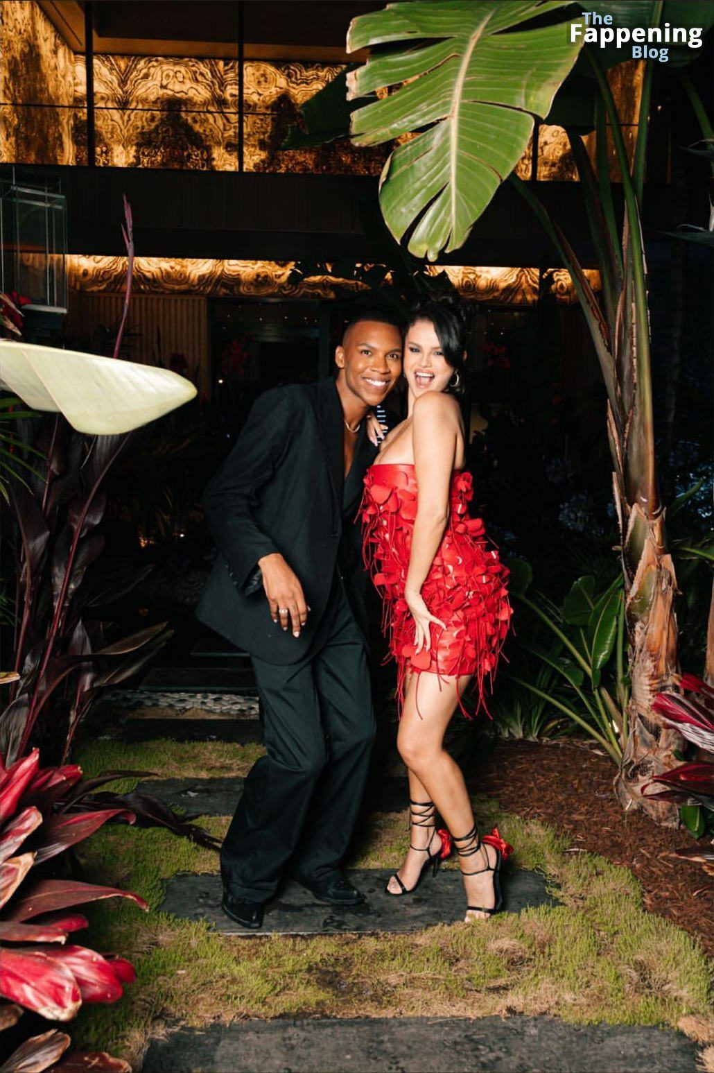 ¡Mira a la estrella de The Fappening Selena Gomez luciendo un vestido rojo fuego, mostrando ese escote sexy en la sesión de fotos de Virisa Yong para su fiesta de cumpleaños!