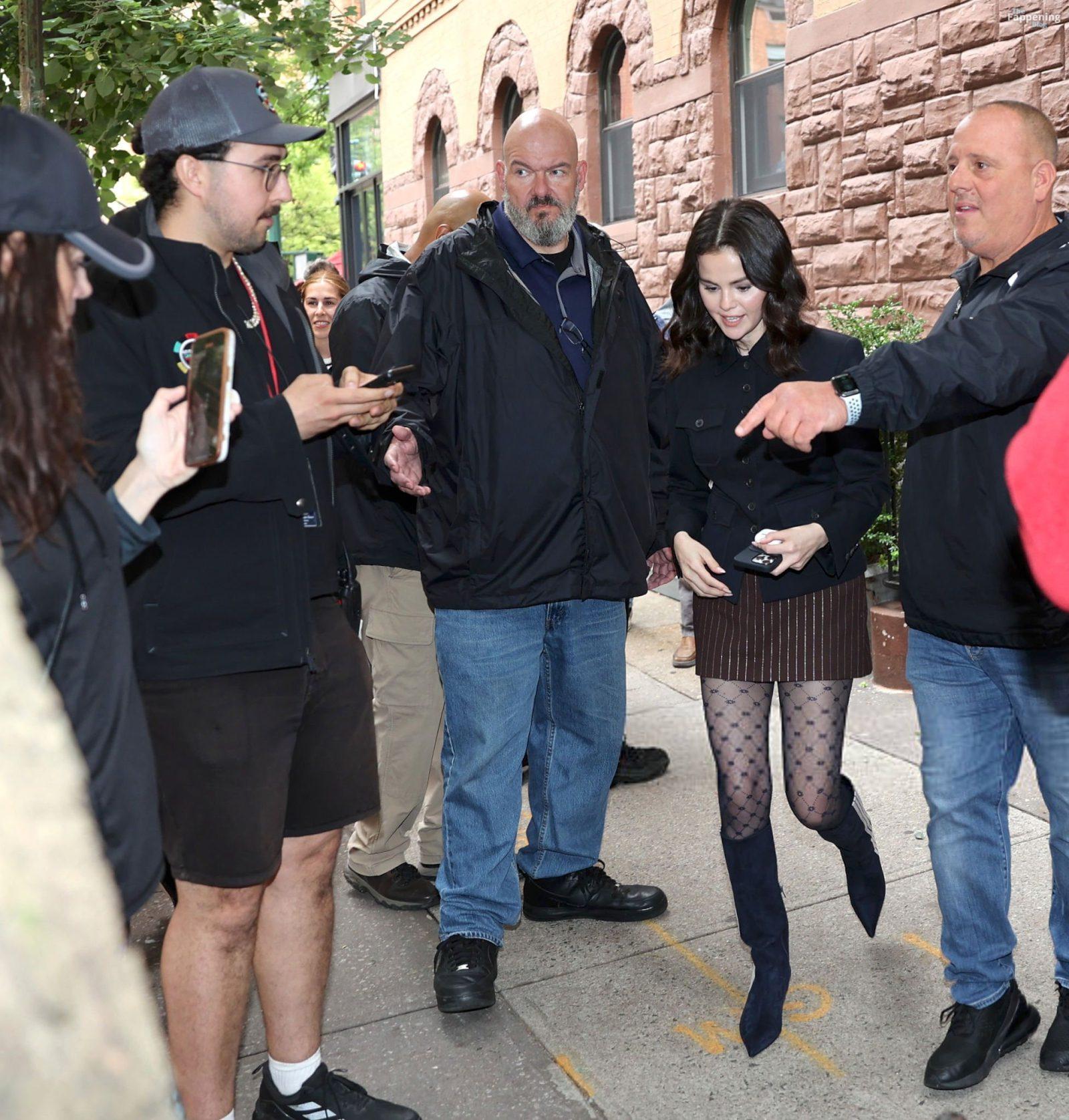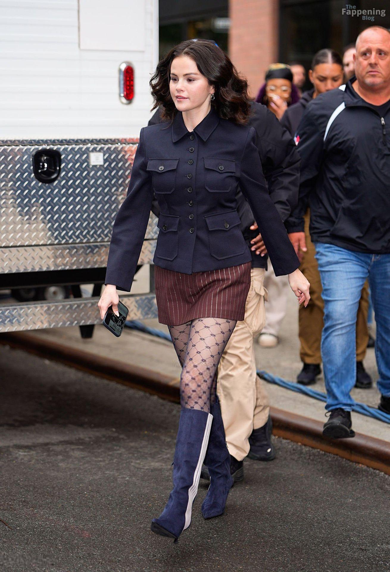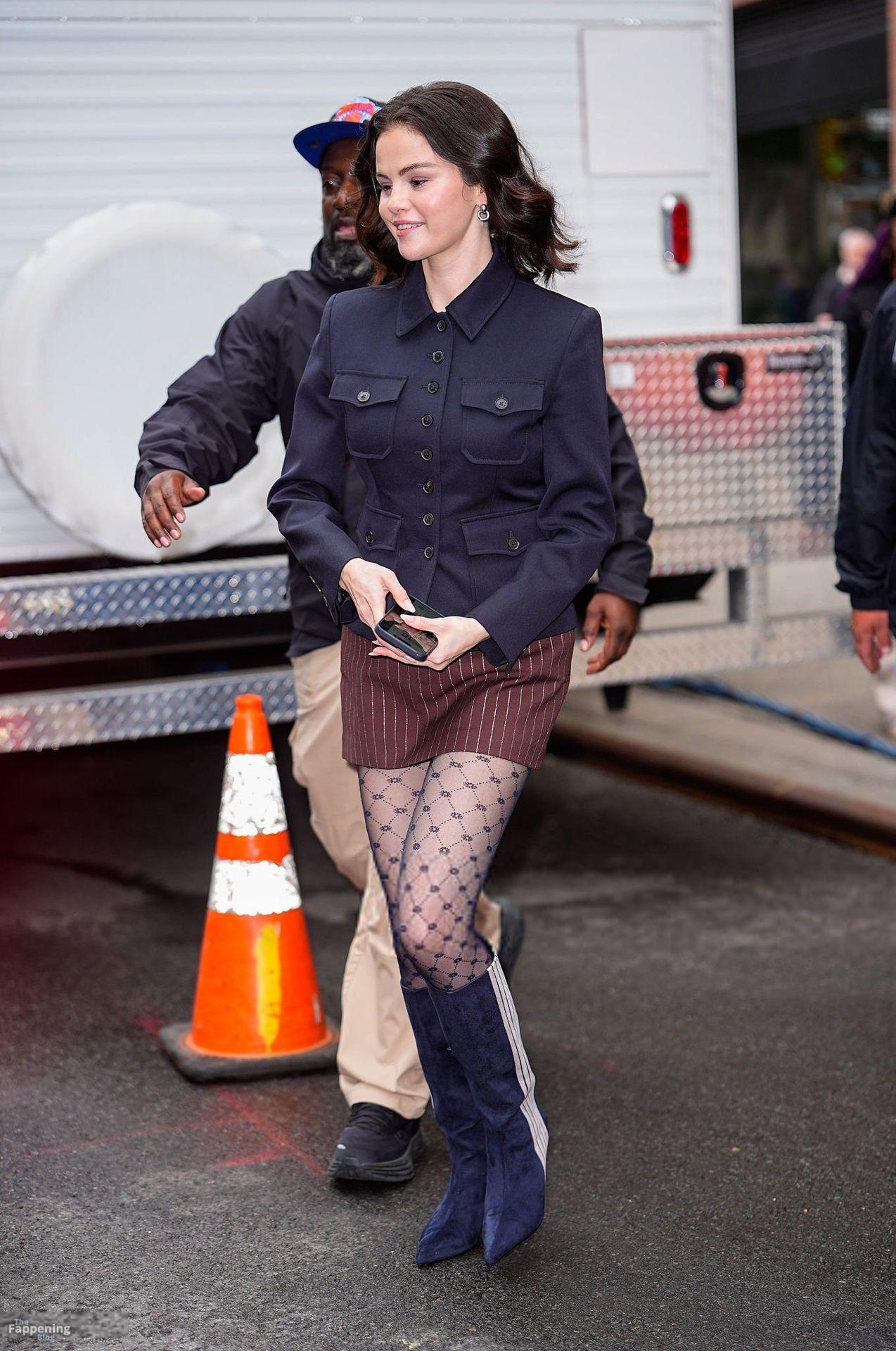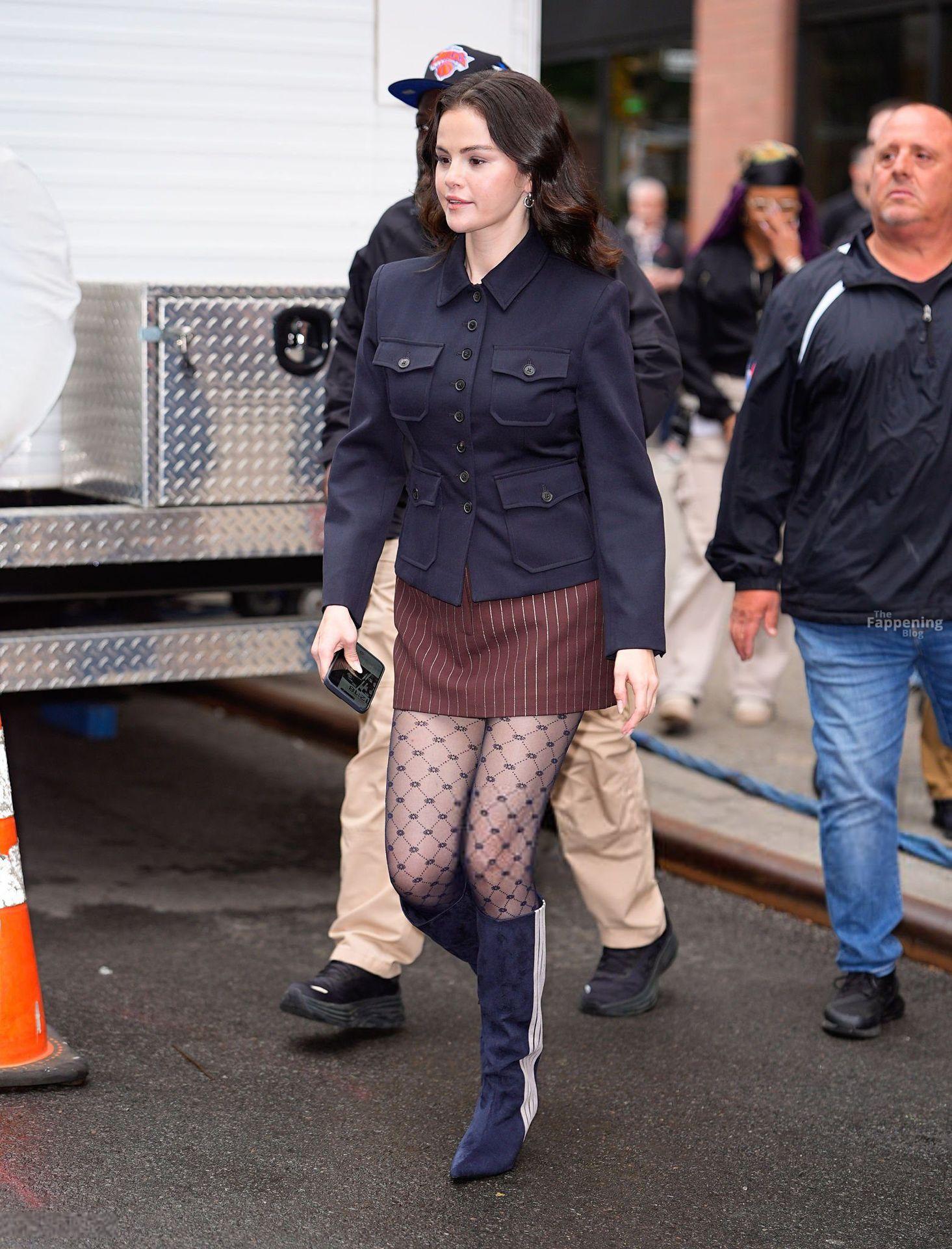 La estrella de The Fappening Selena Gomez es vista en NYC, mostrando sus sexy piernas con medias transparentes estampadas y una minifalda de rayas finas.