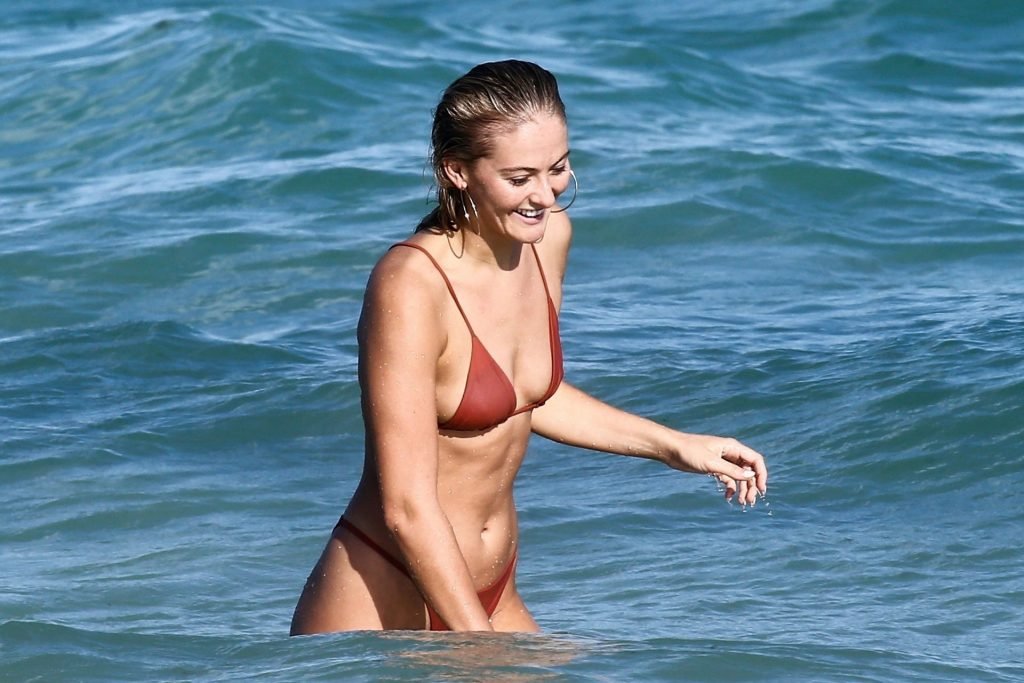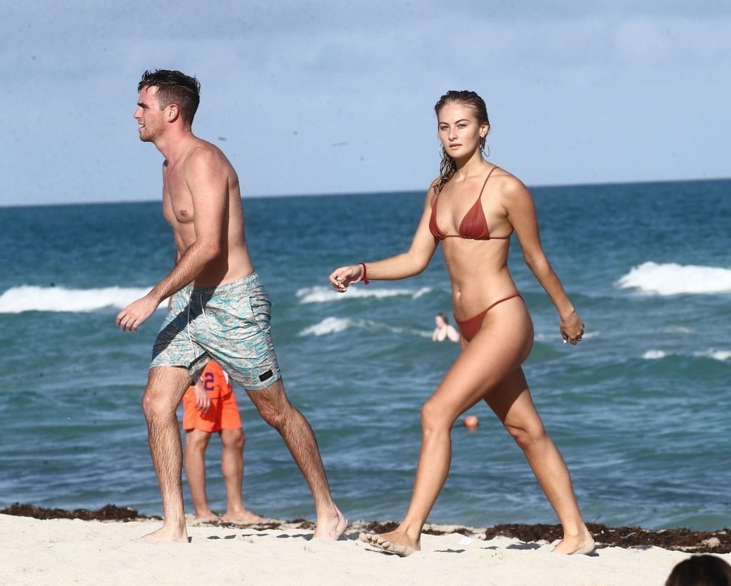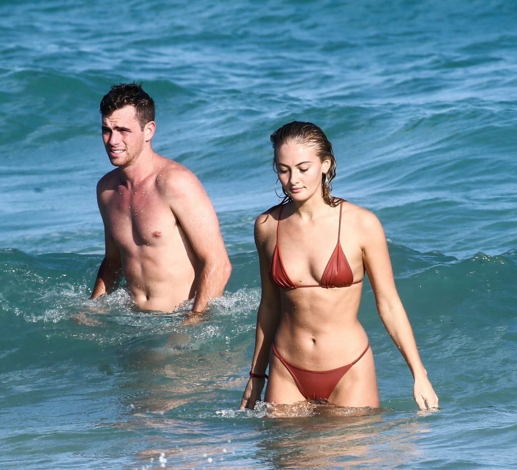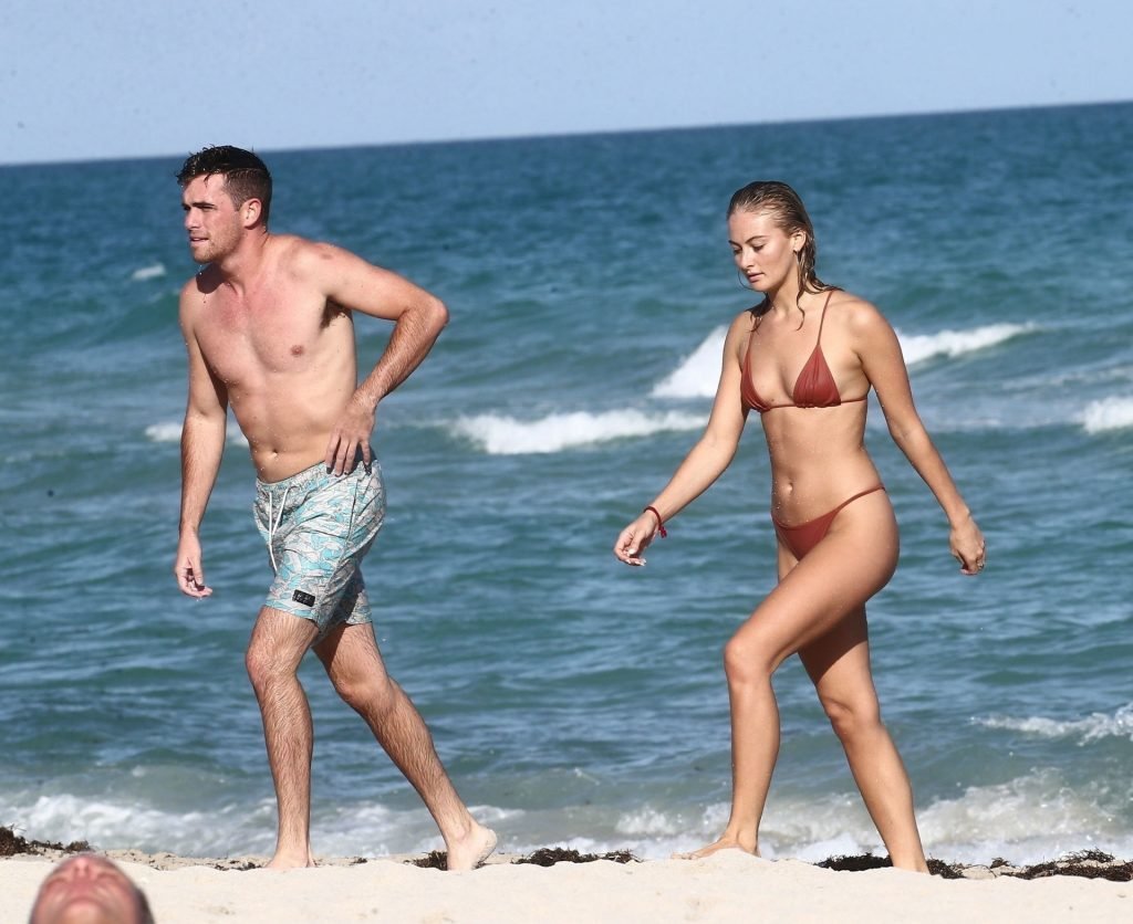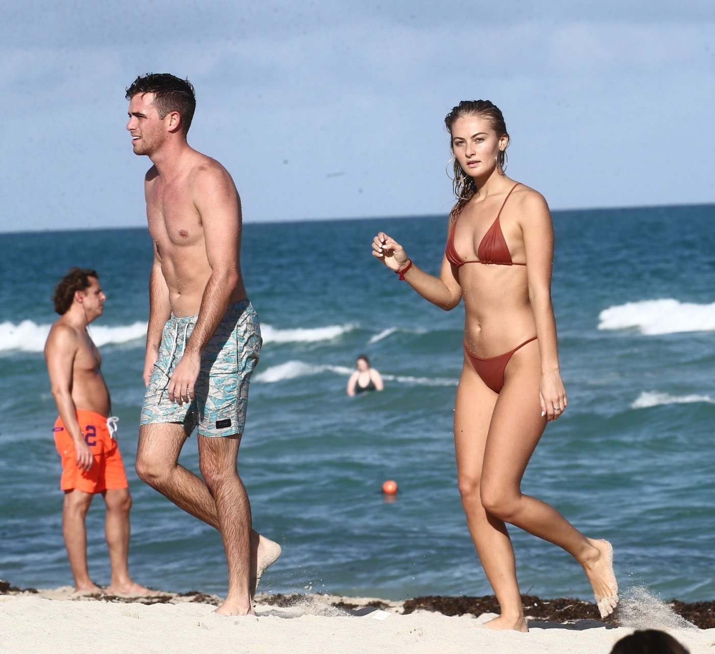 Modelo de Instagram Selena Weber y su novio disfrutan de un día en la playa en Miami en el Hotel Nautilus, 13/11/2018. Selena muestra su cuerpo sexy con un diminuto bikini marrón mientras se refresca en el océano.