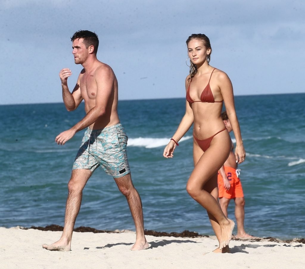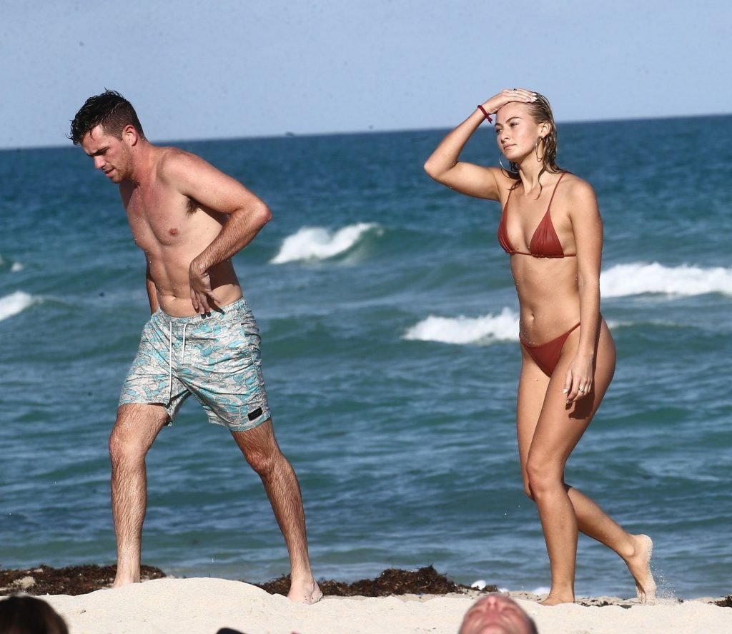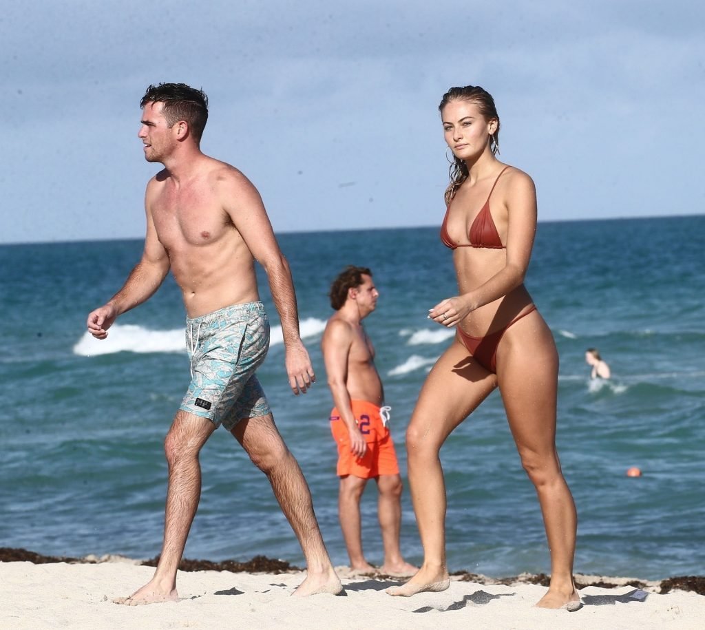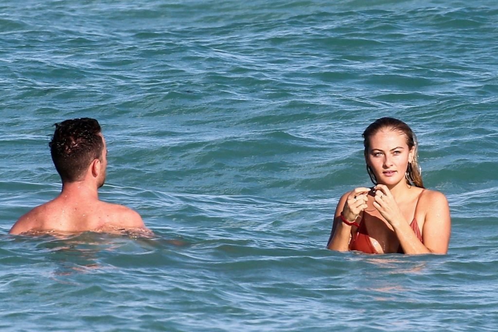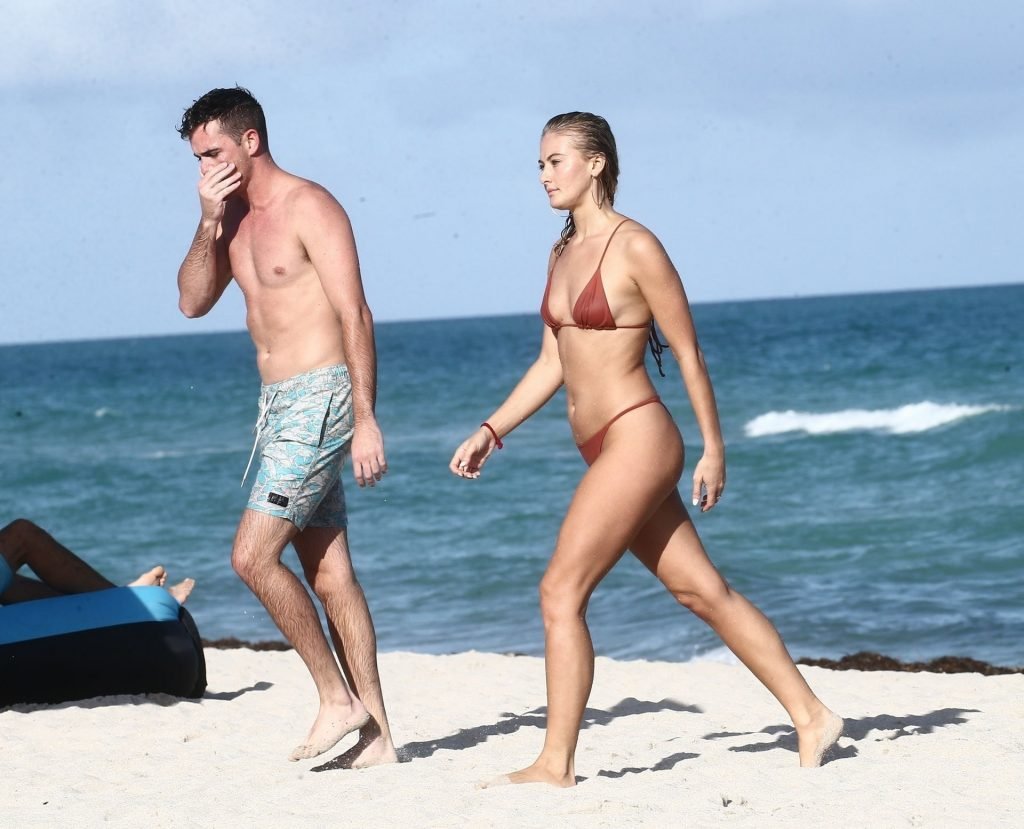 Modelo de Instagram Selena Weber y su novio disfrutan de un día en la playa en Miami en el Hotel Nautilus, 13/11/2018. Selena muestra su cuerpo sexy con un diminuto bikini marrón mientras se refresca en el océano.