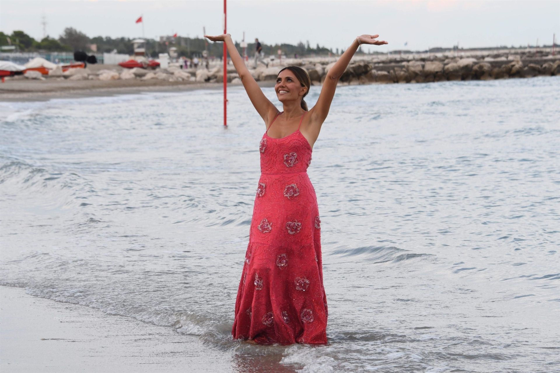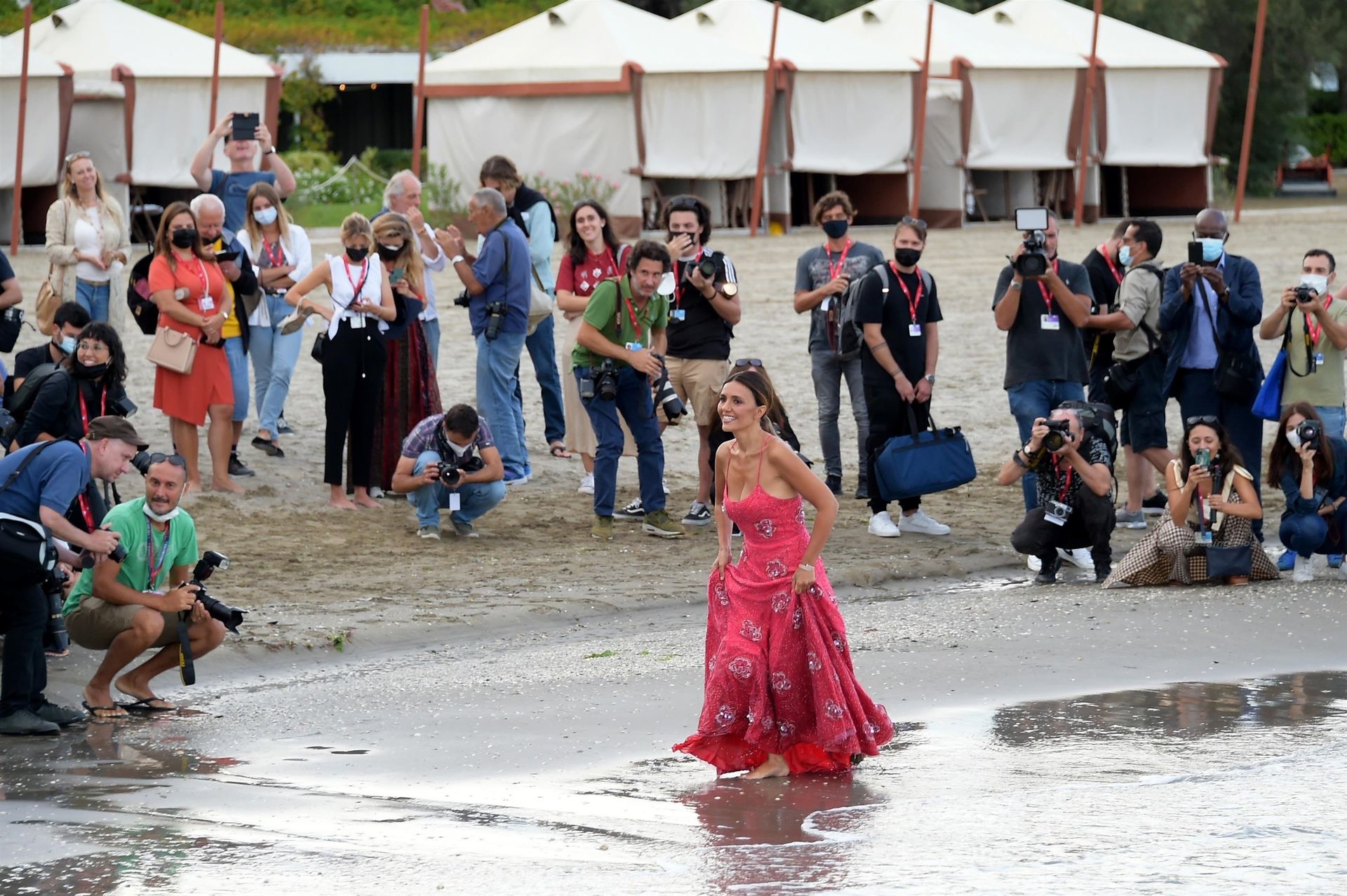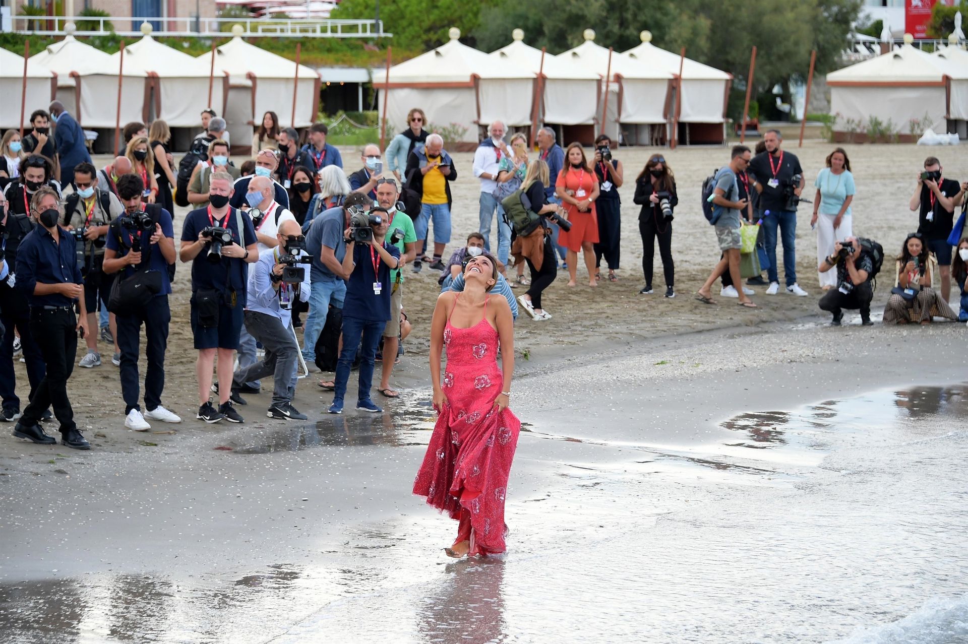 La actriz Serena Rossi, madrina del festival, posa para fotógrafos en la playa de Lido antes de la 78ª edición del Festival Internacional de Cine de Venecia en Venecia, Italia, 31/08/2021.