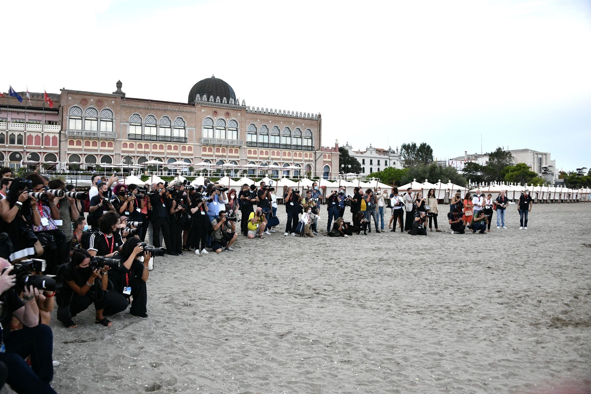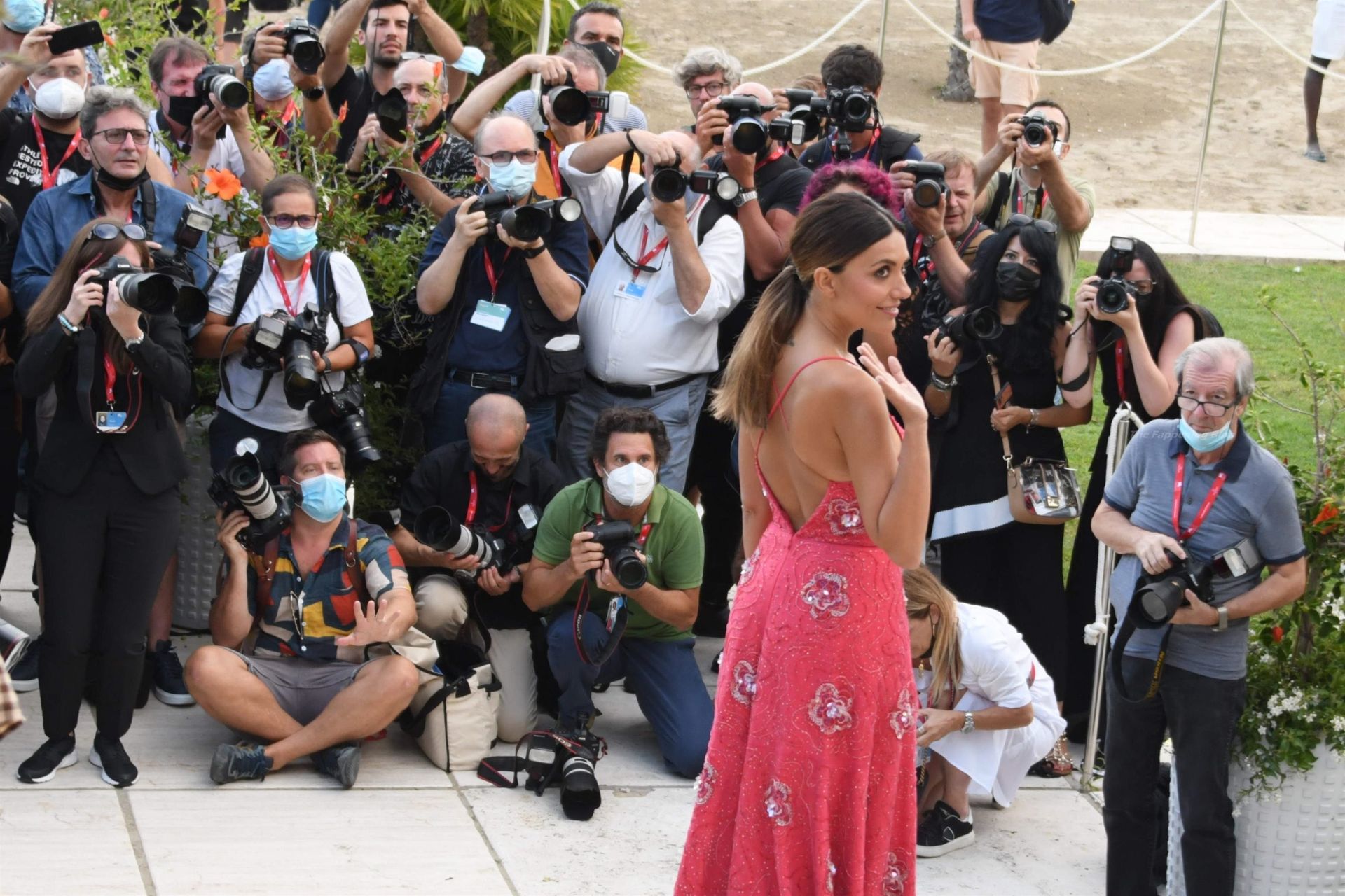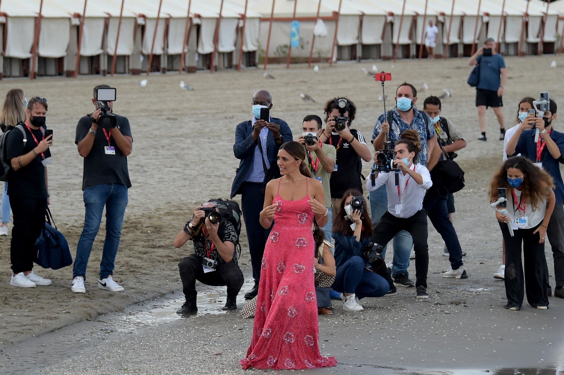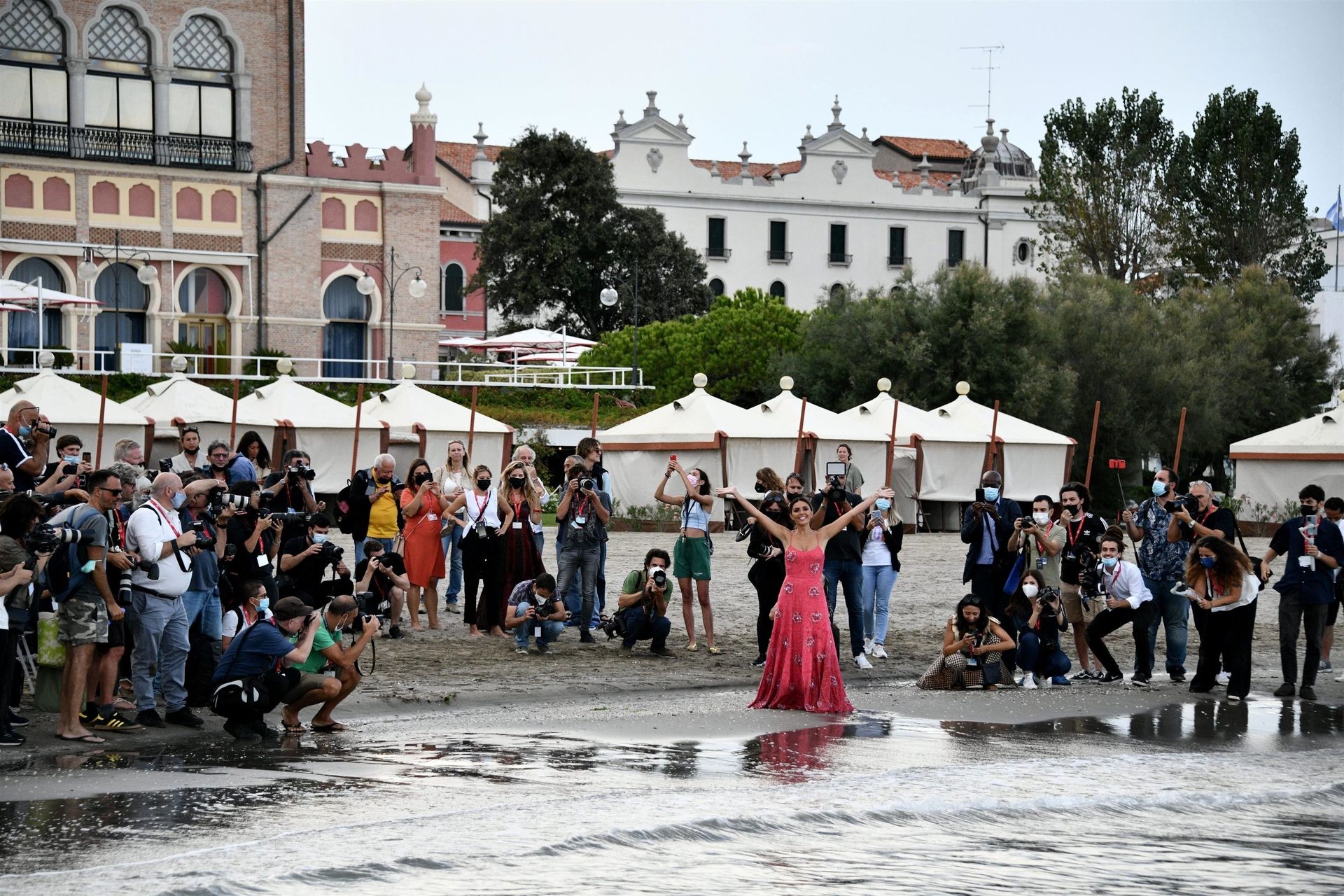 La actriz Serena Rossi, madrina del festival, posa para fotógrafos en la playa de Lido antes de la 78ª edición del Festival Internacional de Cine de Venecia en Venecia, Italia, 31/08/2021.
