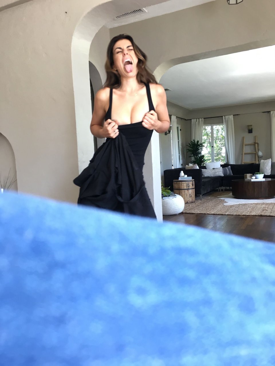 Ella se está agachando y nos muestra sus tetas, pero puede ser fácil pasarlo por alto con tantas fotos.