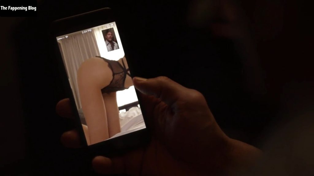 Serinda Swan está en lencería sexy mientras chatea por video con Dwayne Johnson acostada en una cama, mirando la pantalla de una laptop. Luego se inclina hacia atrás apoyándose en cuatro patas para mostrar más de su cuerpo al chico.