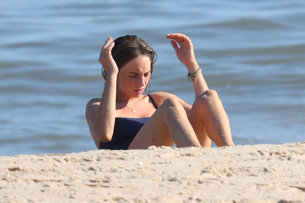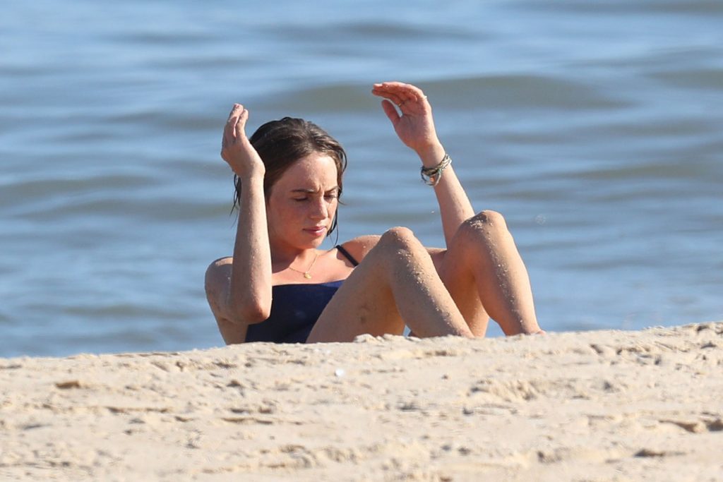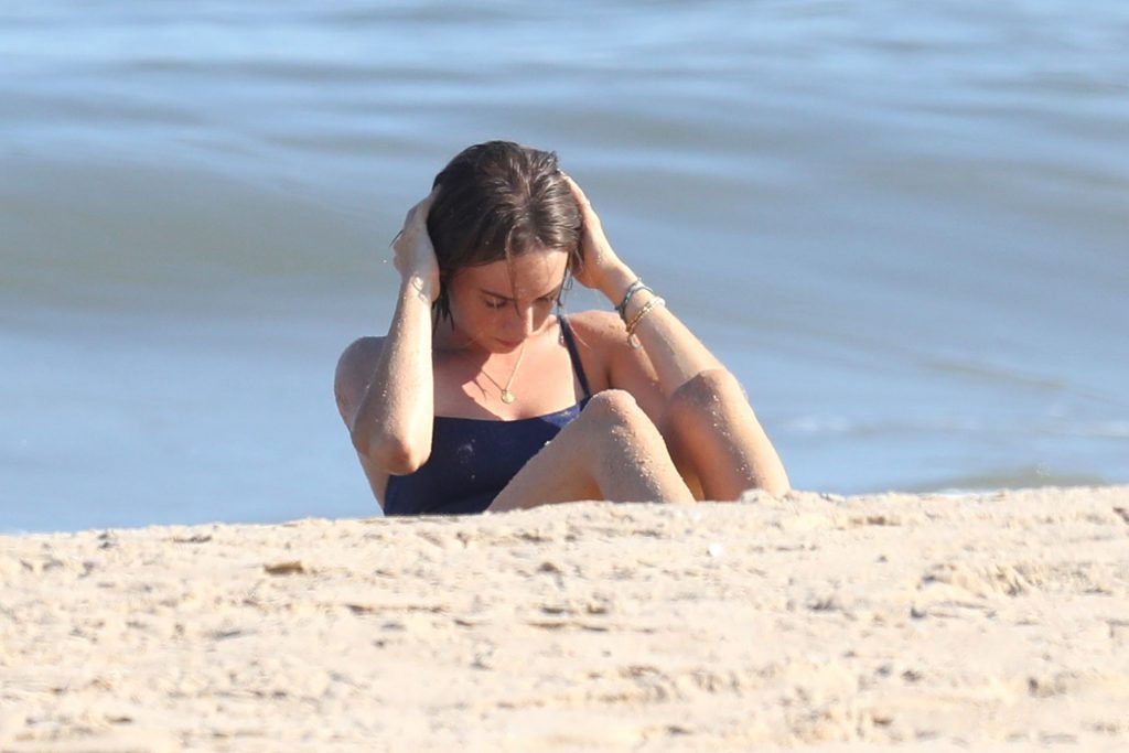 Hawke llevaba un traje de baño azul de una pieza y fue fotografiada haciendo abdominales y elevaciones de piernas frente al mar.