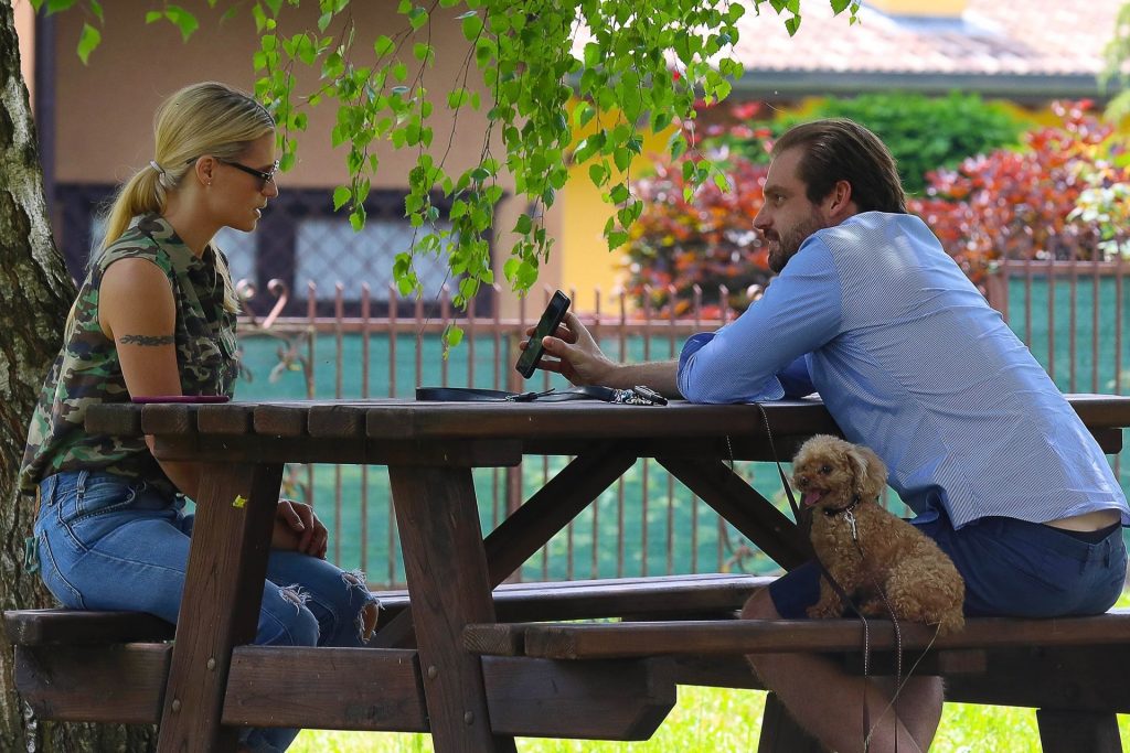 La voluptuosa actriz de televisión italo-suiza Michelle Hunziker, el empresario italiano Tomaso Trussardi, sus hijas Sole y Celeste y los perros juegan en el parque en Bérgamo, 02/06/2020.