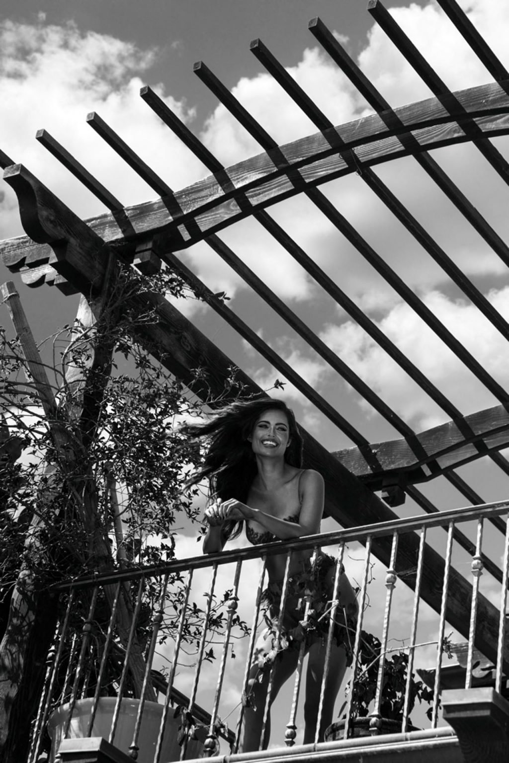 Renee posa en la ubicación de Malibu Hills. Inspirados en sesiones de moda de los años 80 y 90, los diseños incluyen encaje azul, ribetes de satén y herrajes dorados.