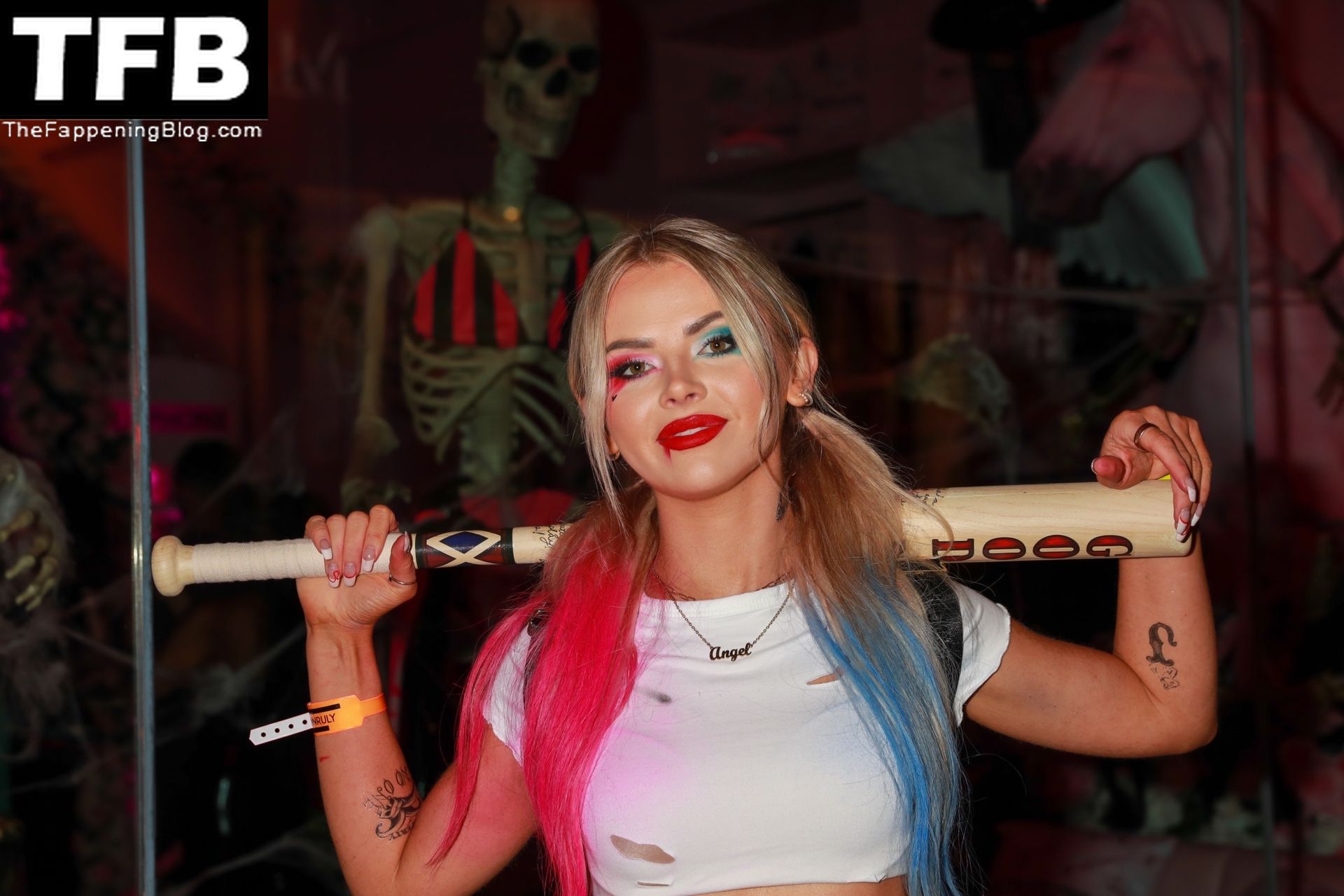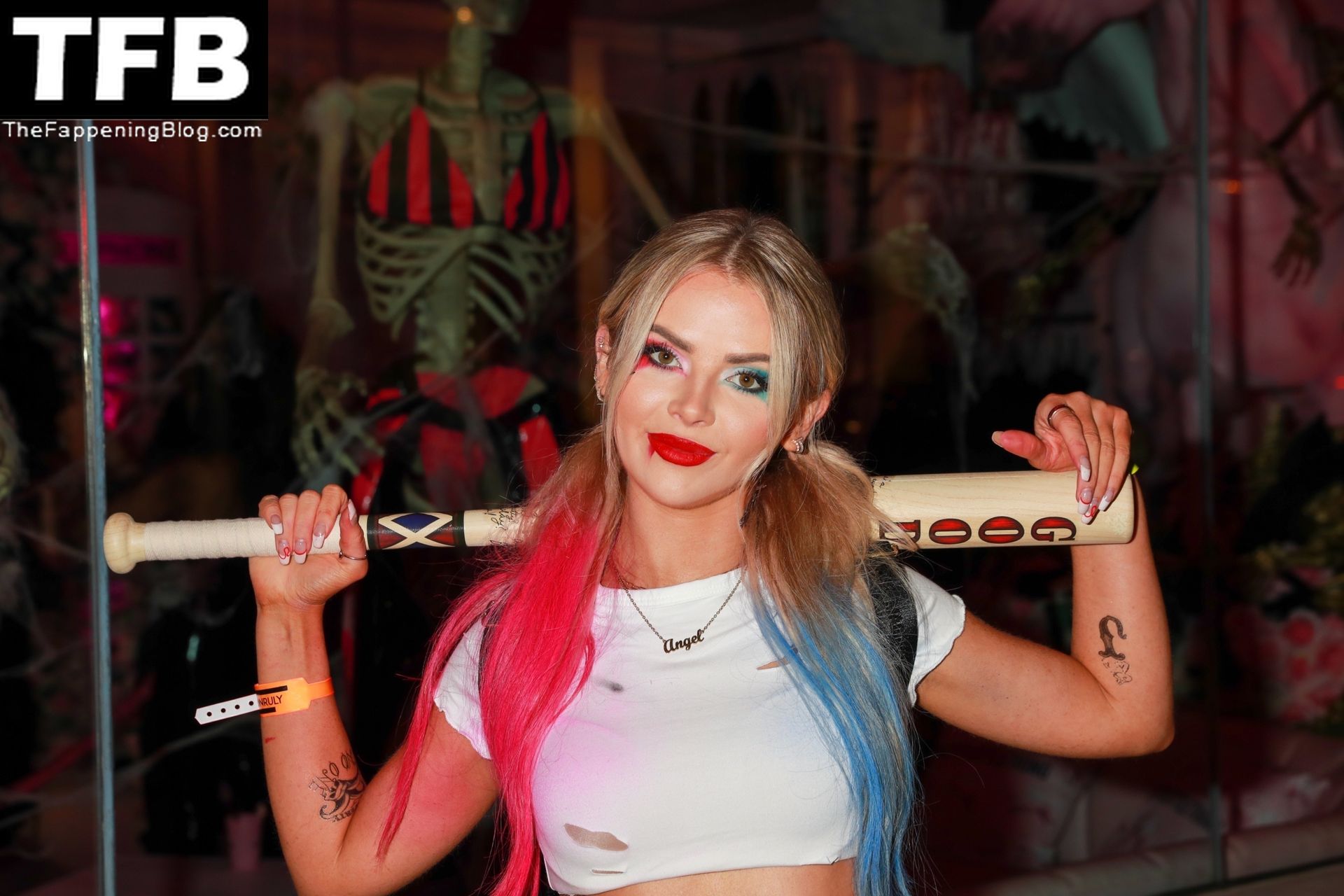 La actriz de FBOY Sarah Emig se divirtió en la fiesta de Halloween de PrettyLittleThings vestida como Harley Quinn, 30/10/2021.