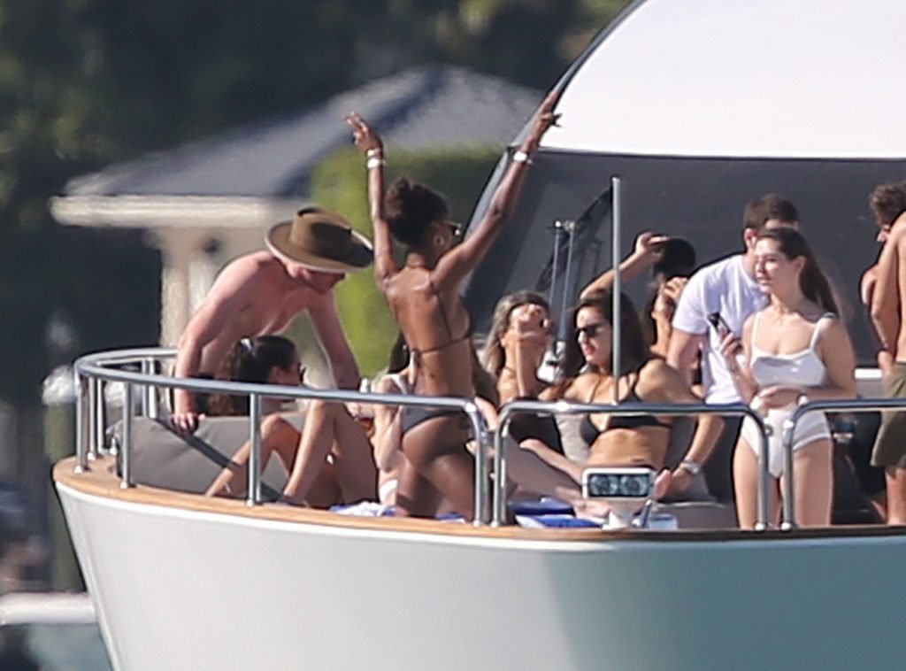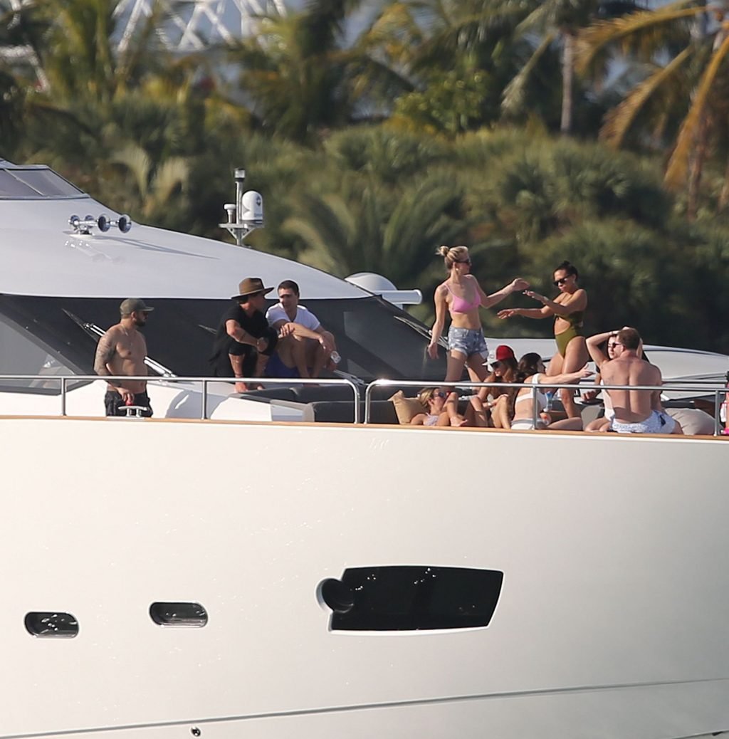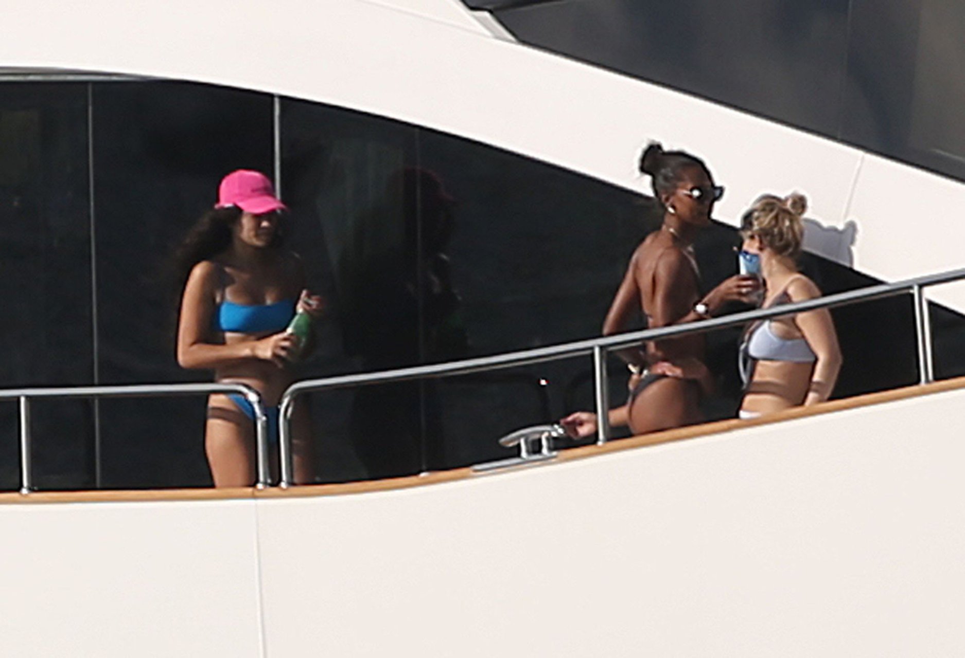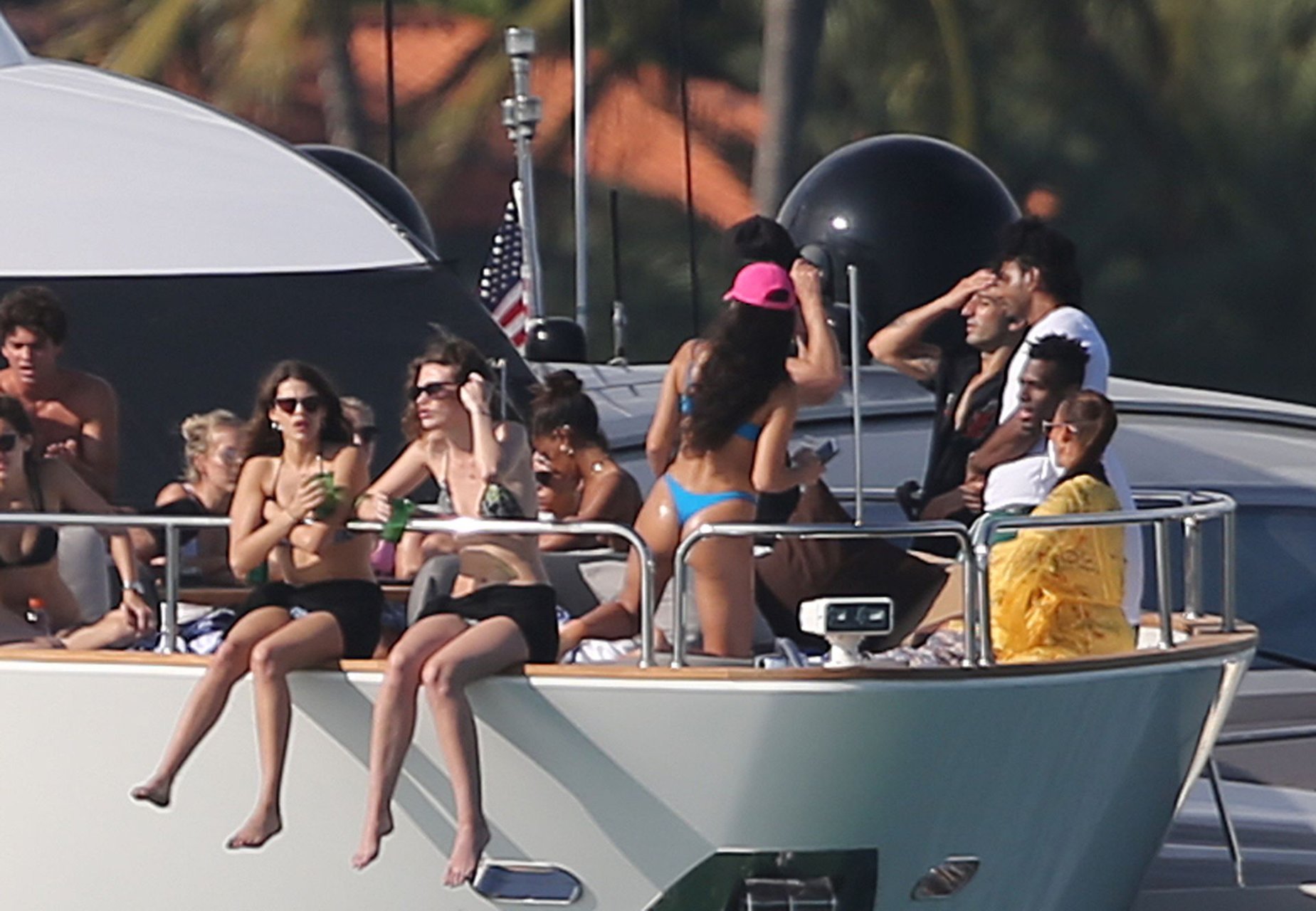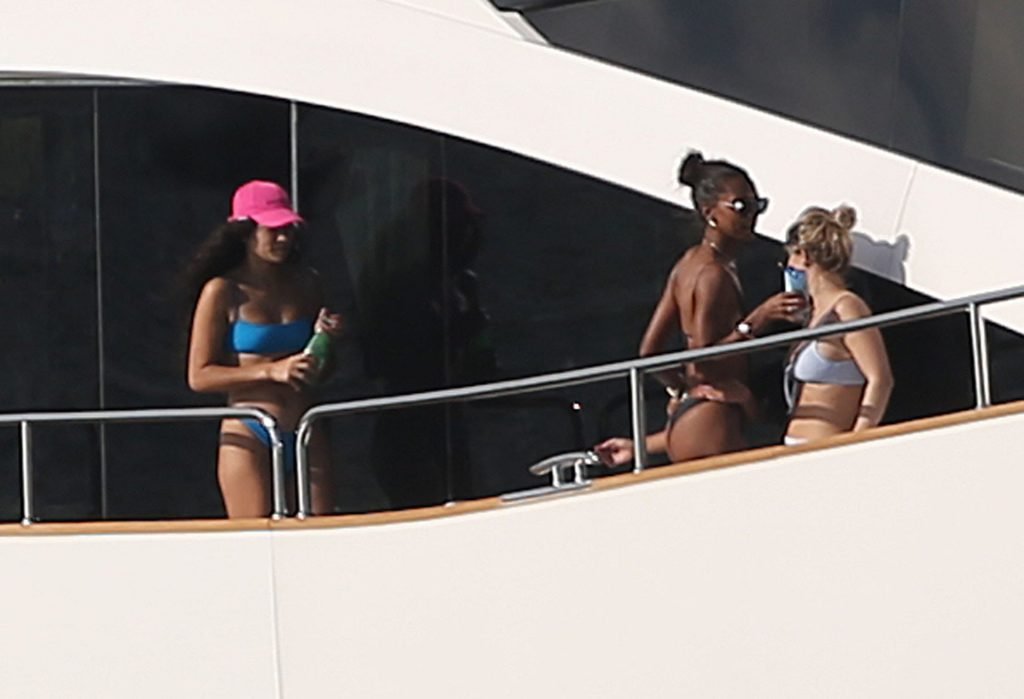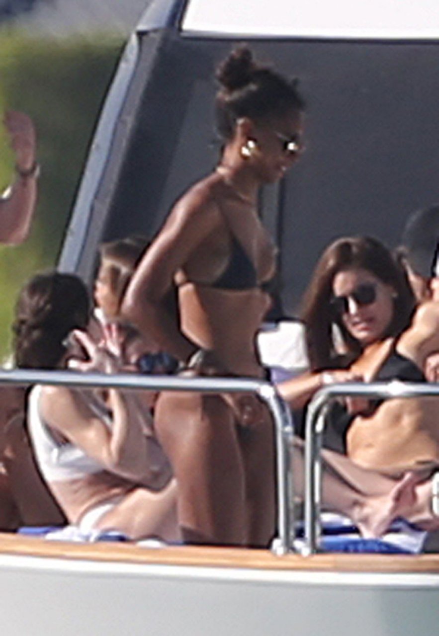Models Jasmine Tookes (en bikini negro) y Shanina Shaik (en bikini azul) celebran el cumpleaños de Jasmine en un yate en Miami, 01/02/2019.