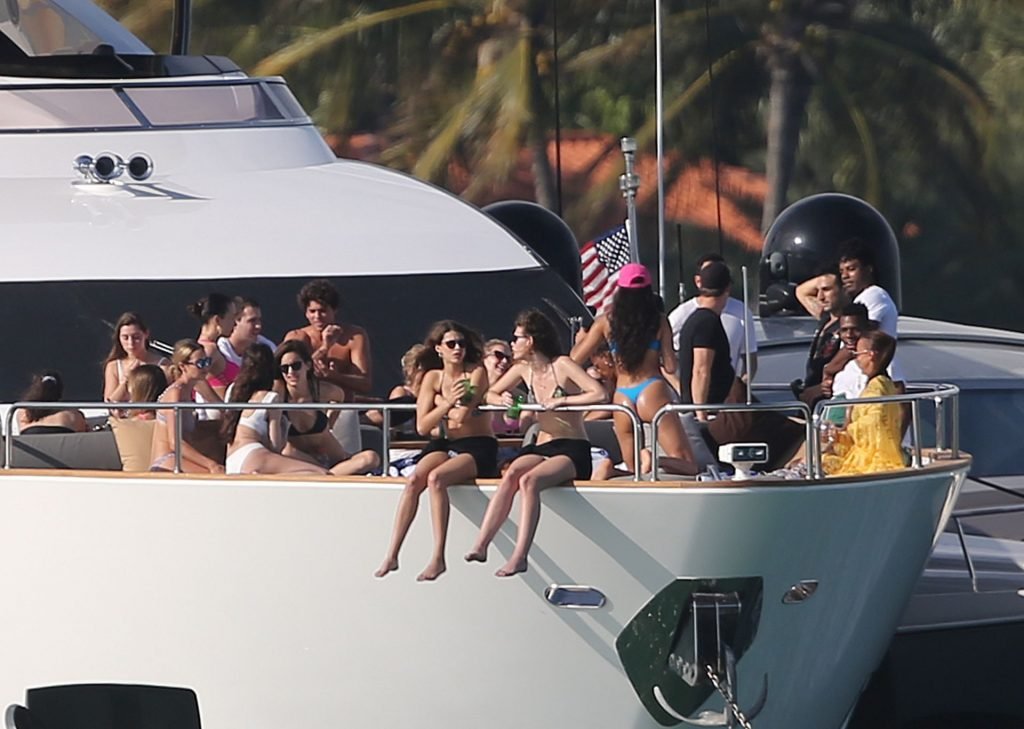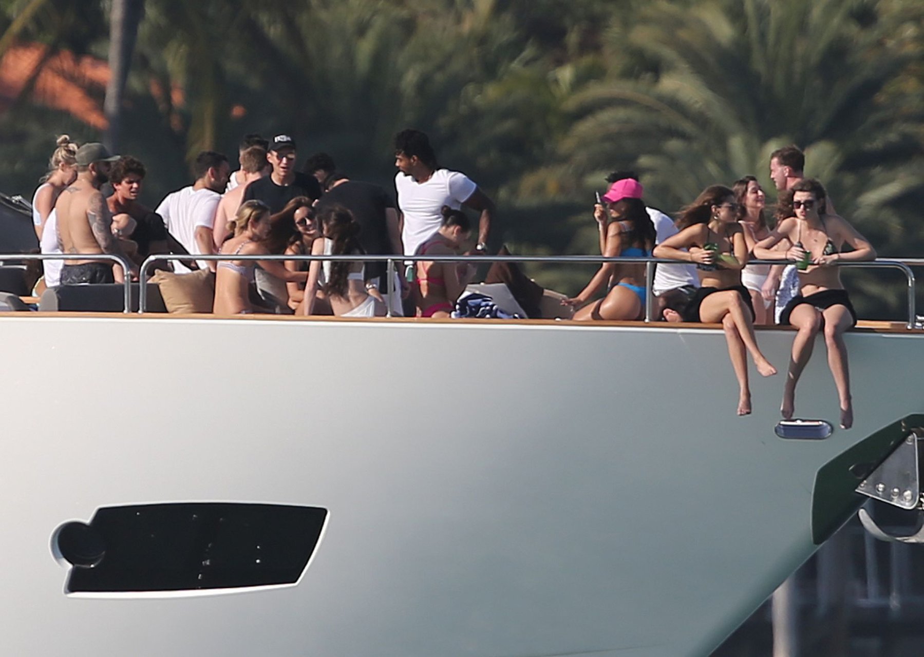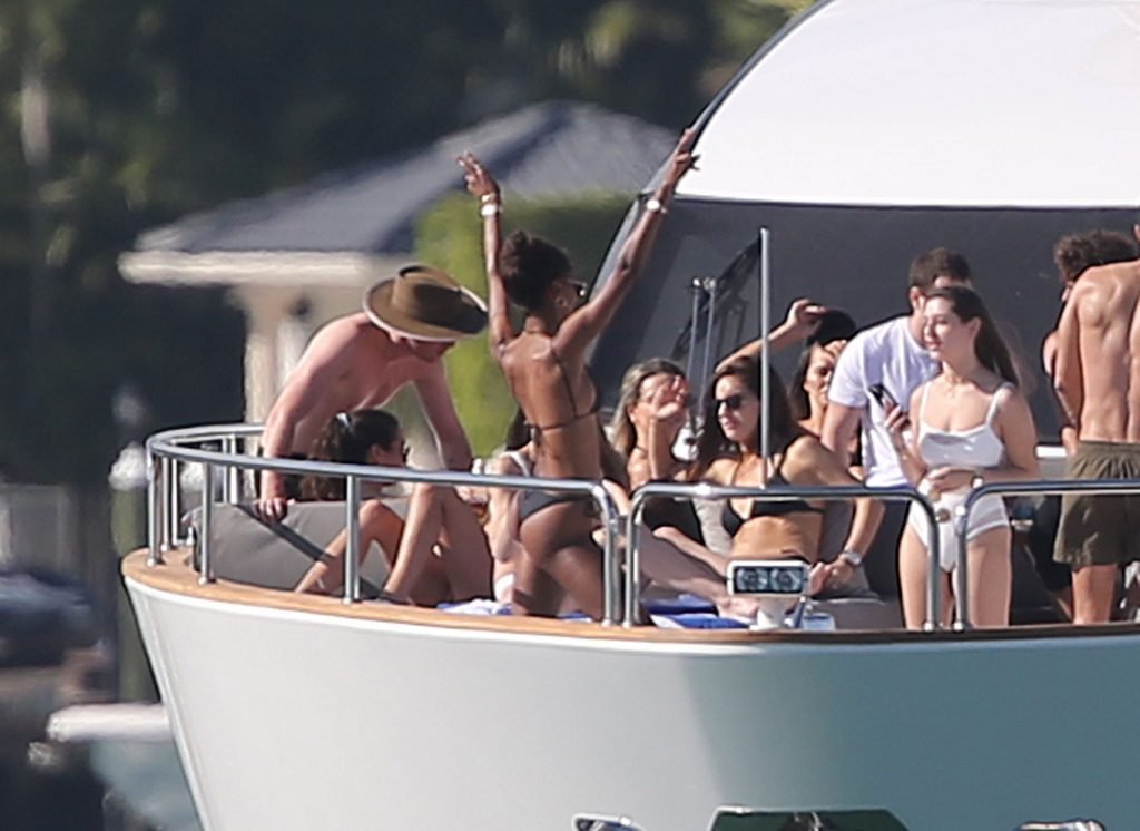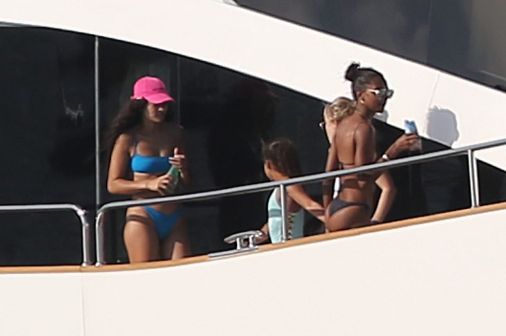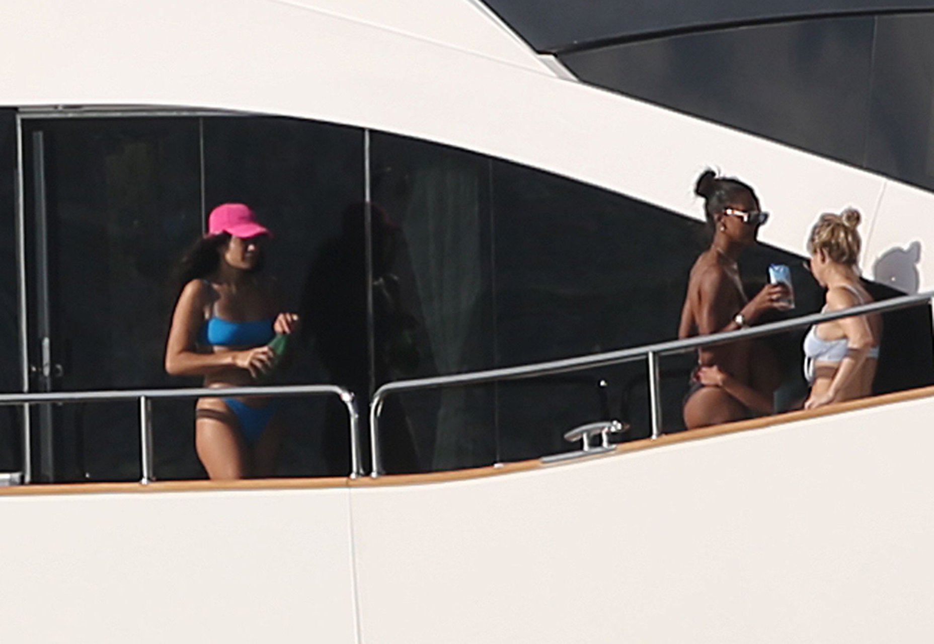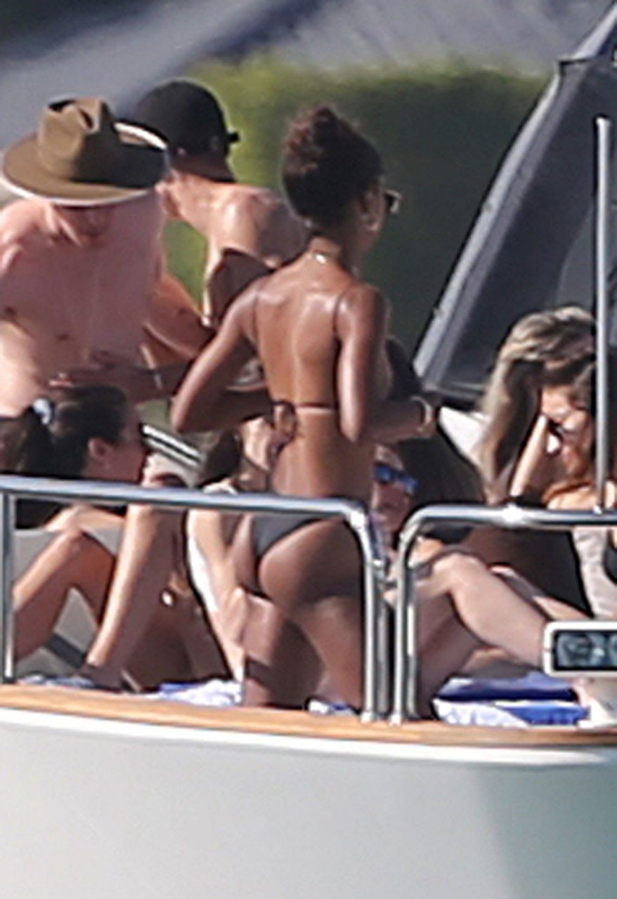 Models Jasmine Tookes (en bikini negro) y Shanina Shaik (en bikini azul) celebran el cumpleaños de Jasmine en un yate en Miami, 01/02/2019.