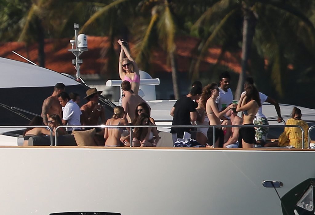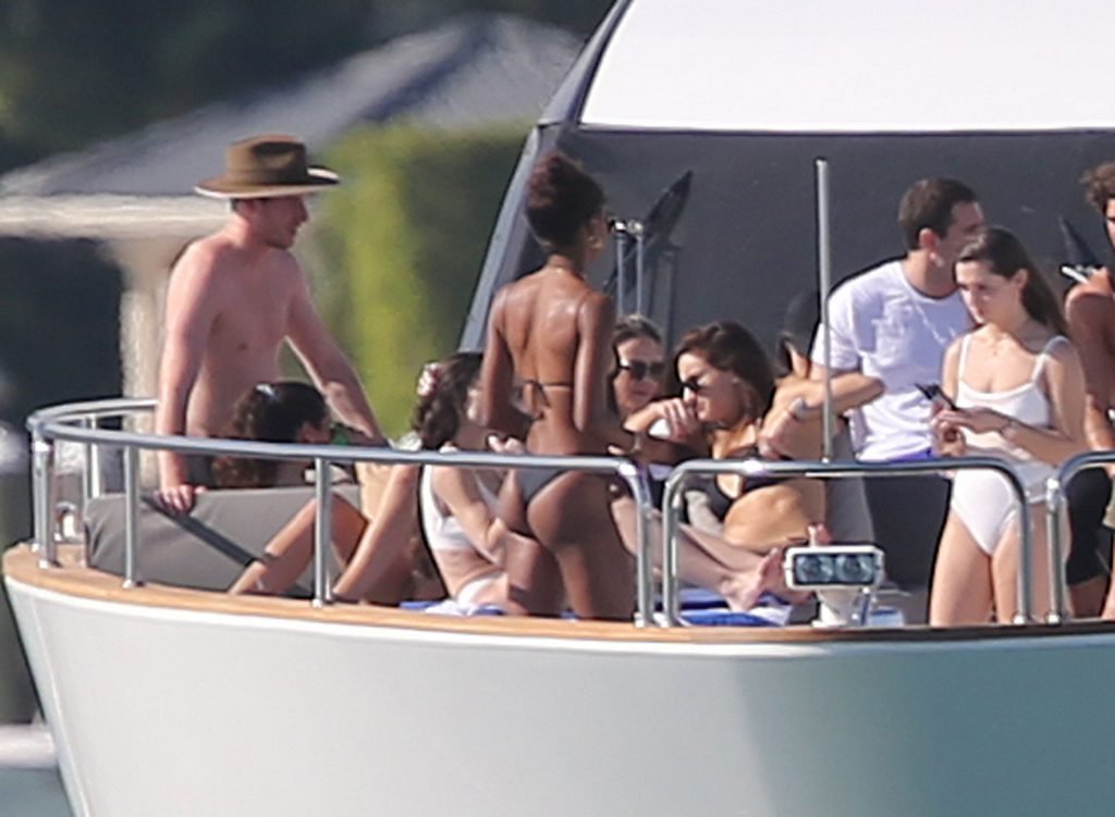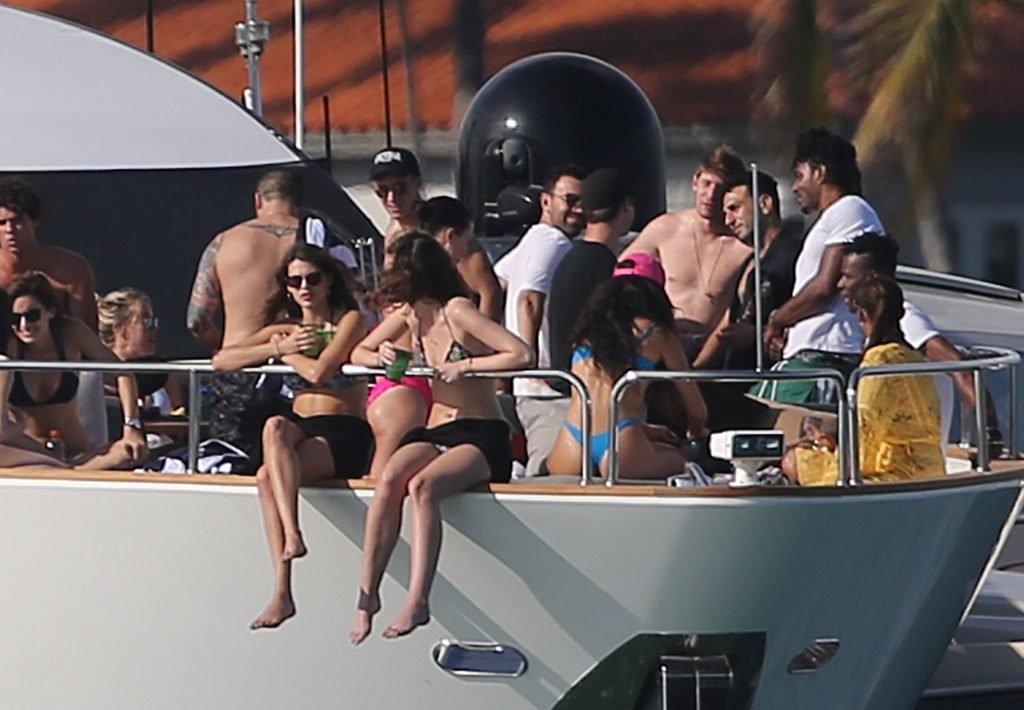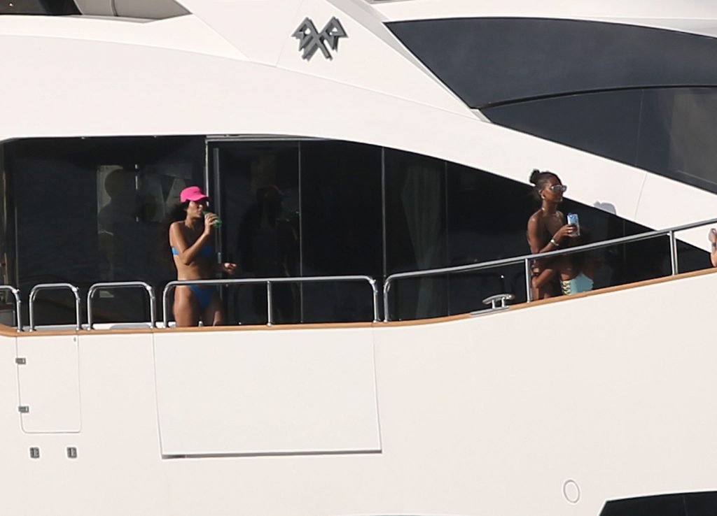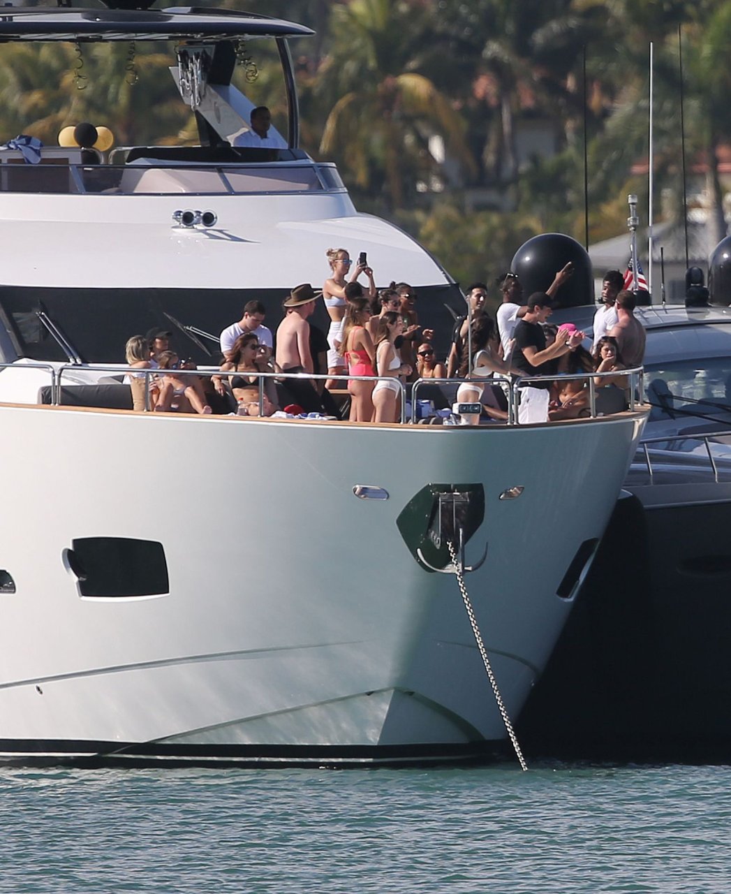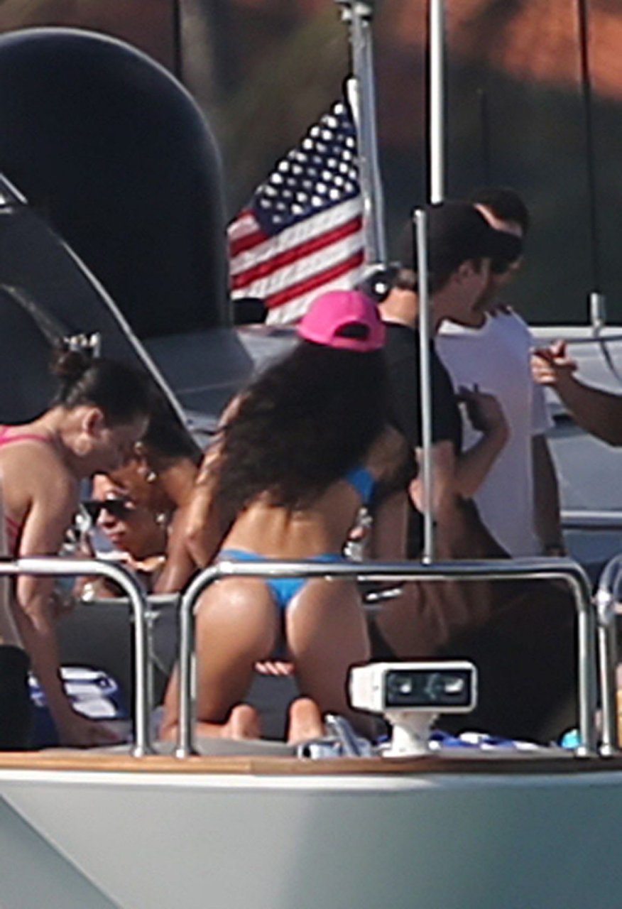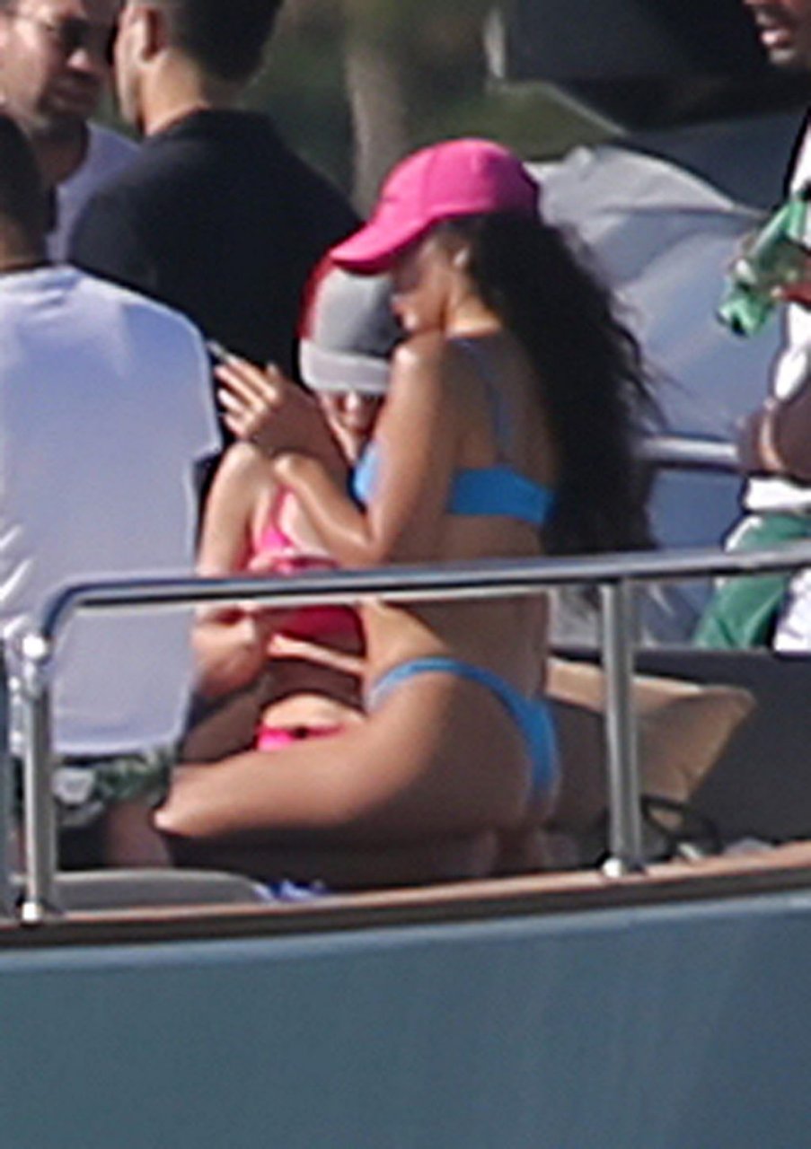 Models Jasmine Tookes (en bikini negro) y Shanina Shaik (en bikini azul) celebran el cumpleaños de Jasmine en un yate en Miami, 01/02/2019.