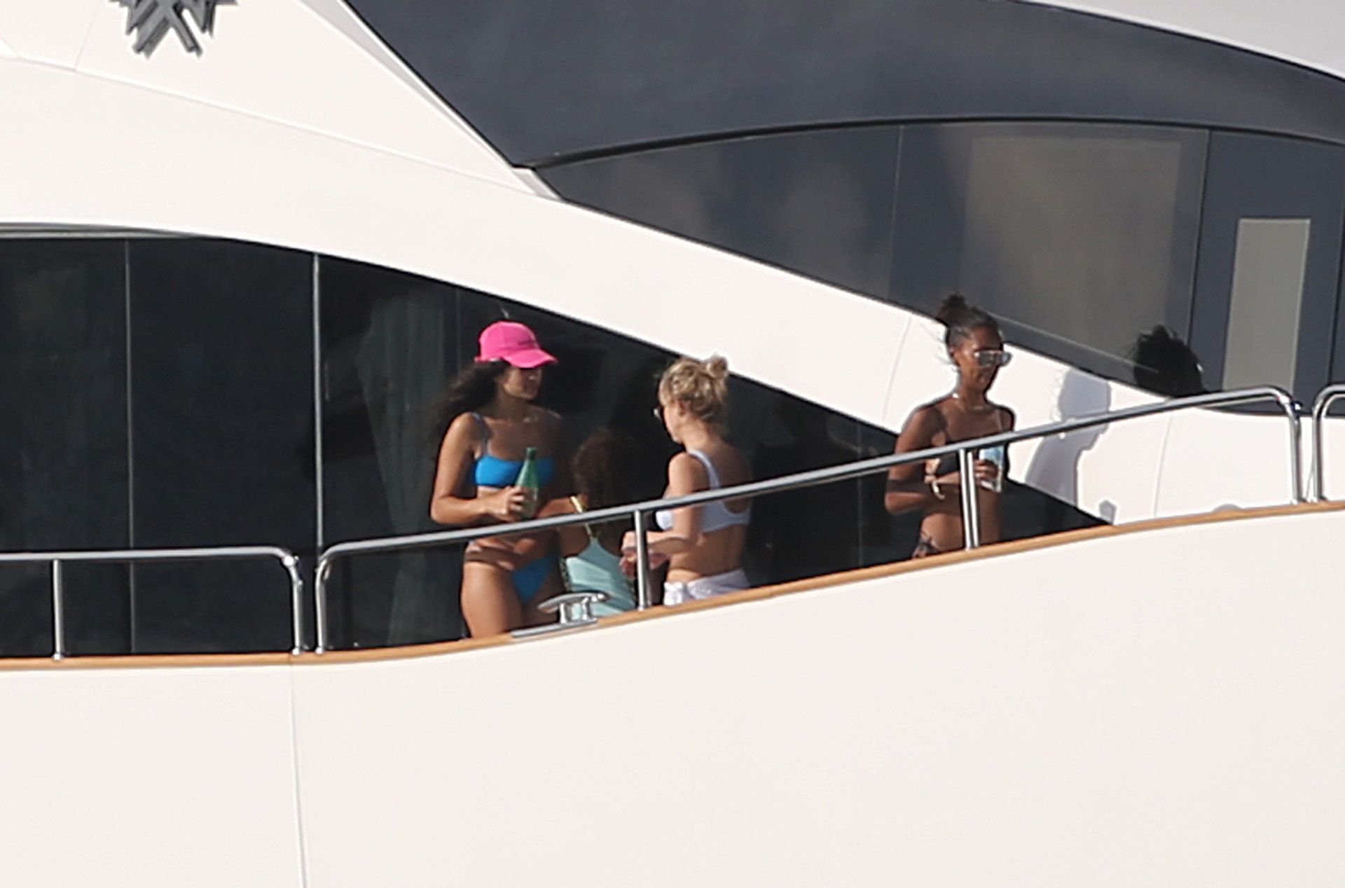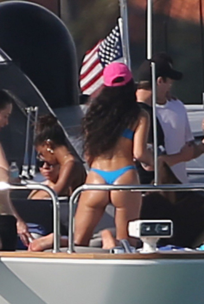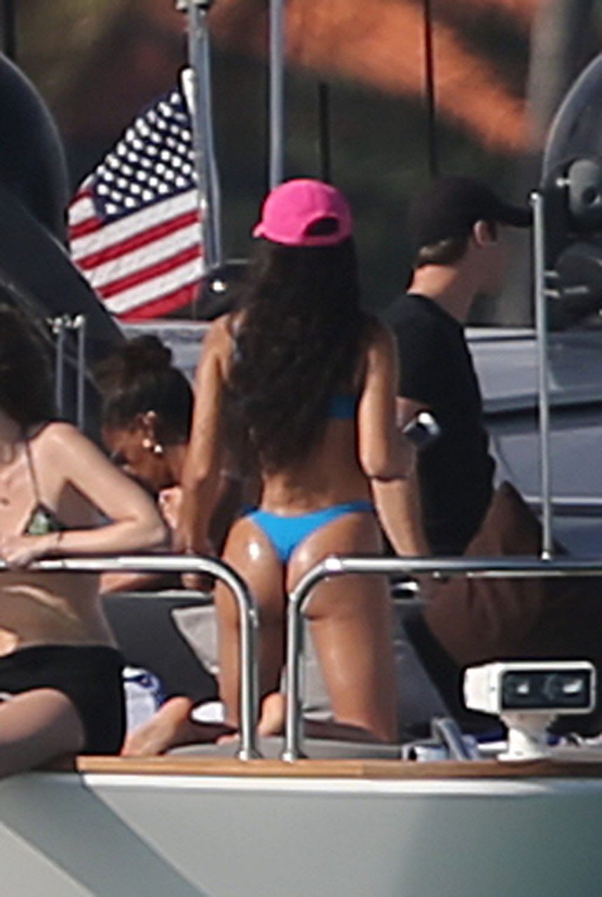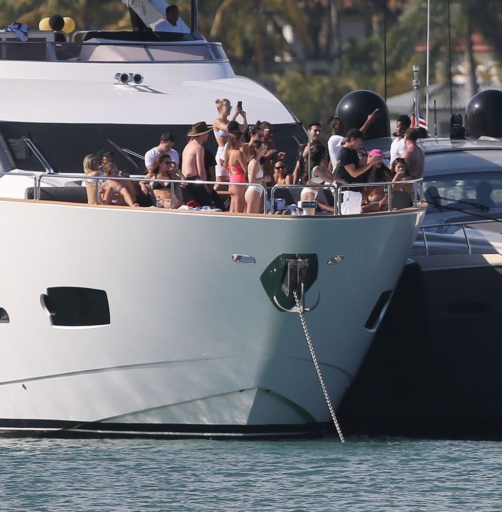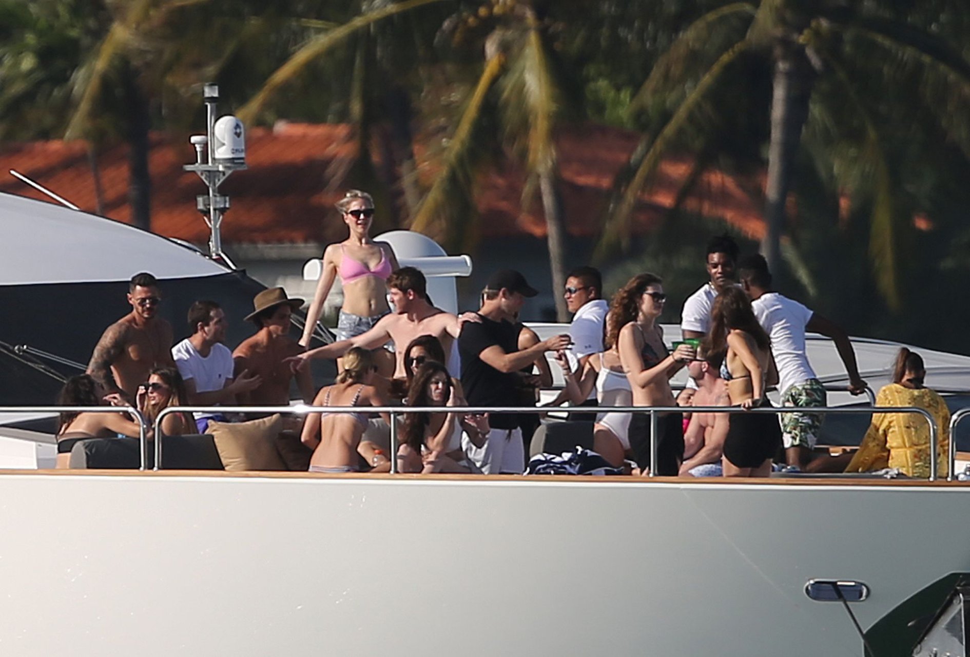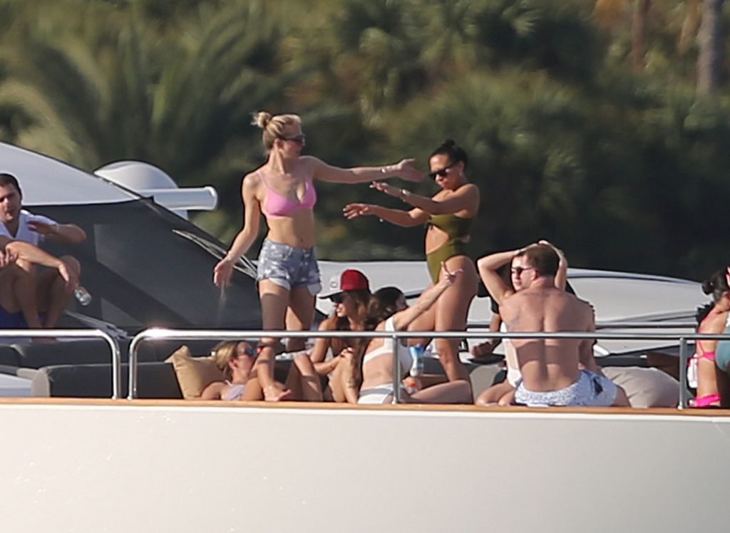 Models Jasmine Tookes (en bikini negro) y Shanina Shaik (en bikini azul) celebran el cumpleaños de Jasmine en un yate en Miami, 01/02/2019.