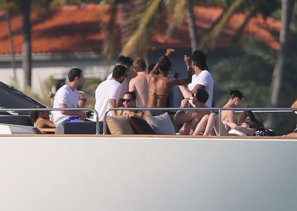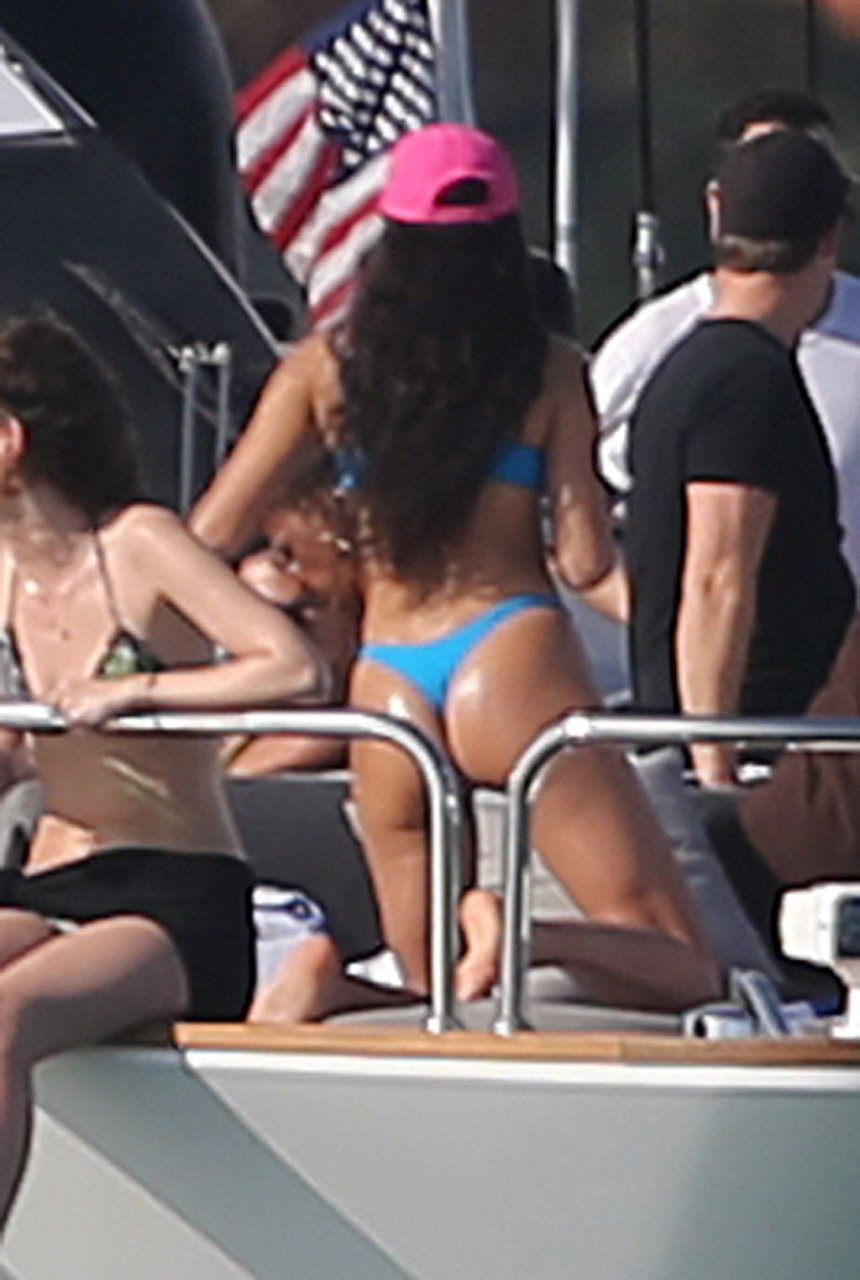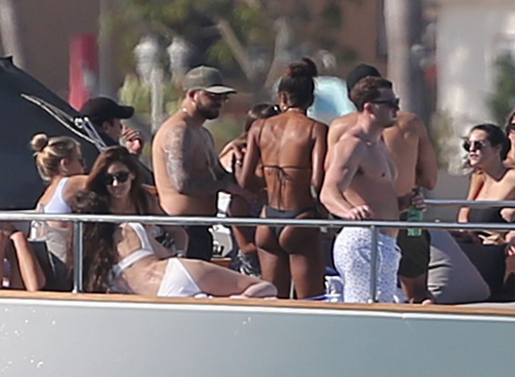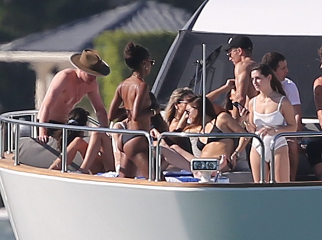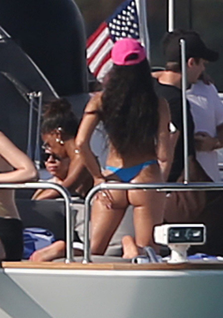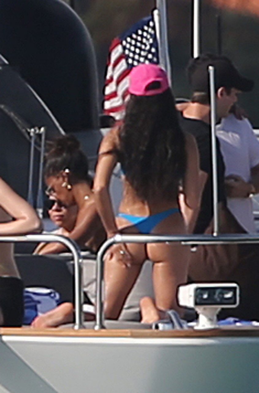 Models Jasmine Tookes (en bikini negro) y Shanina Shaik (en bikini azul) celebran el cumpleaños de Jasmine en un yate en Miami, 01/02/2019.