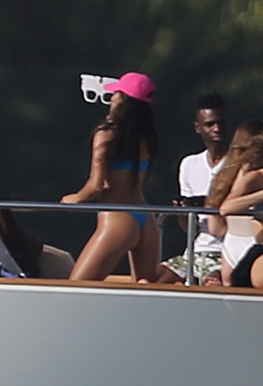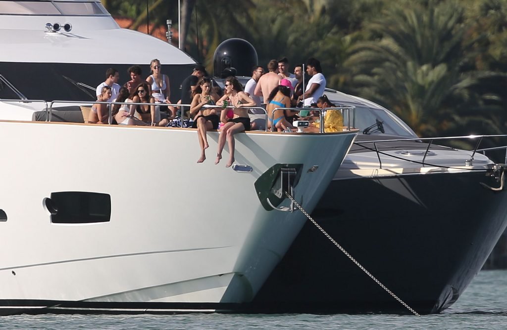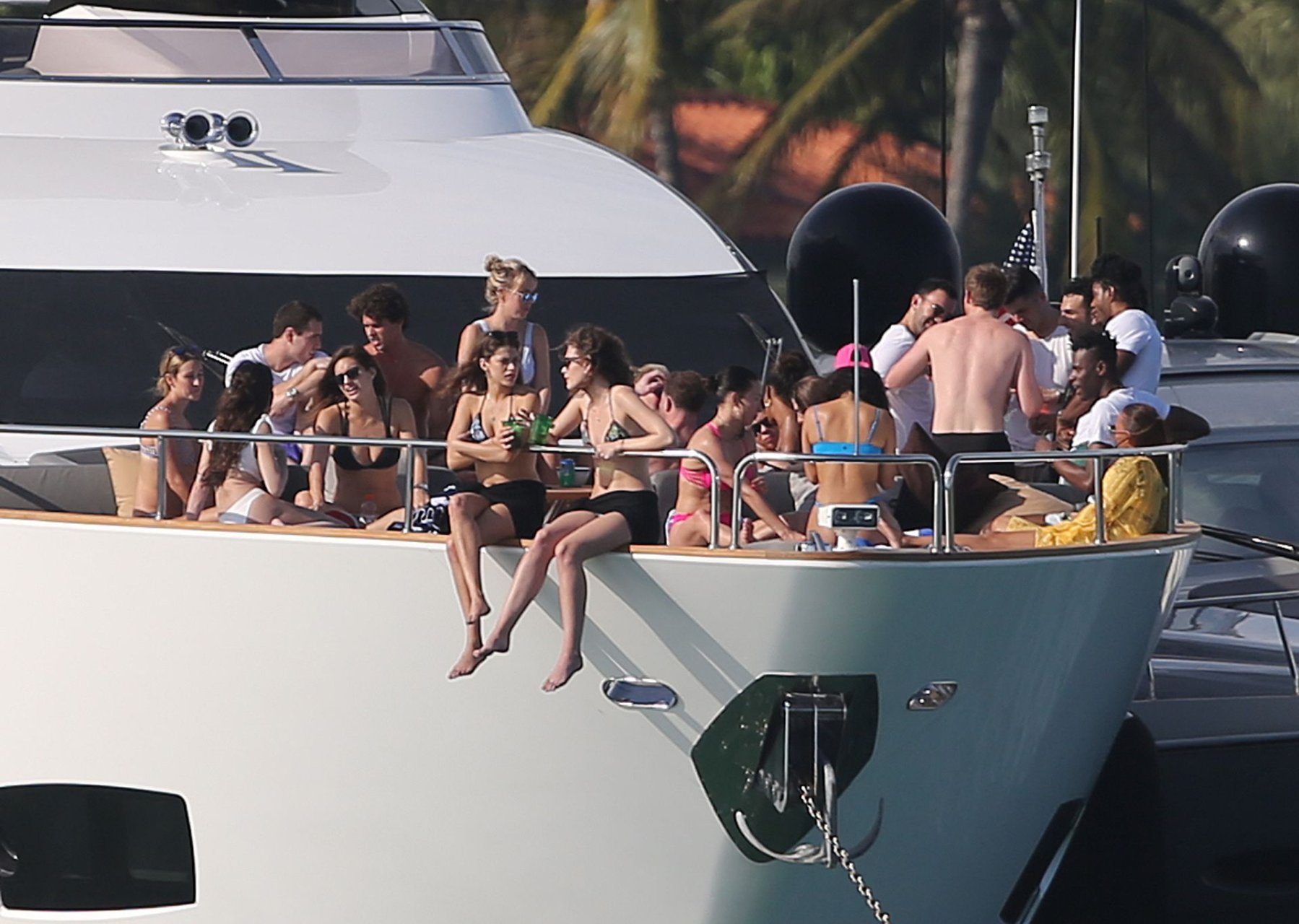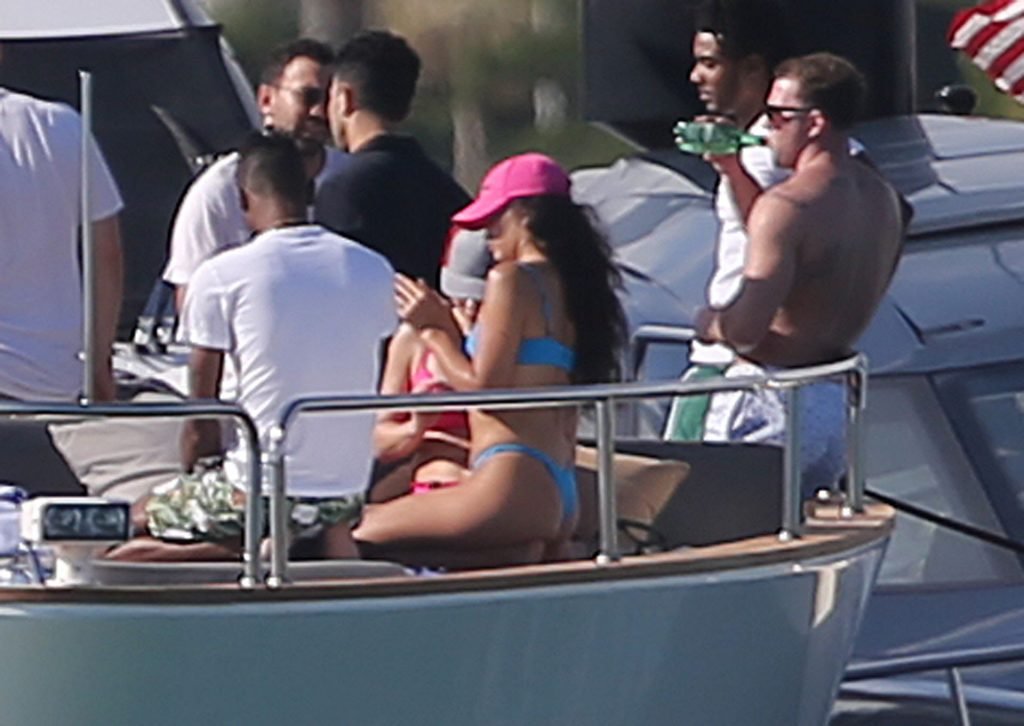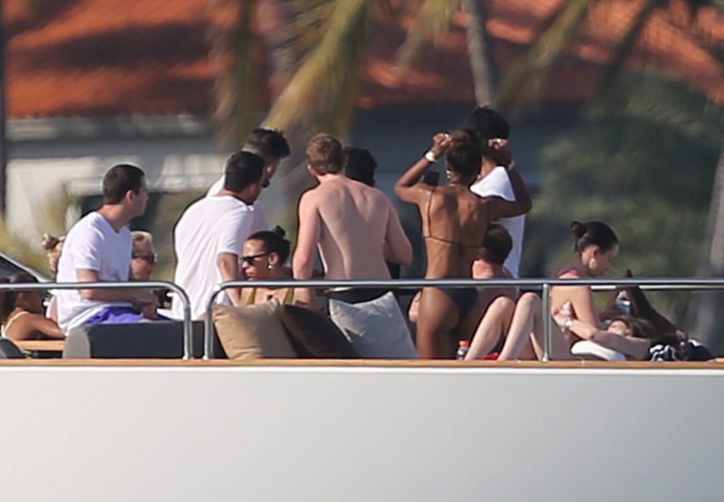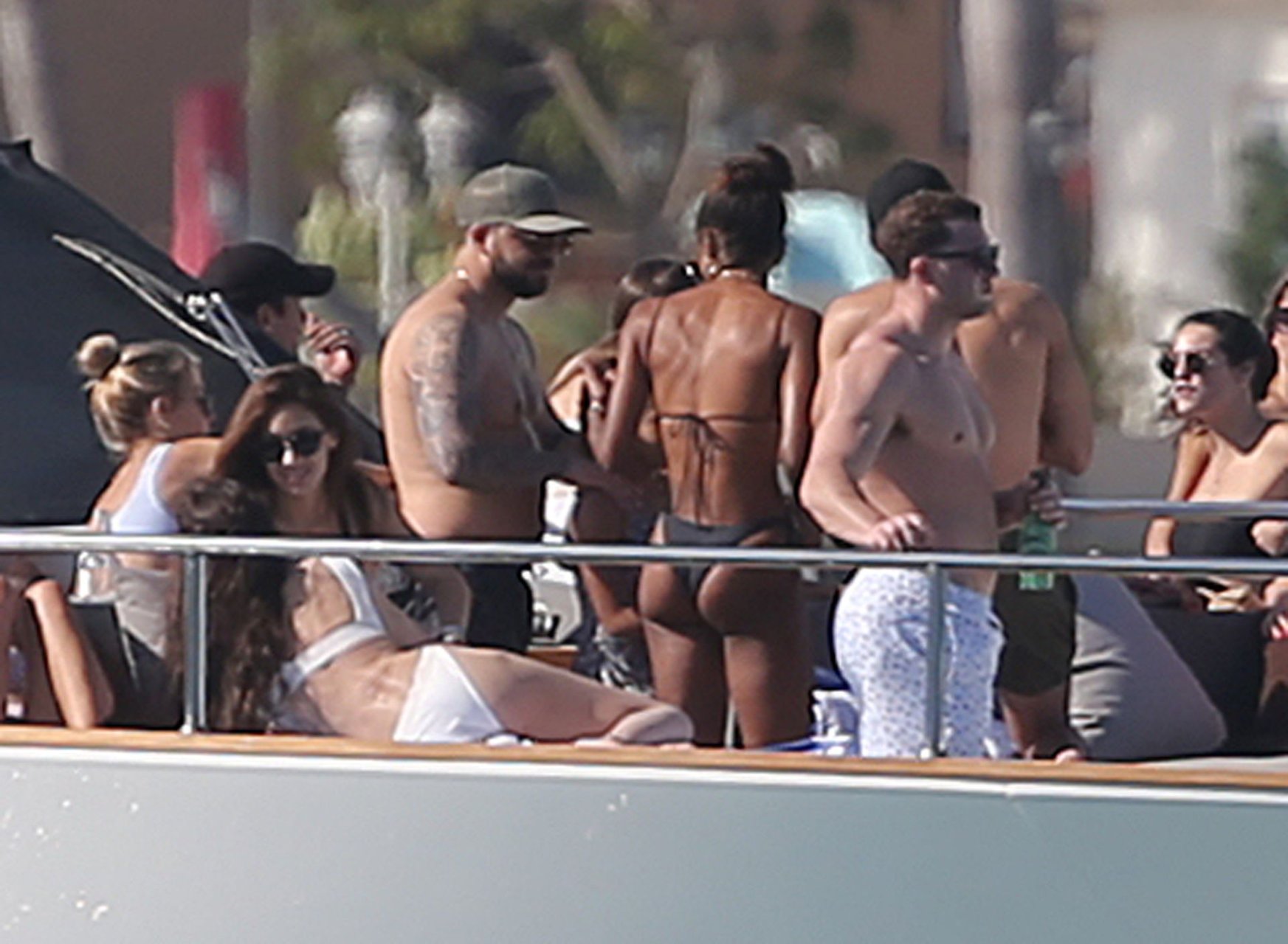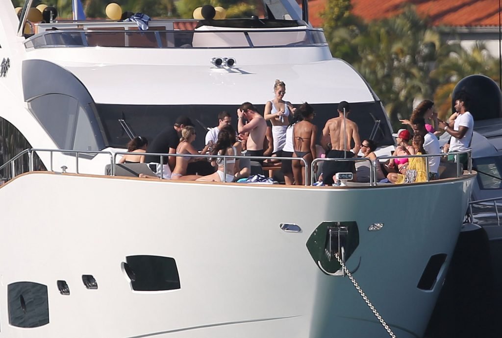 Models Jasmine Tookes (en bikini negro) y Shanina Shaik (en bikini azul) celebran el cumpleaños de Jasmine en un yate en Miami, 01/02/2019.
