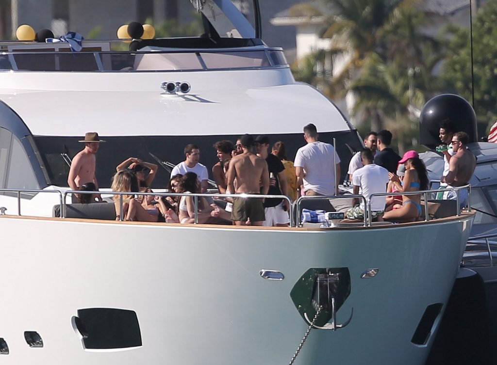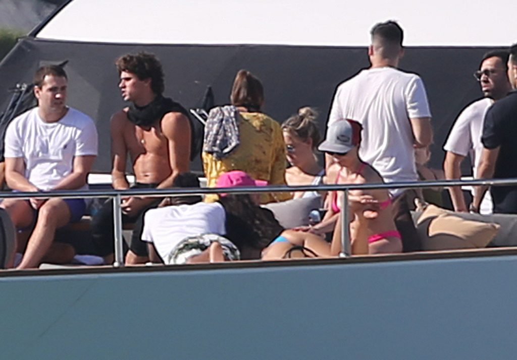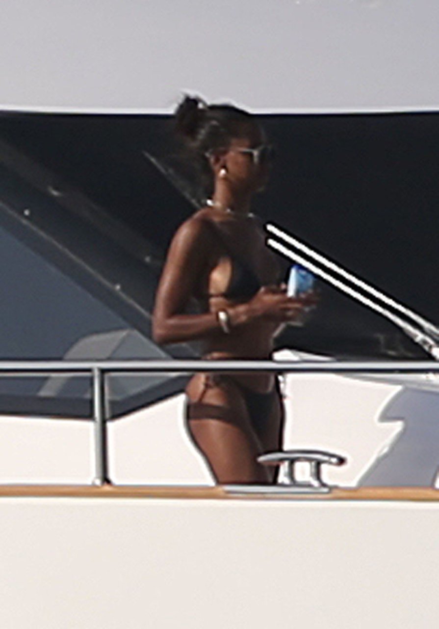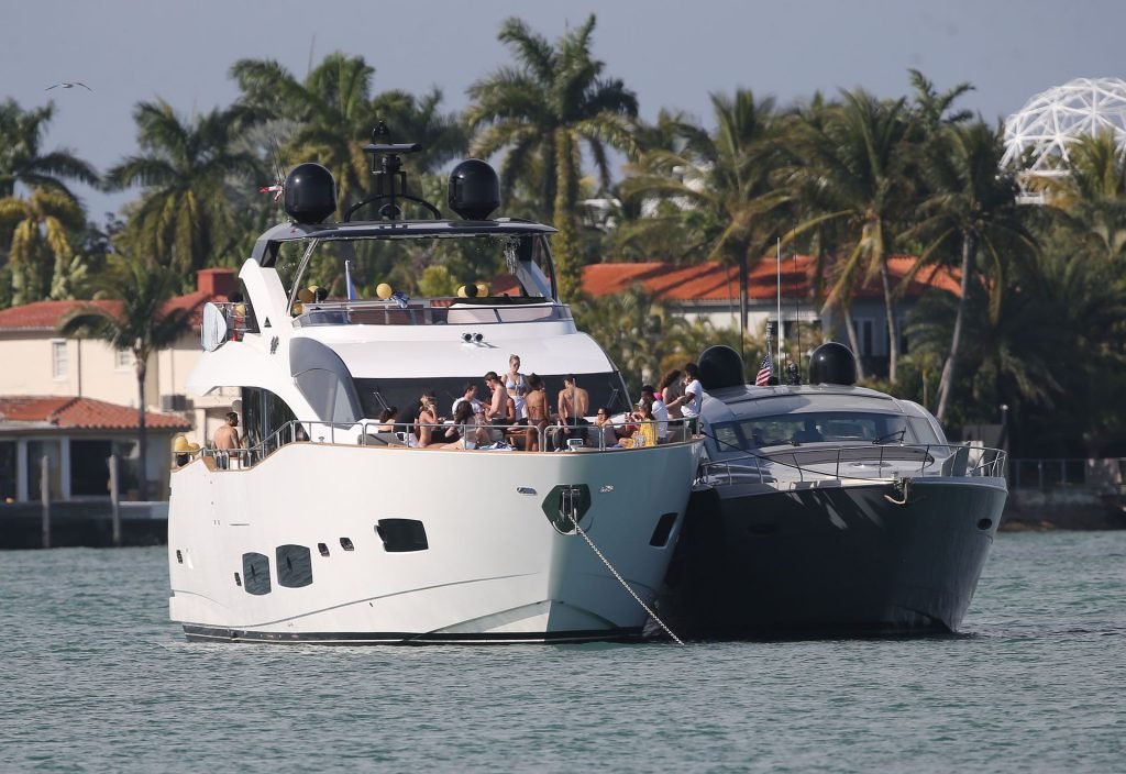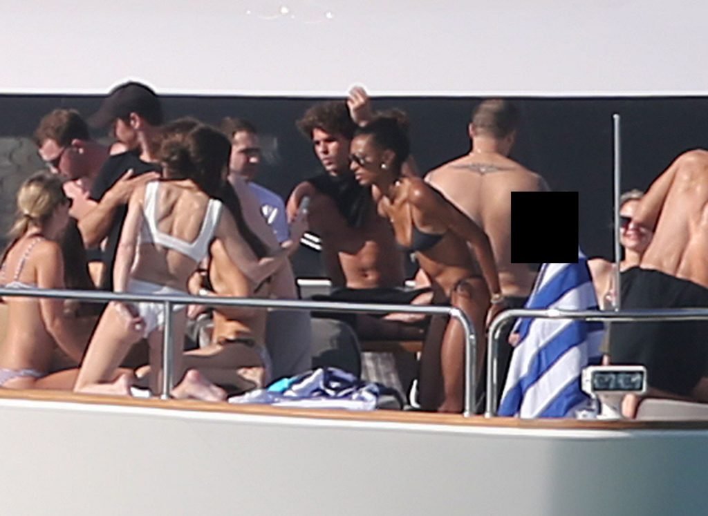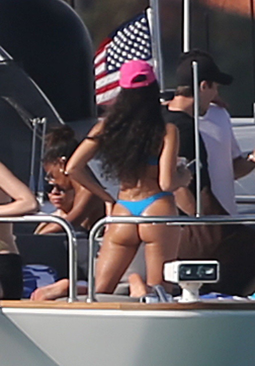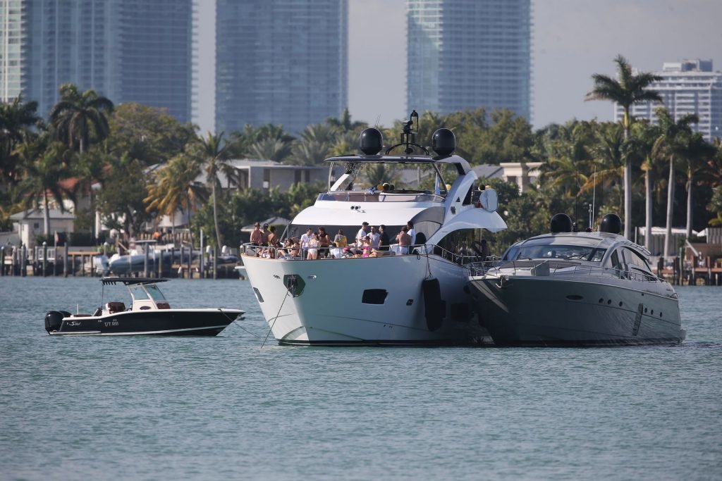 Models Jasmine Tookes (en bikini negro) y Shanina Shaik (en bikini azul) celebran el cumpleaños de Jasmine en un yate en Miami, 01/02/2019.