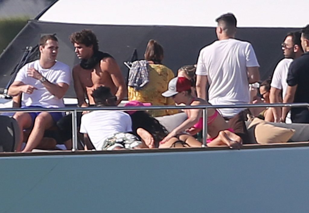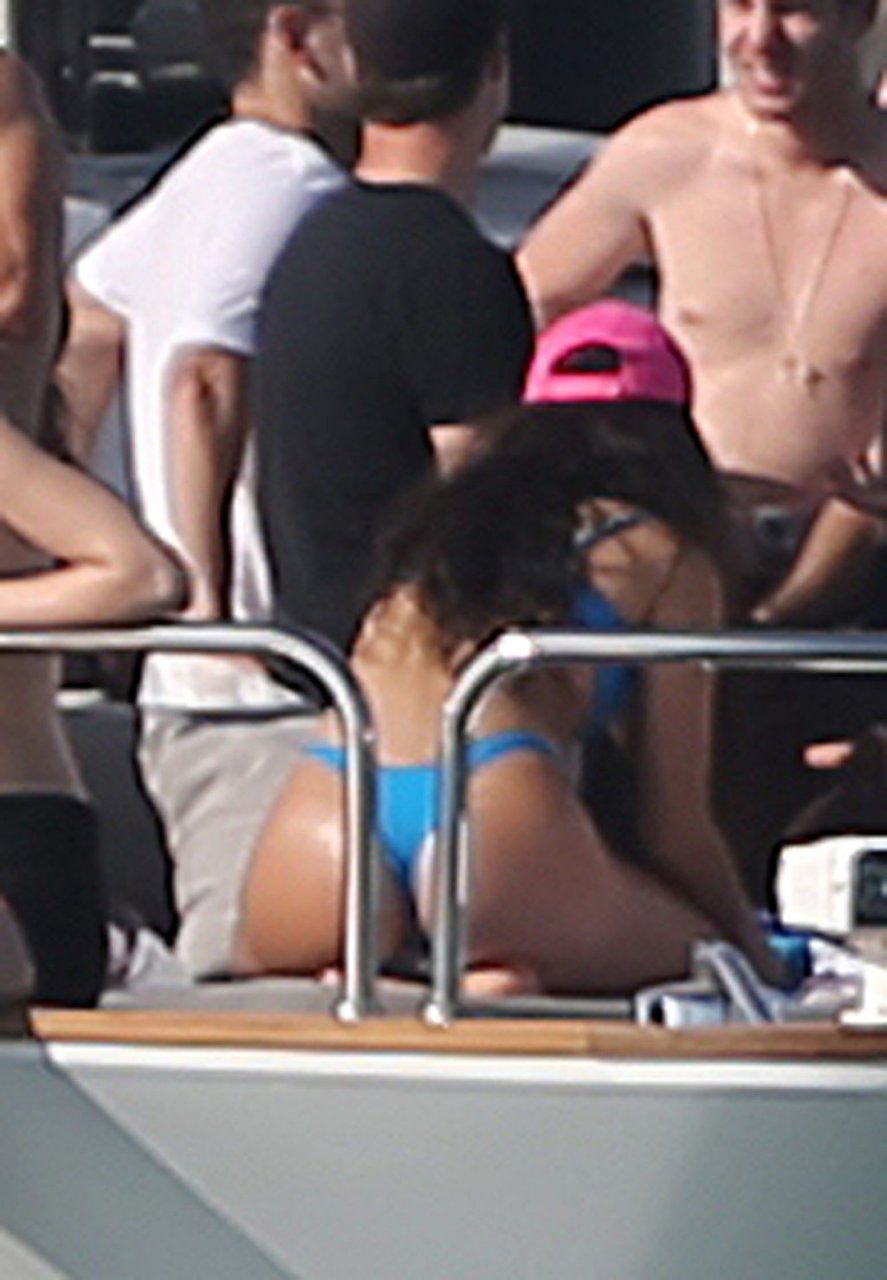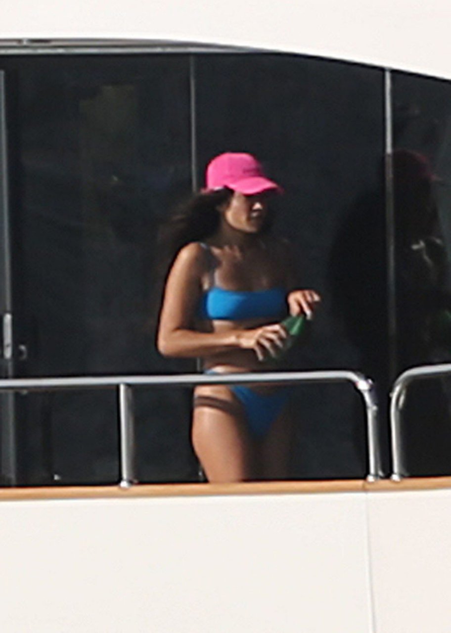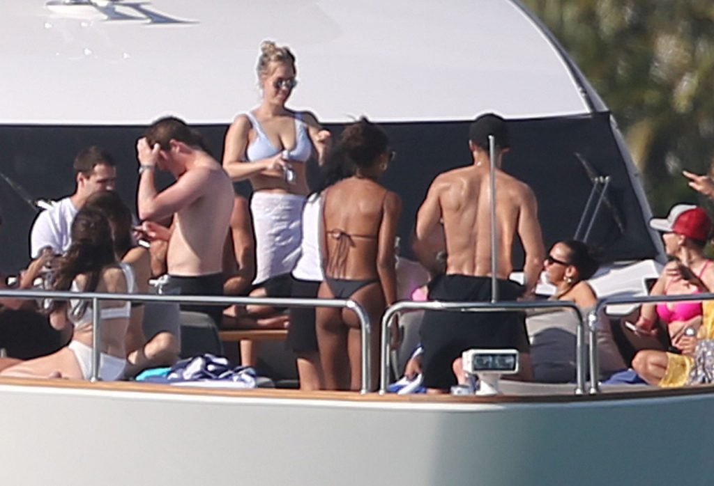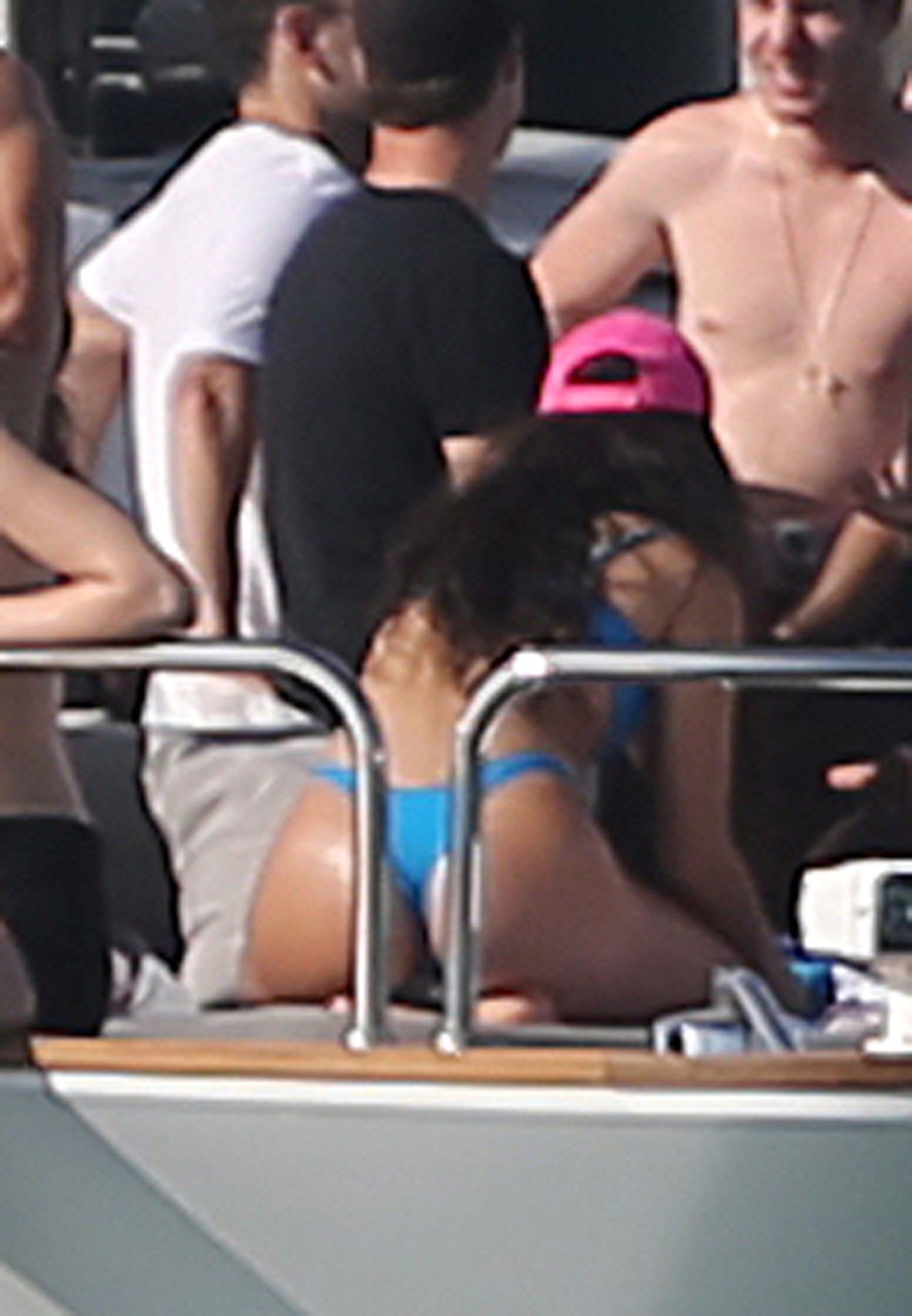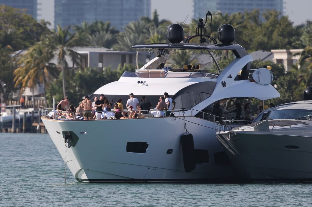 Models Jasmine Tookes (en bikini negro) y Shanina Shaik (en bikini azul) celebran el cumpleaños de Jasmine en un yate en Miami, 01/02/2019.