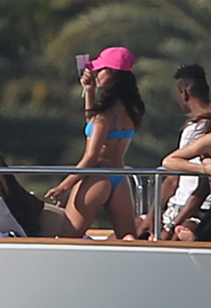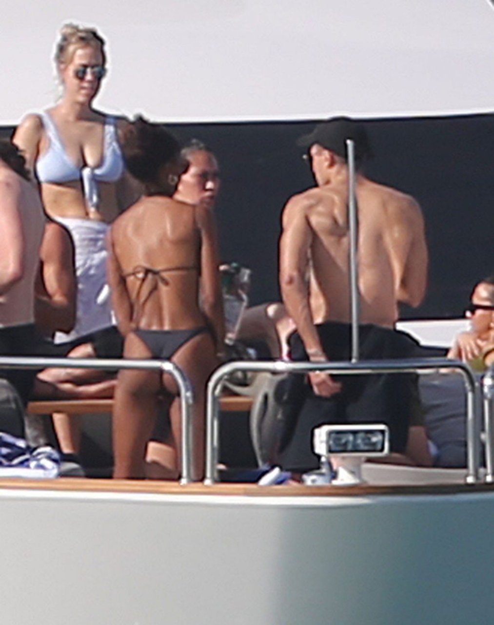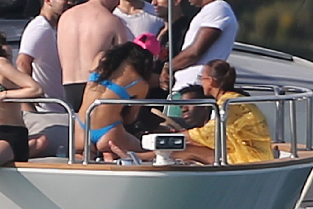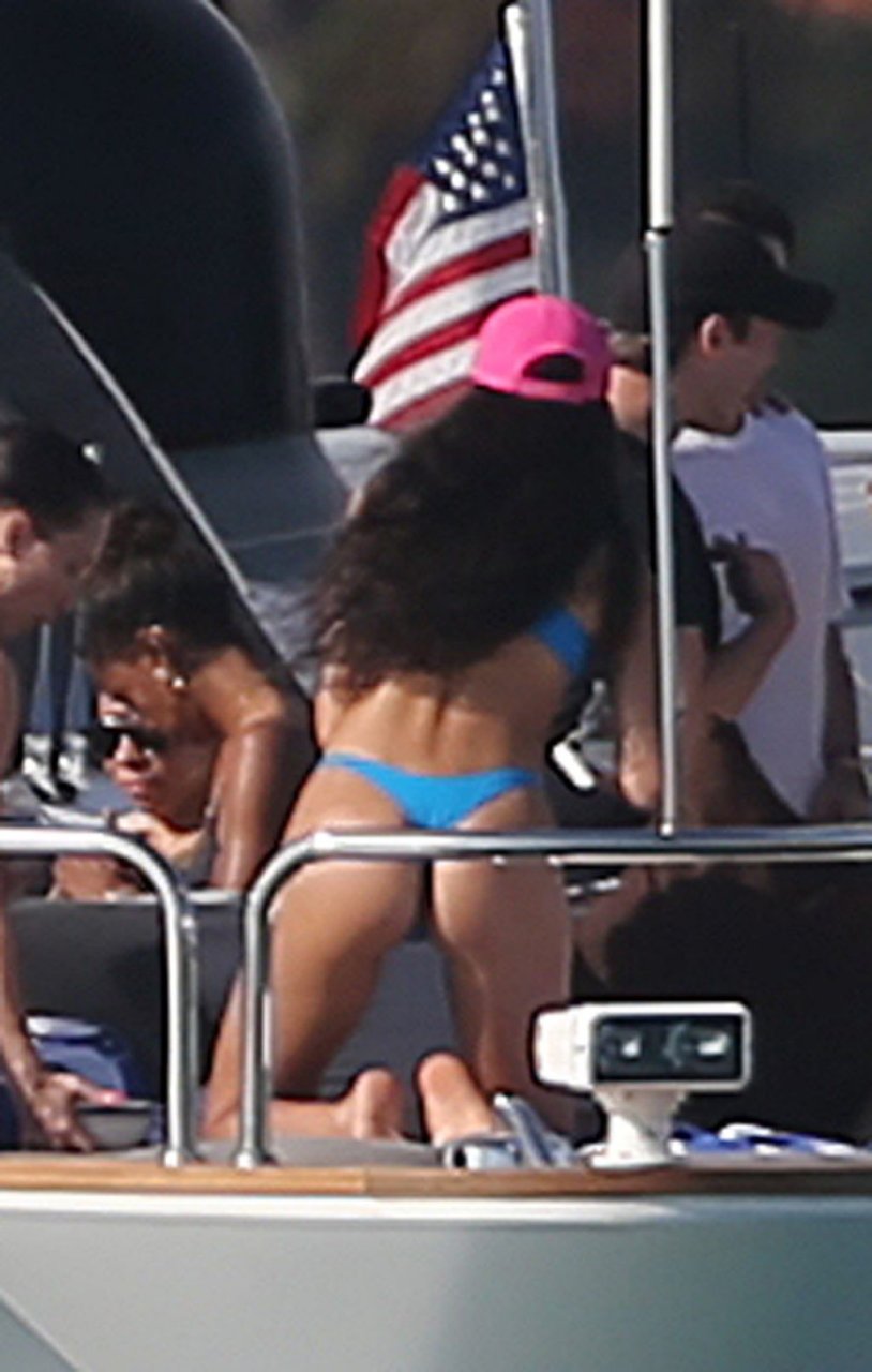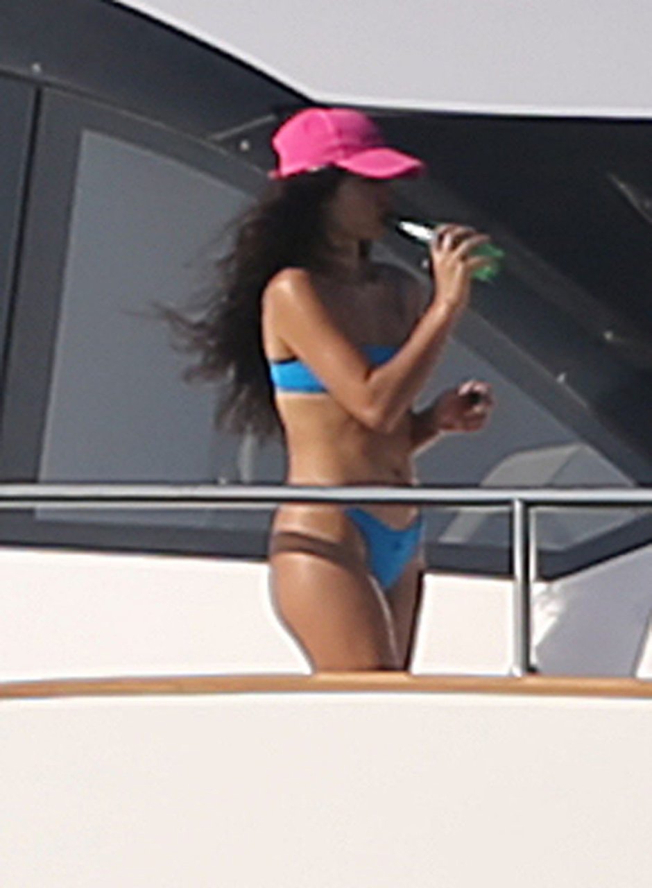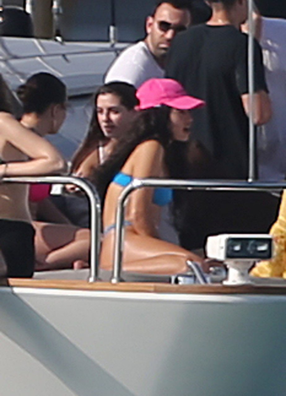 Models Jasmine Tookes (en bikini negro) y Shanina Shaik (en bikini azul) celebran el cumpleaños de Jasmine en un yate en Miami, 01/02/2019.