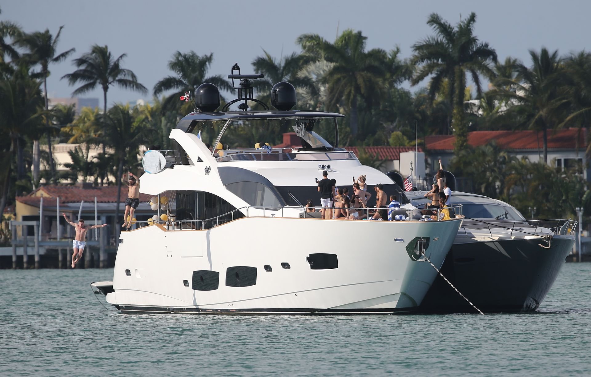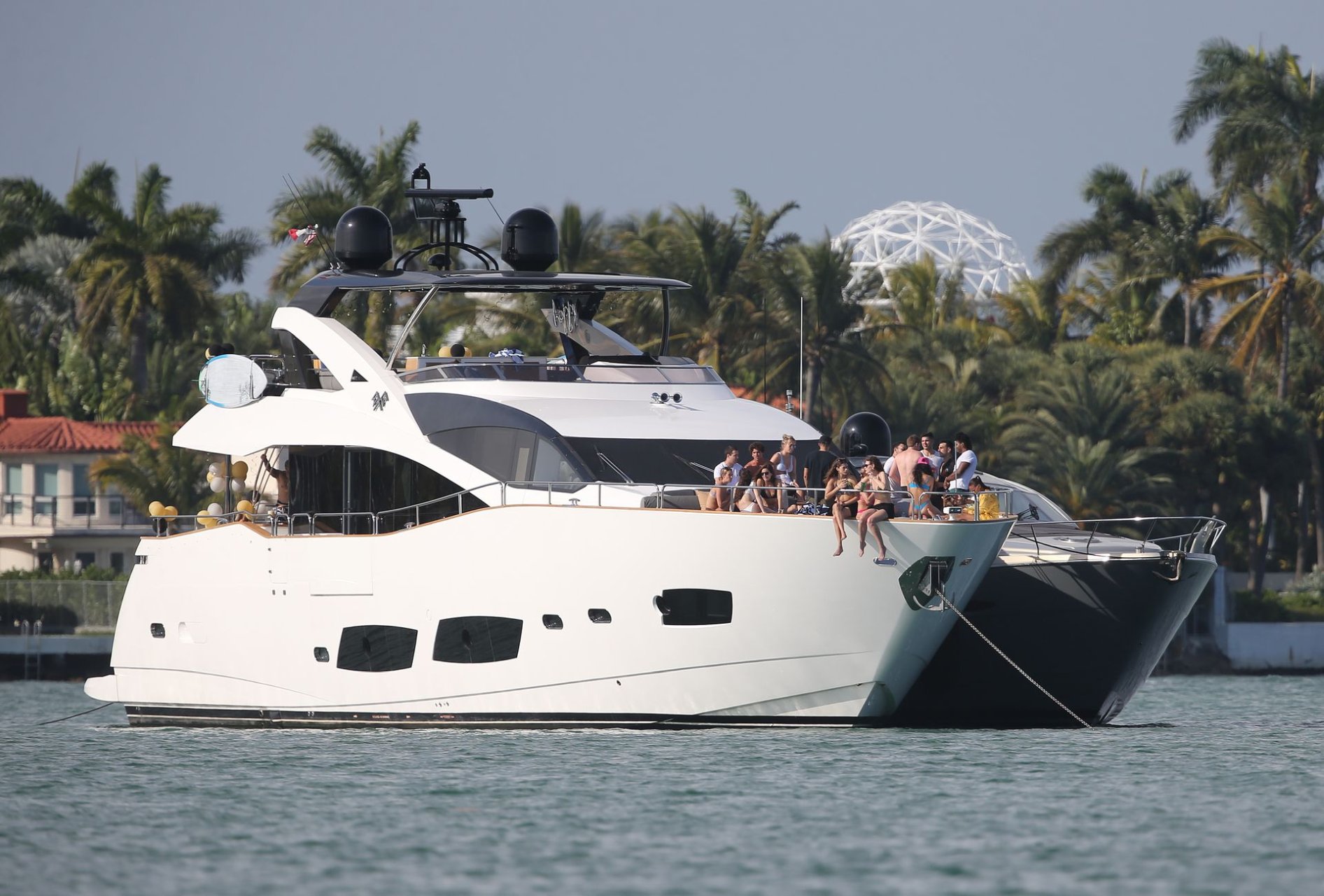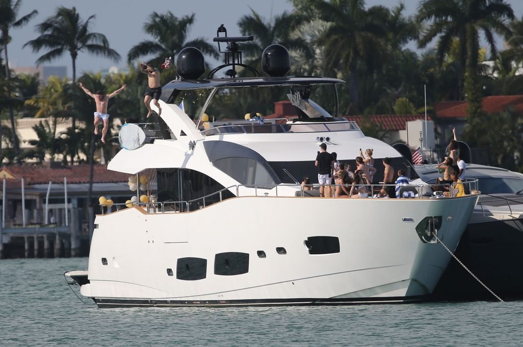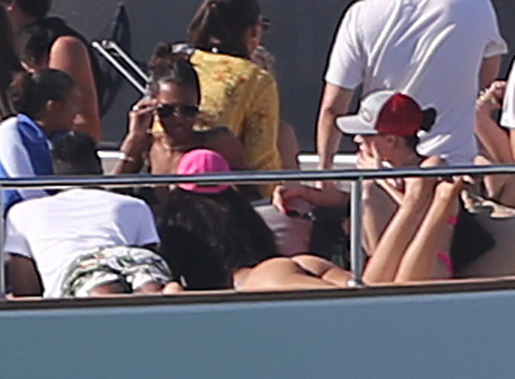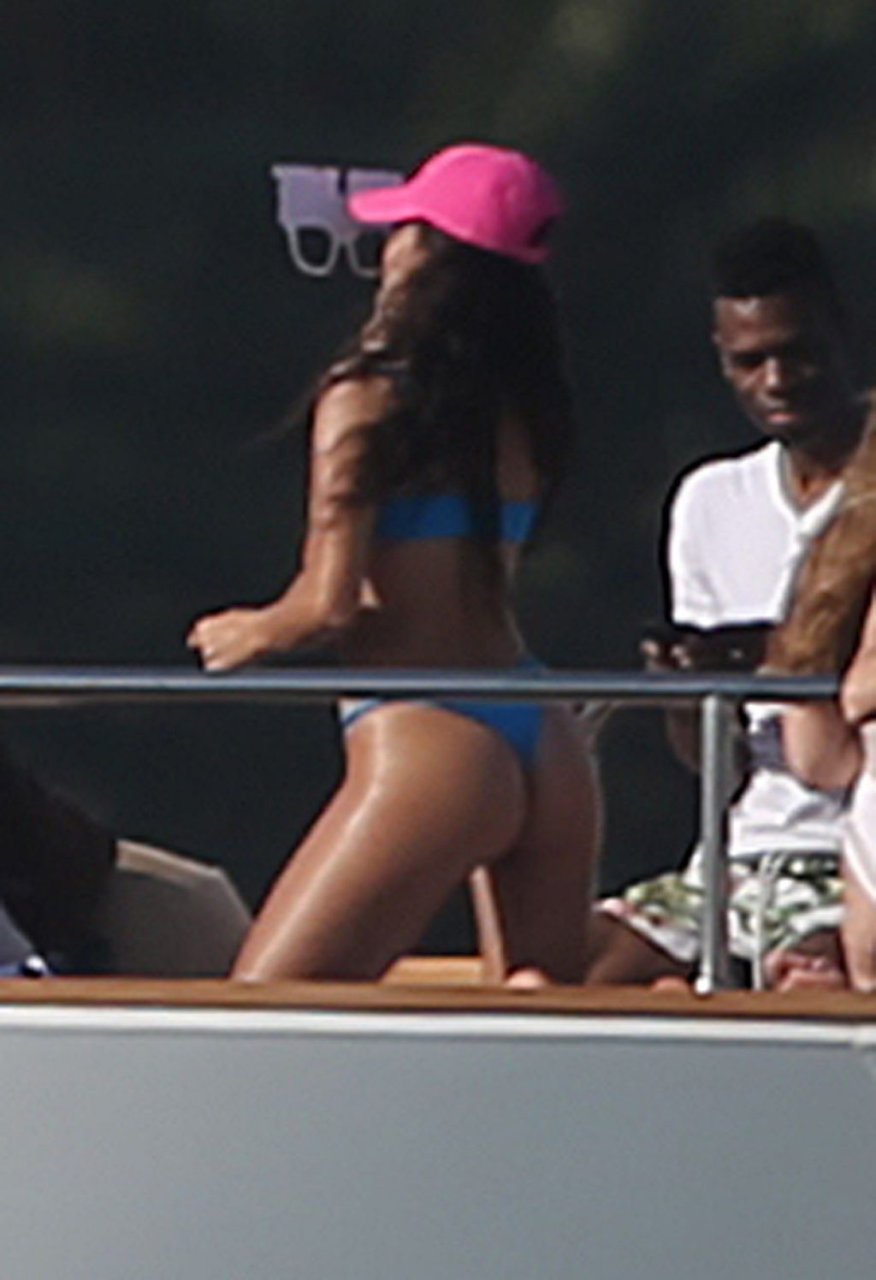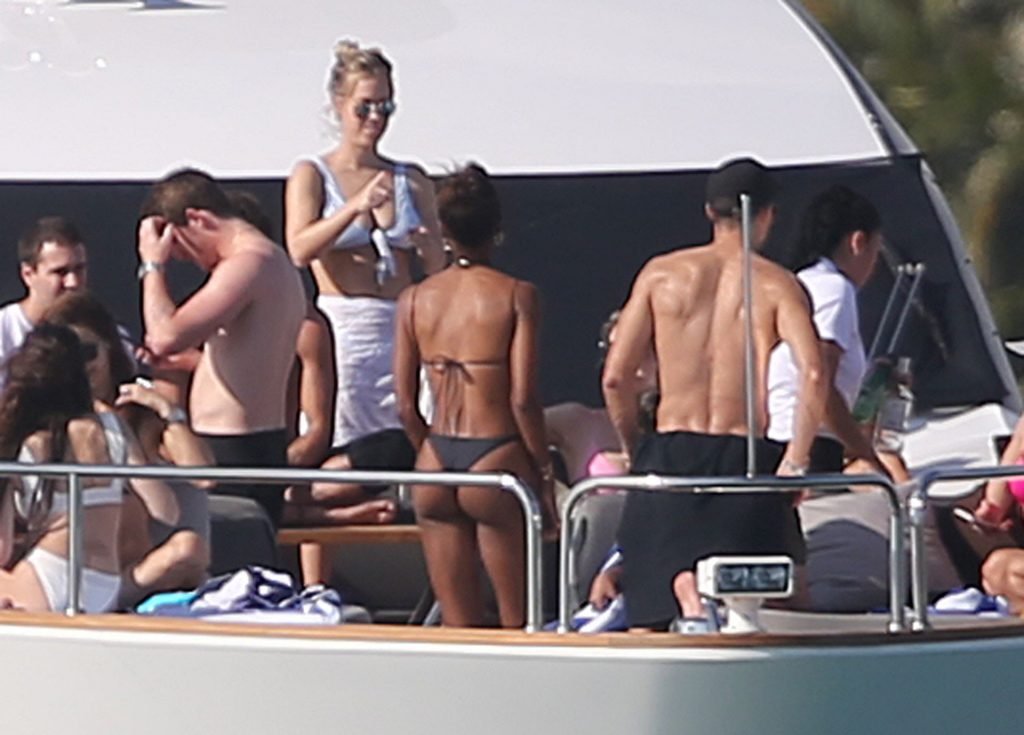 Models Jasmine Tookes (en bikini negro) y Shanina Shaik (en bikini azul) celebran el cumpleaños de Jasmine en un yate en Miami, 01/02/2019.