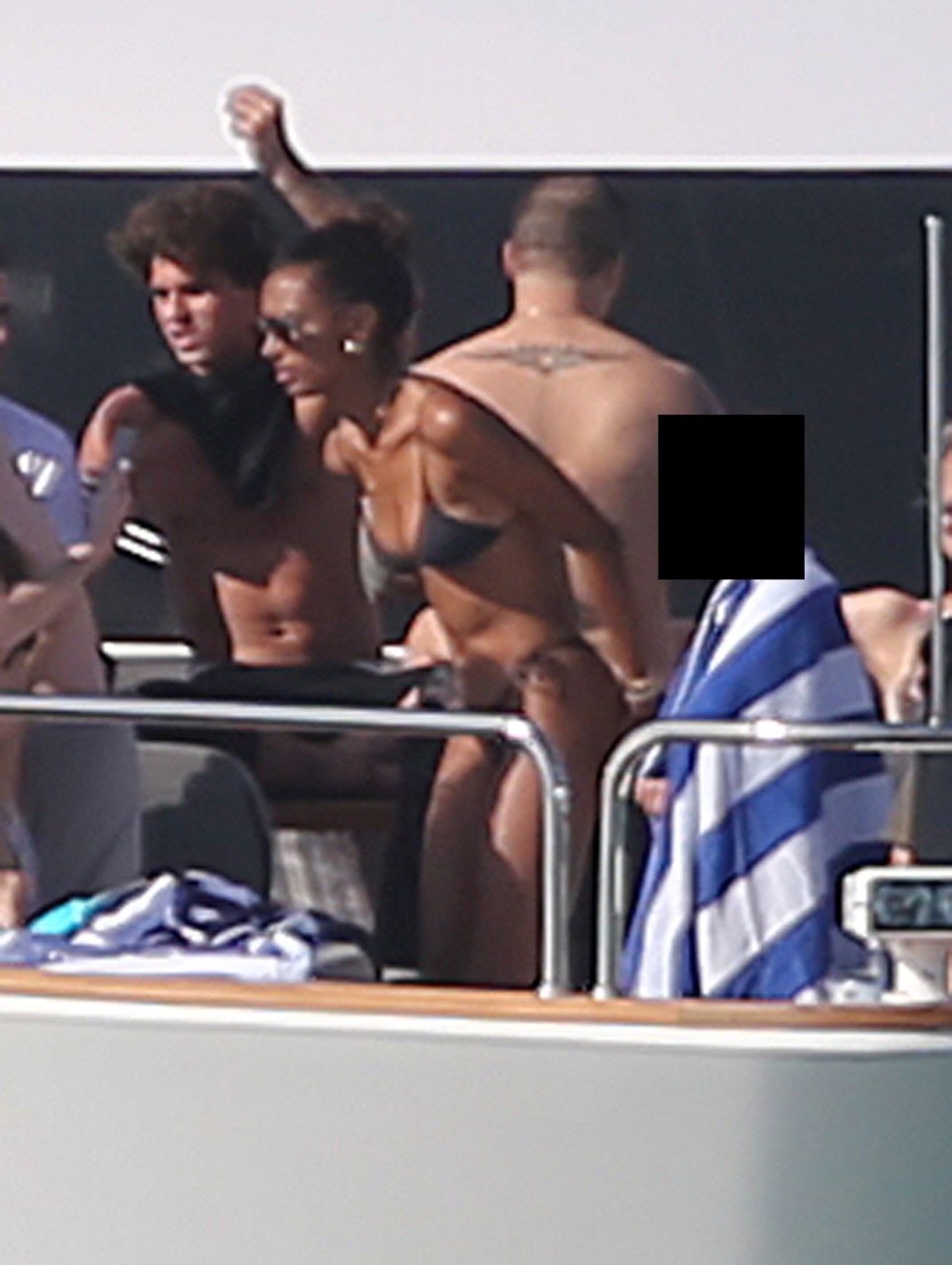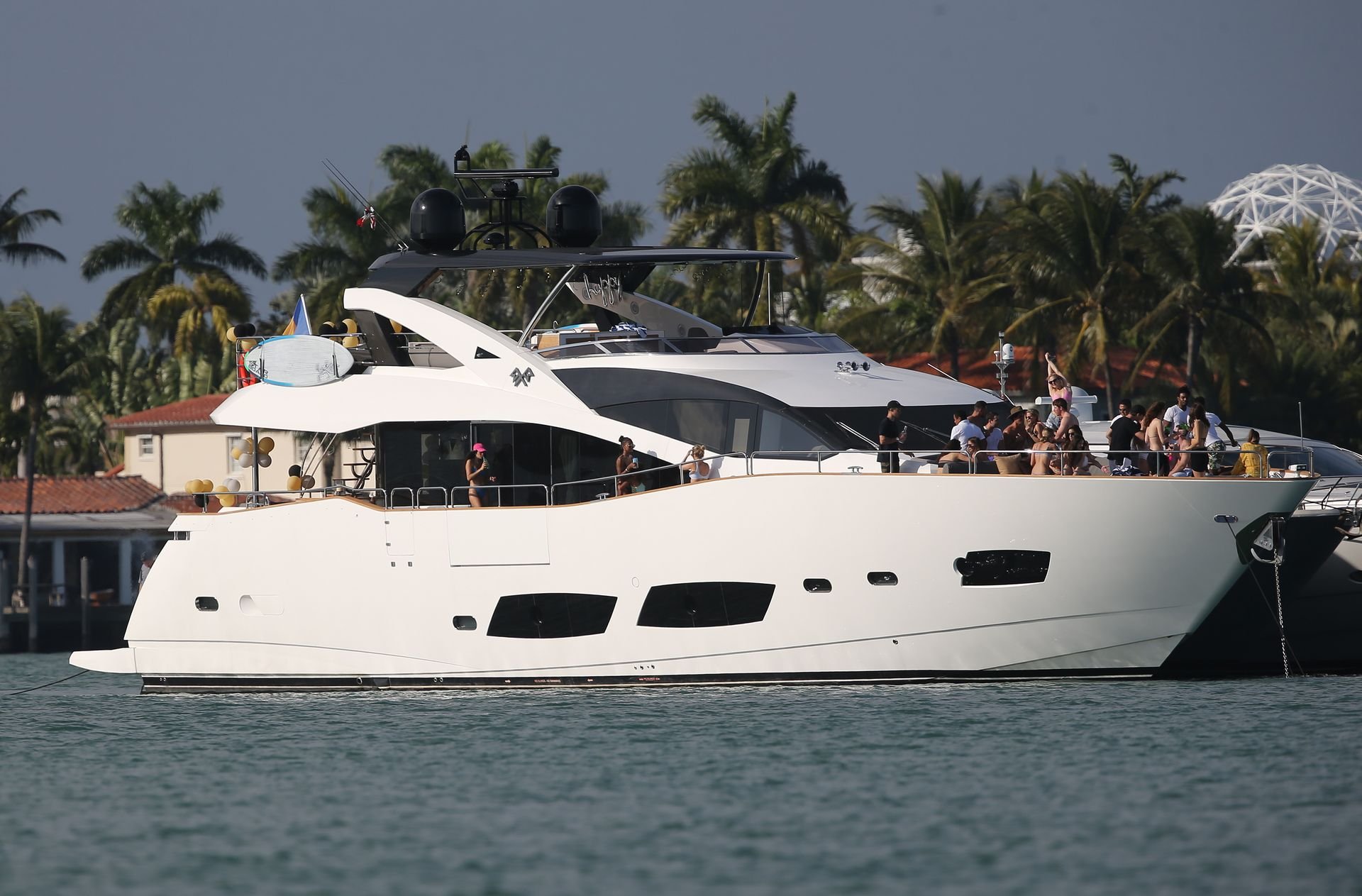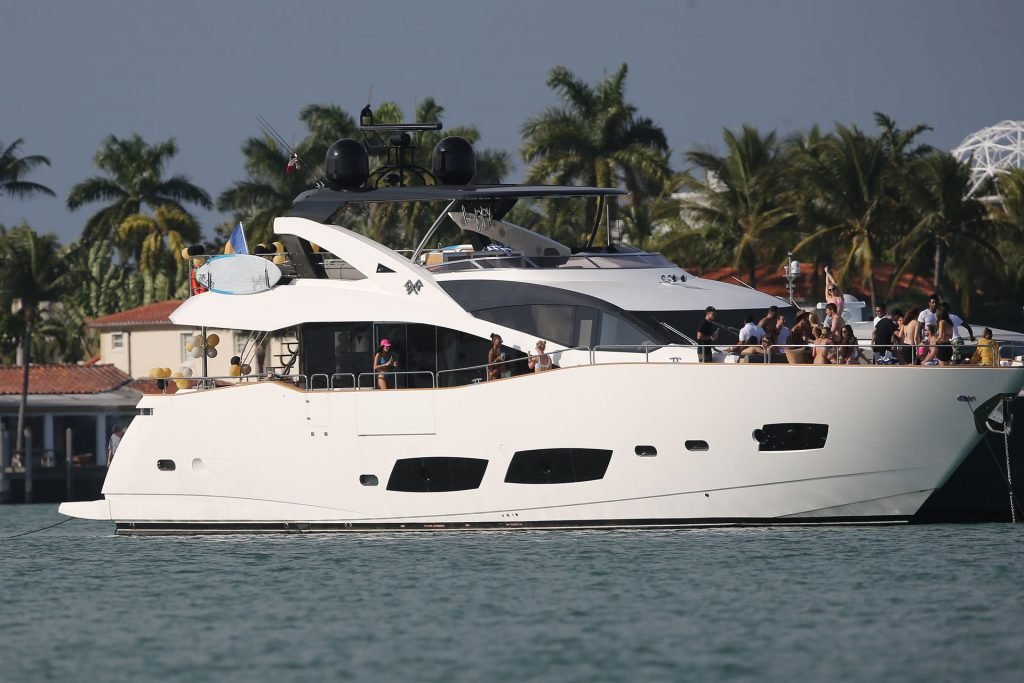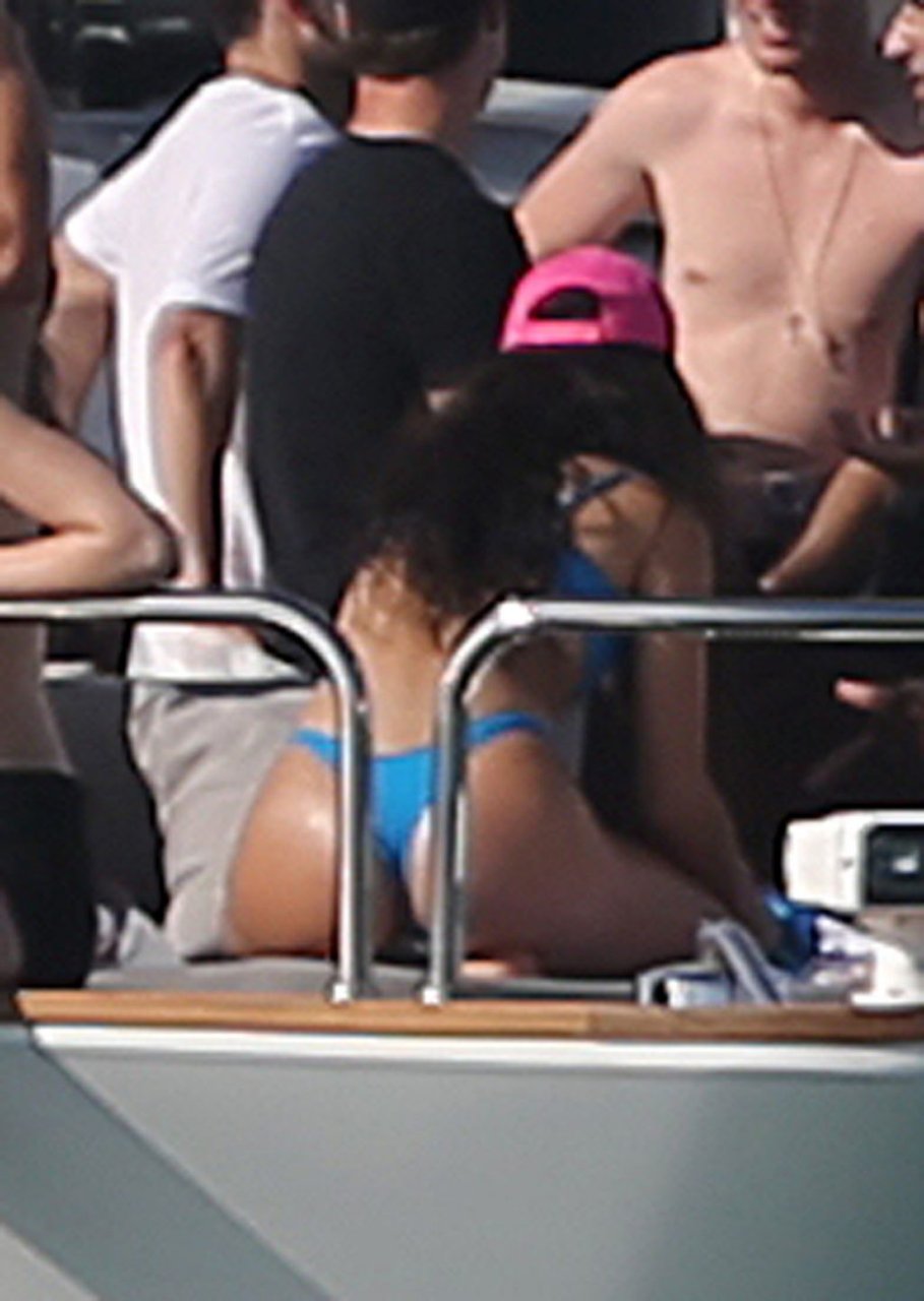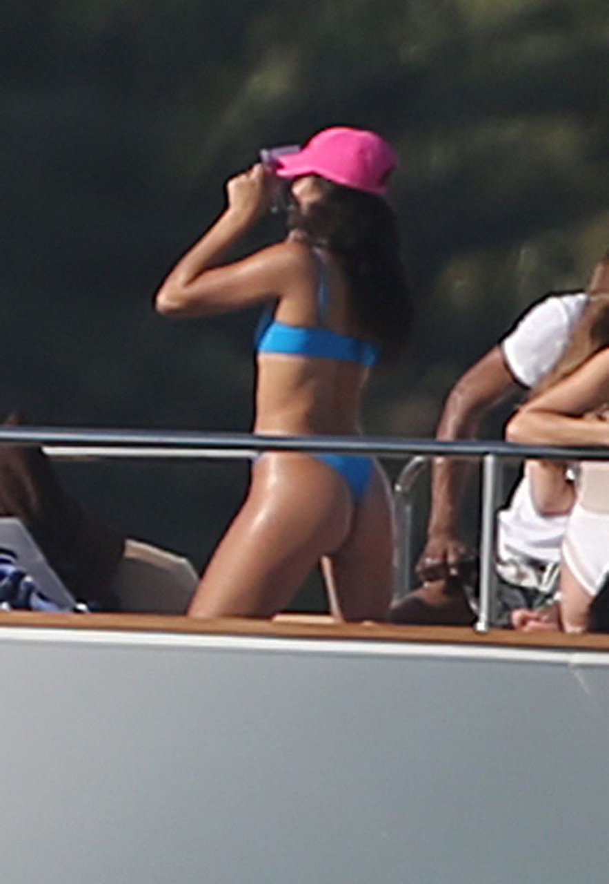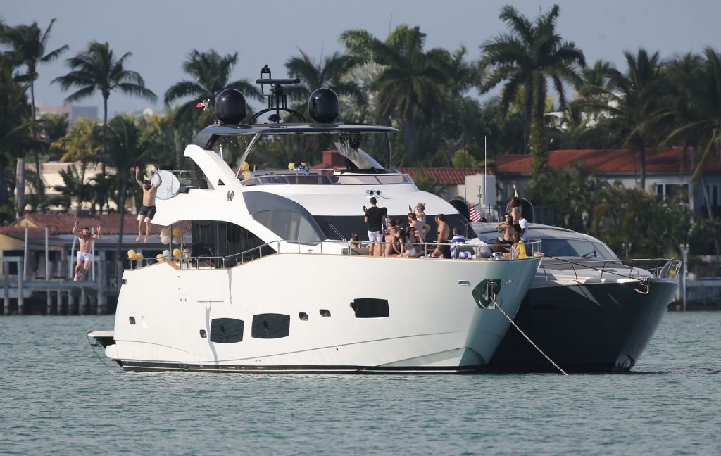 Models Jasmine Tookes (en bikini negro) y Shanina Shaik (en bikini azul) celebran el cumpleaños de Jasmine en un yate en Miami, 01/02/2019.