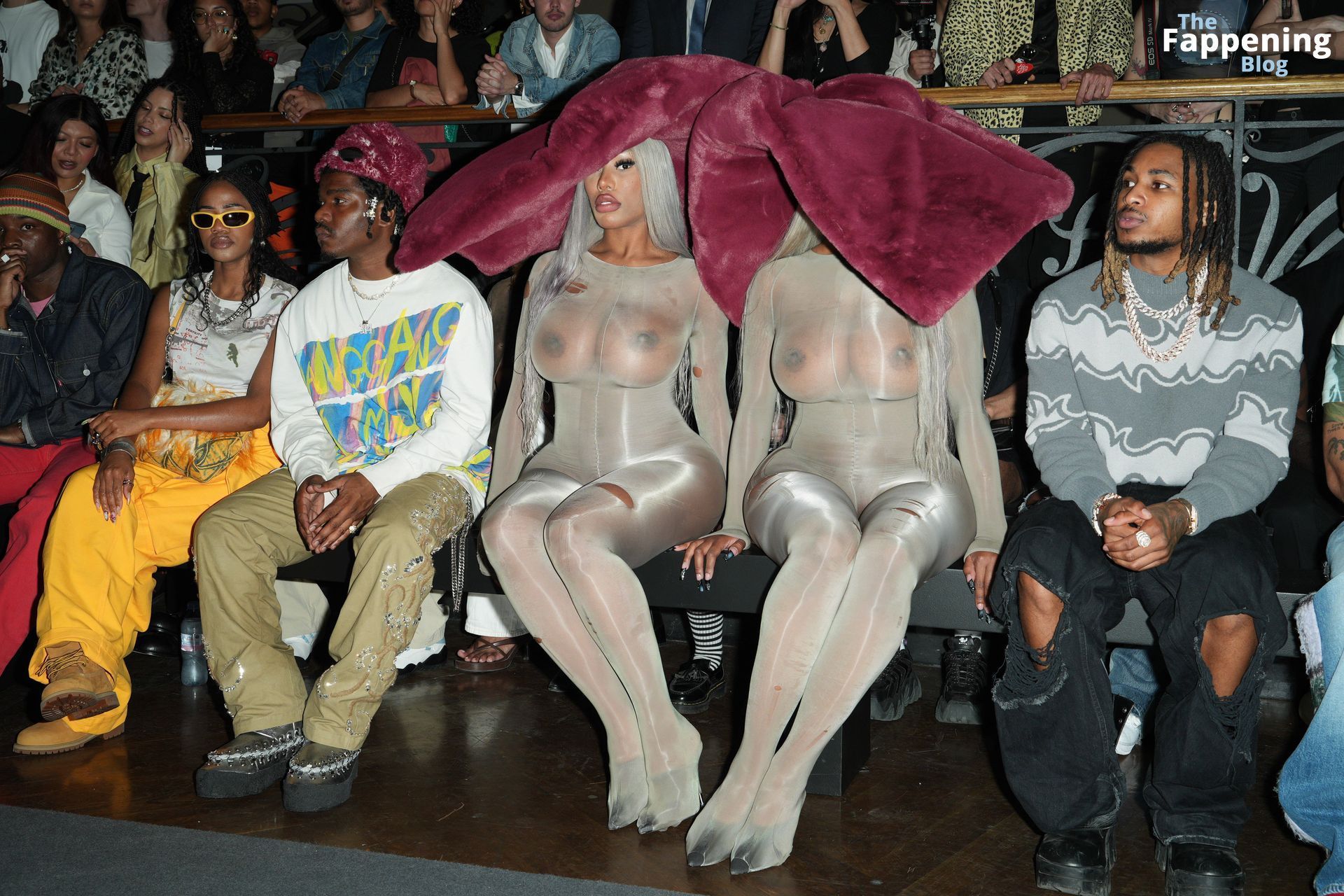 Shannon y Shannade Clermont, también conocidas como las Clermont Twins, muestran sus pechos desnudos en el desfile de Bluemarble en París.