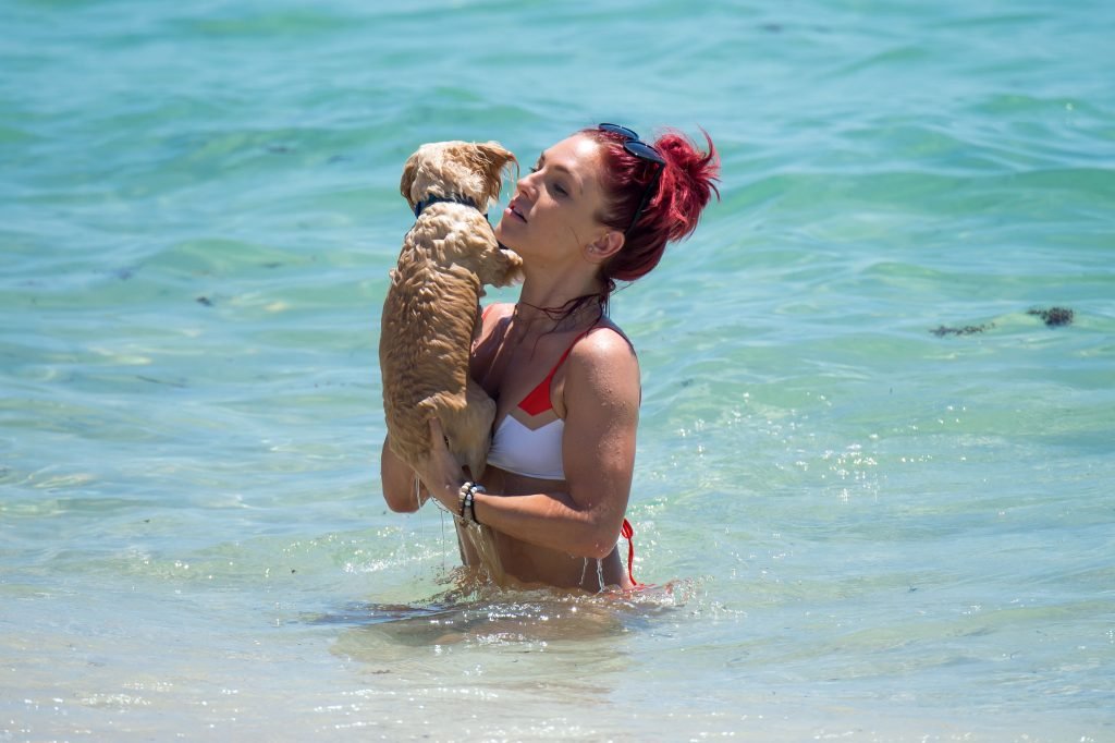 DWTS estrella Sharna Burgess, 32, disfruta un día con un top de bikini blanco en la playa con sus perros en Miami Beach, 02/06/2018.
