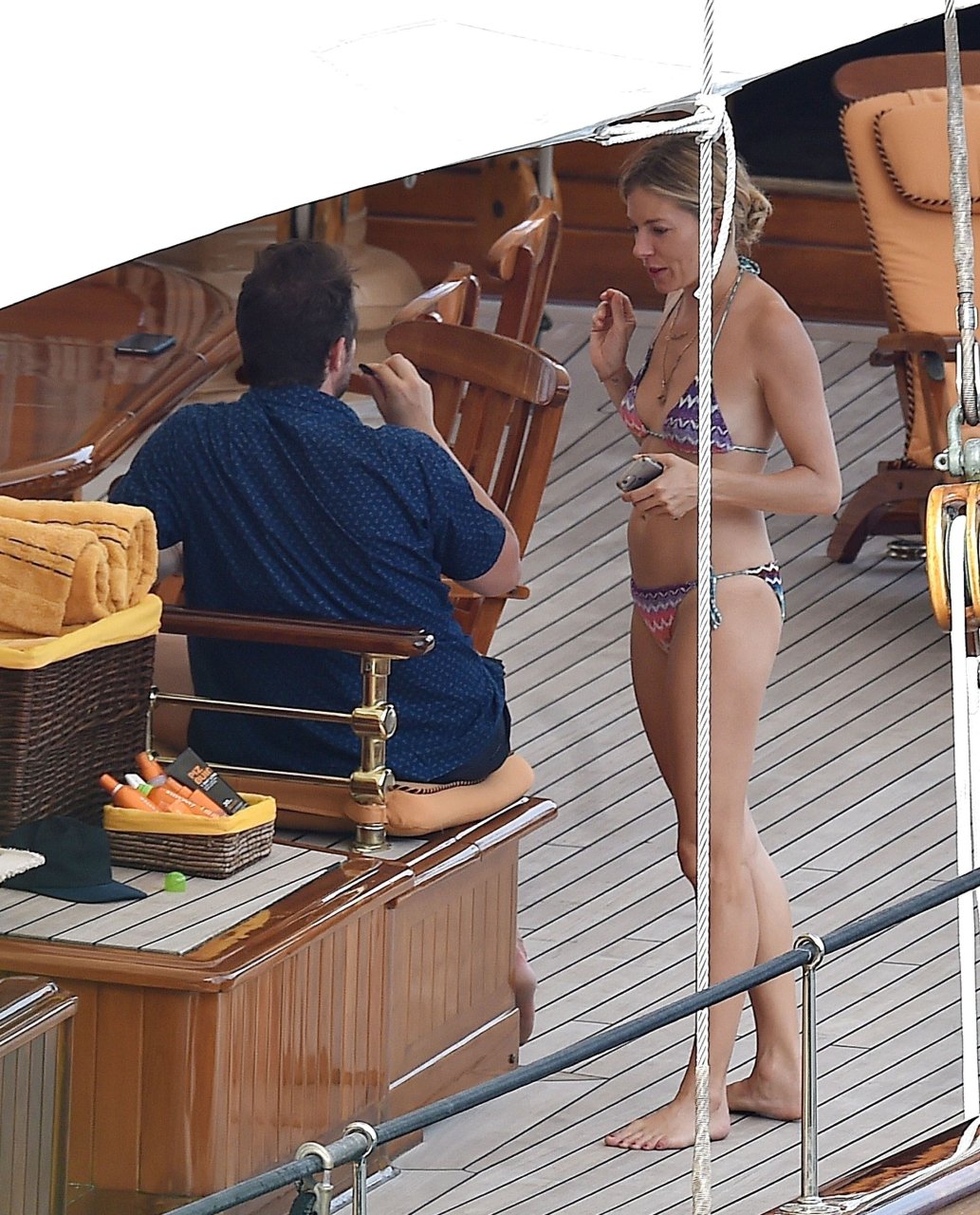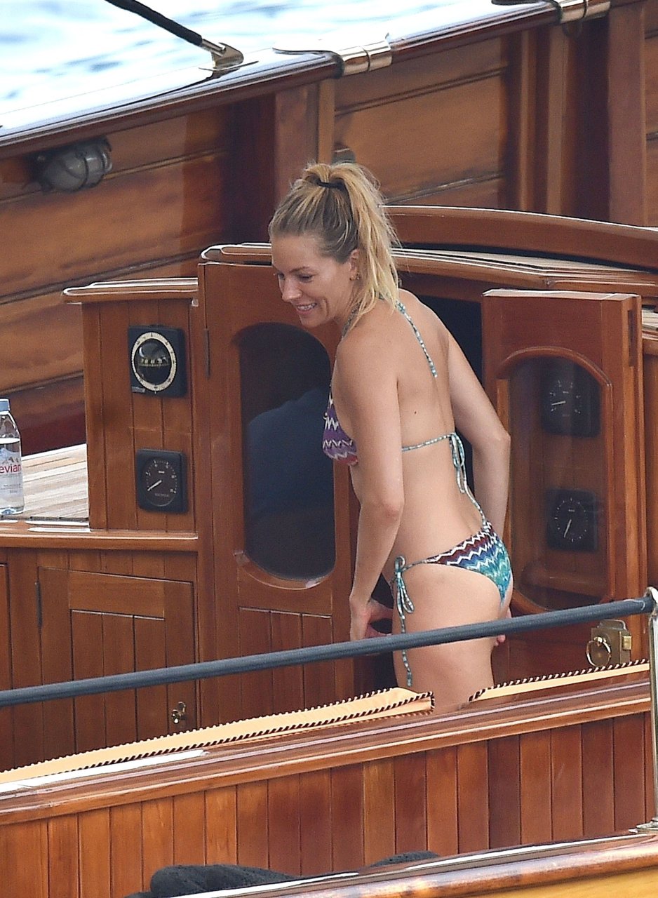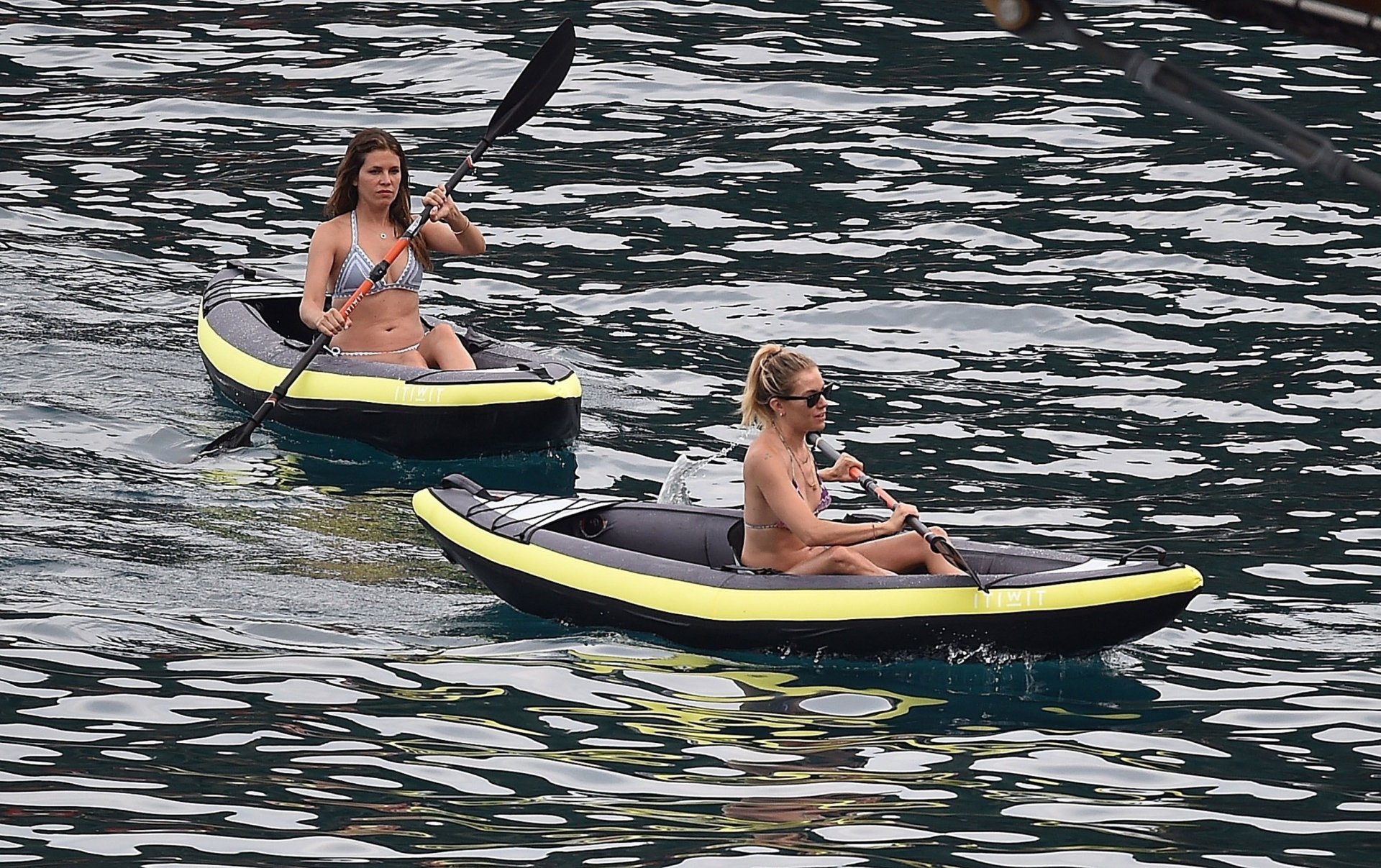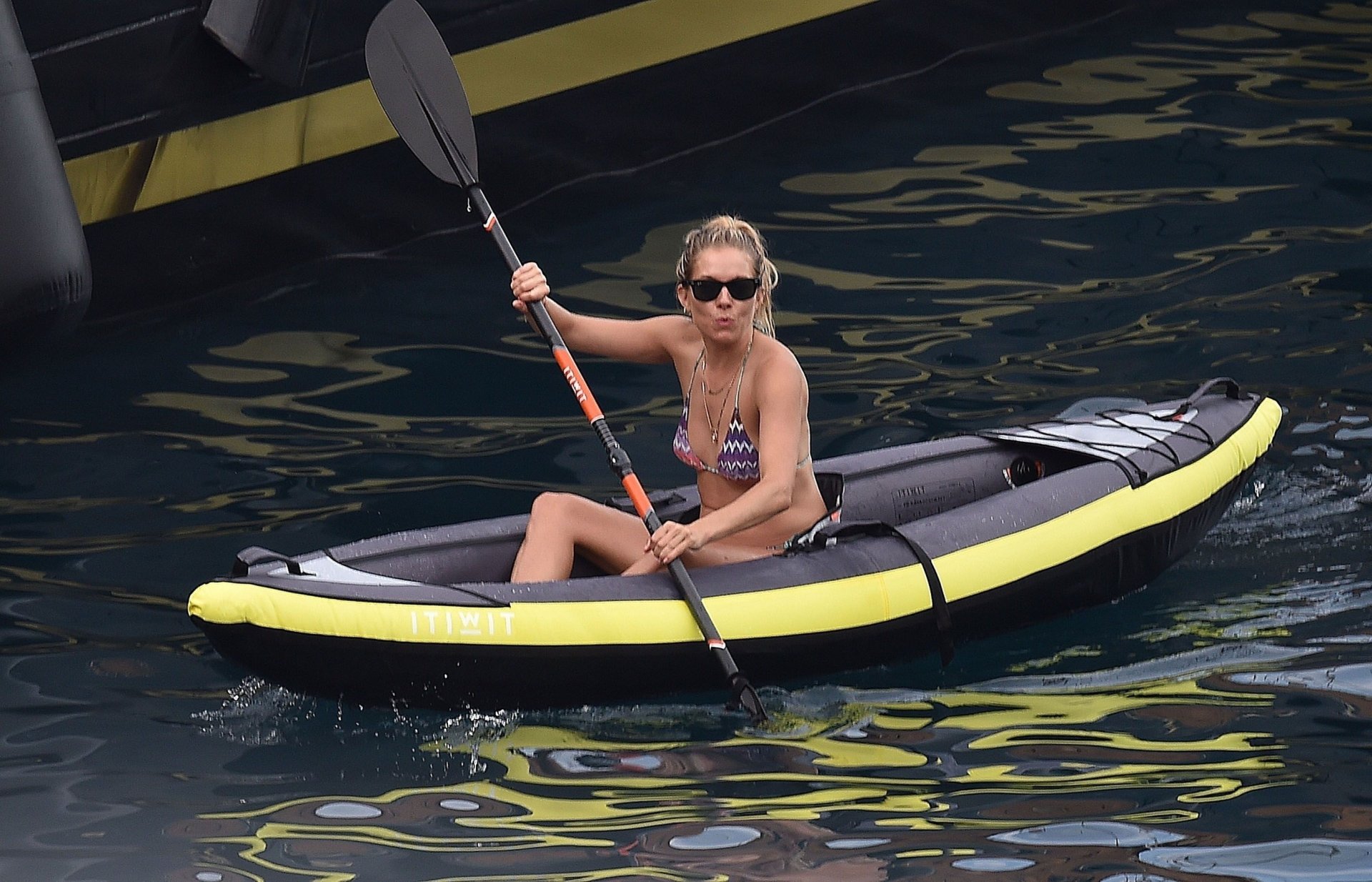 La actriz británica Sienna Miller (36) fue vista con su bikini escaso, disfrutando del sol de verano a bordo de su barco, 22/07/2018. Sienna causó sensación mientras remaba en el mar y estuvo acompañada en las vacaciones por Dasha Zhukova, quien es la exesposa del dueño ruso del Chelsea FC, Roman Abramovich, y Darek Blasberg en Portofino, Italia.