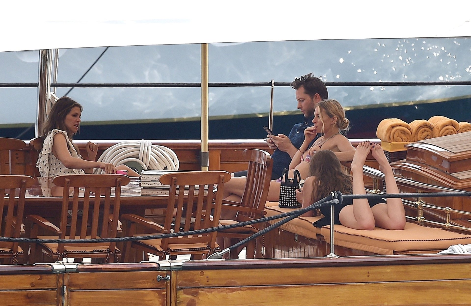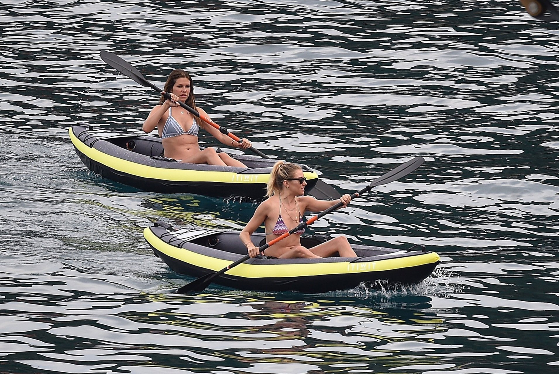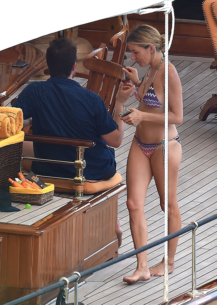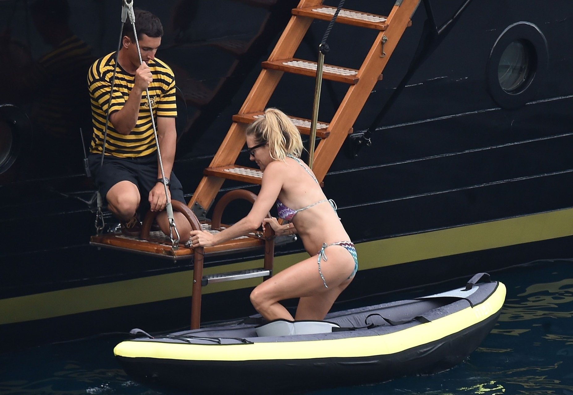 La actriz británica Sienna Miller (36) fue vista con su bikini escaso, disfrutando del sol de verano a bordo de su barco, 22/07/2018. Sienna causó sensación mientras remaba en el mar y estuvo acompañada en las vacaciones por Dasha Zhukova, quien es la exesposa del dueño ruso del Chelsea FC, Roman Abramovich, y Darek Blasberg en Portofino, Italia.