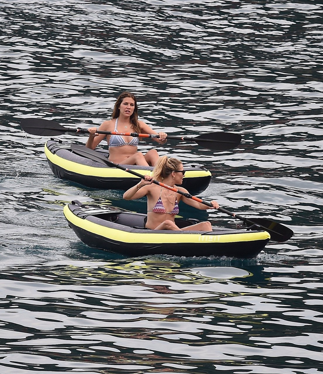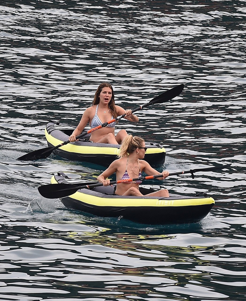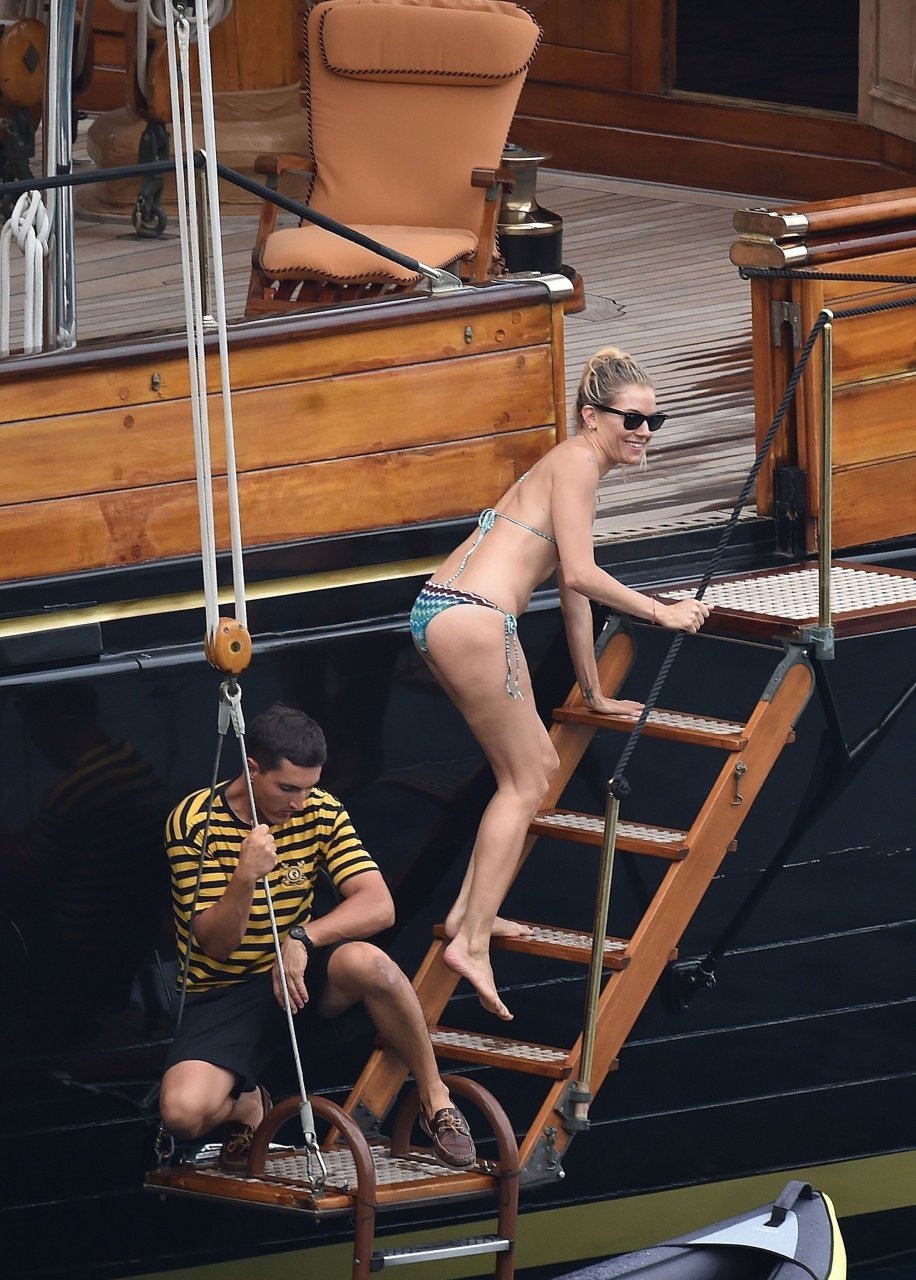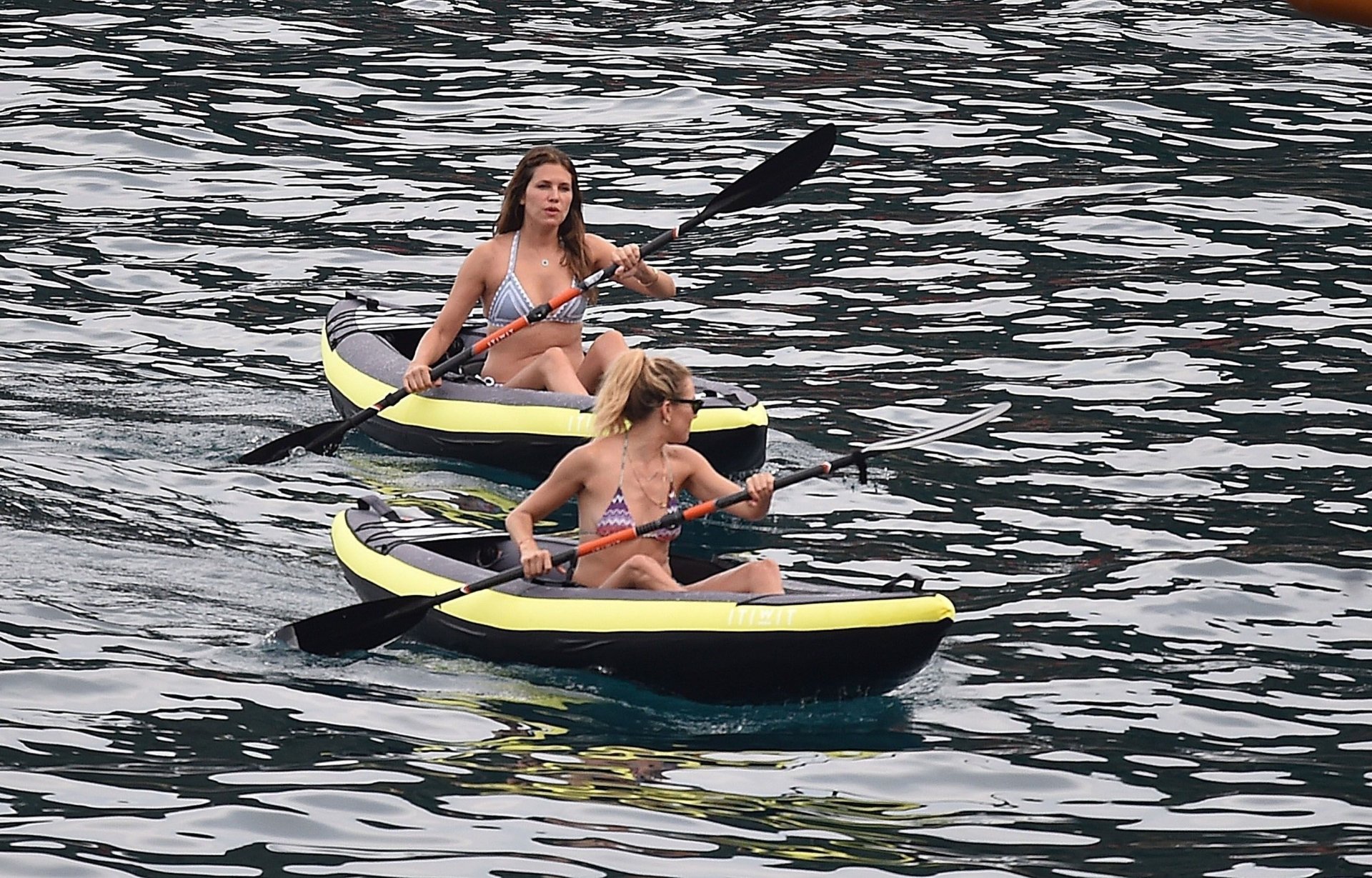 La actriz británica Sienna Miller (36) fue vista con su bikini escaso, disfrutando del sol de verano a bordo de su barco, 22/07/2018. Sienna causó sensación mientras remaba en el mar y estuvo acompañada en las vacaciones por Dasha Zhukova, quien es la exesposa del dueño ruso del Chelsea FC, Roman Abramovich, y Darek Blasberg en Portofino, Italia.