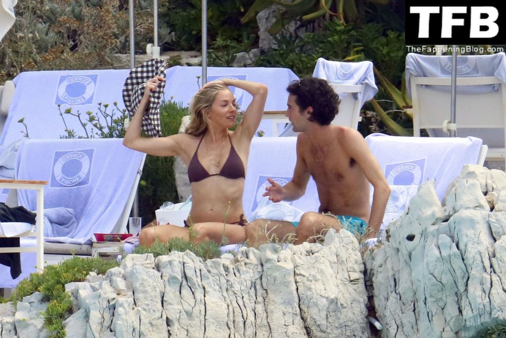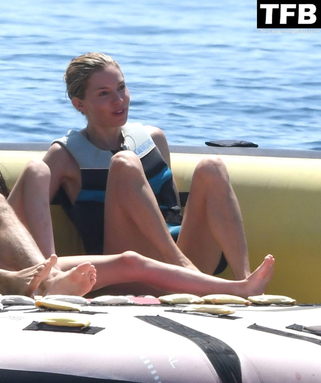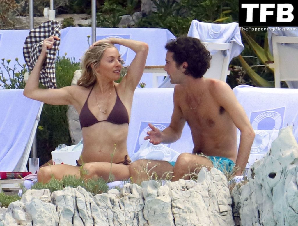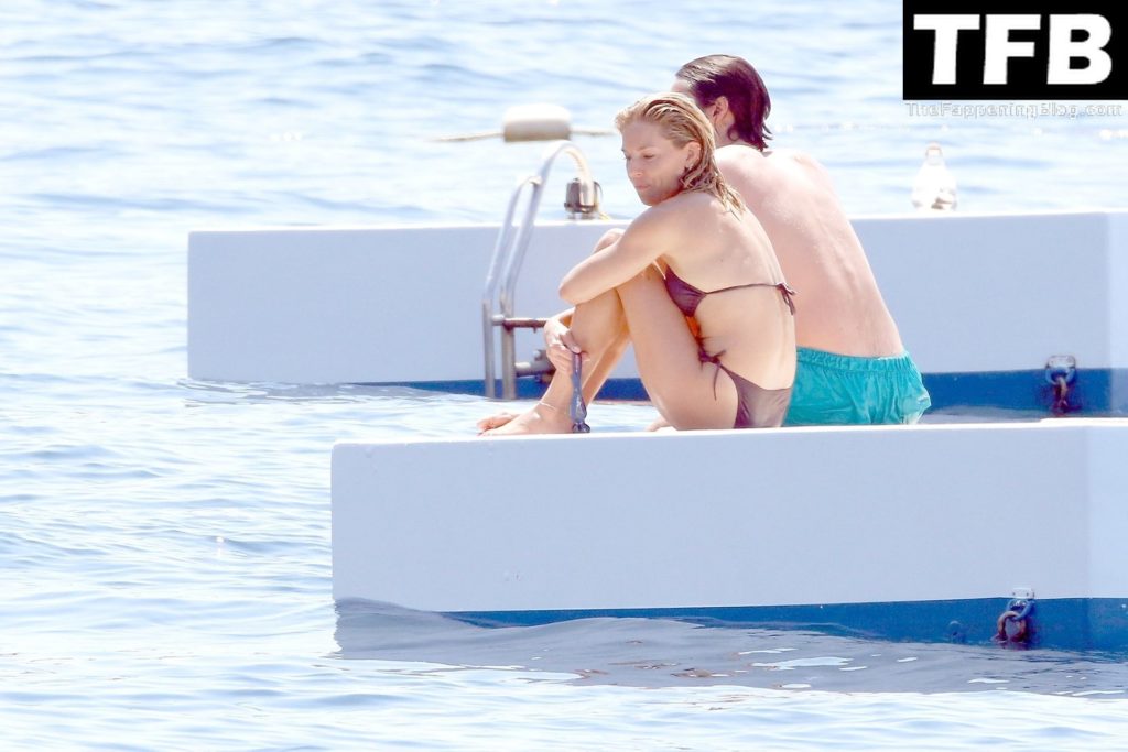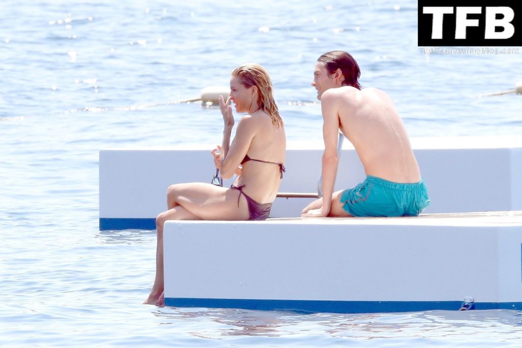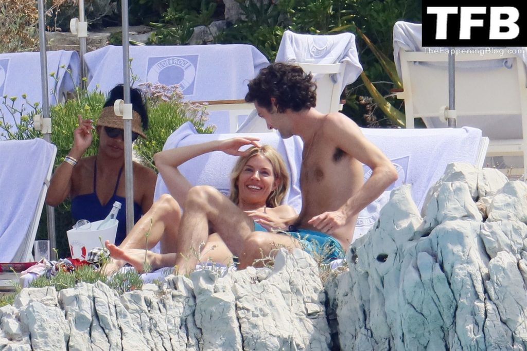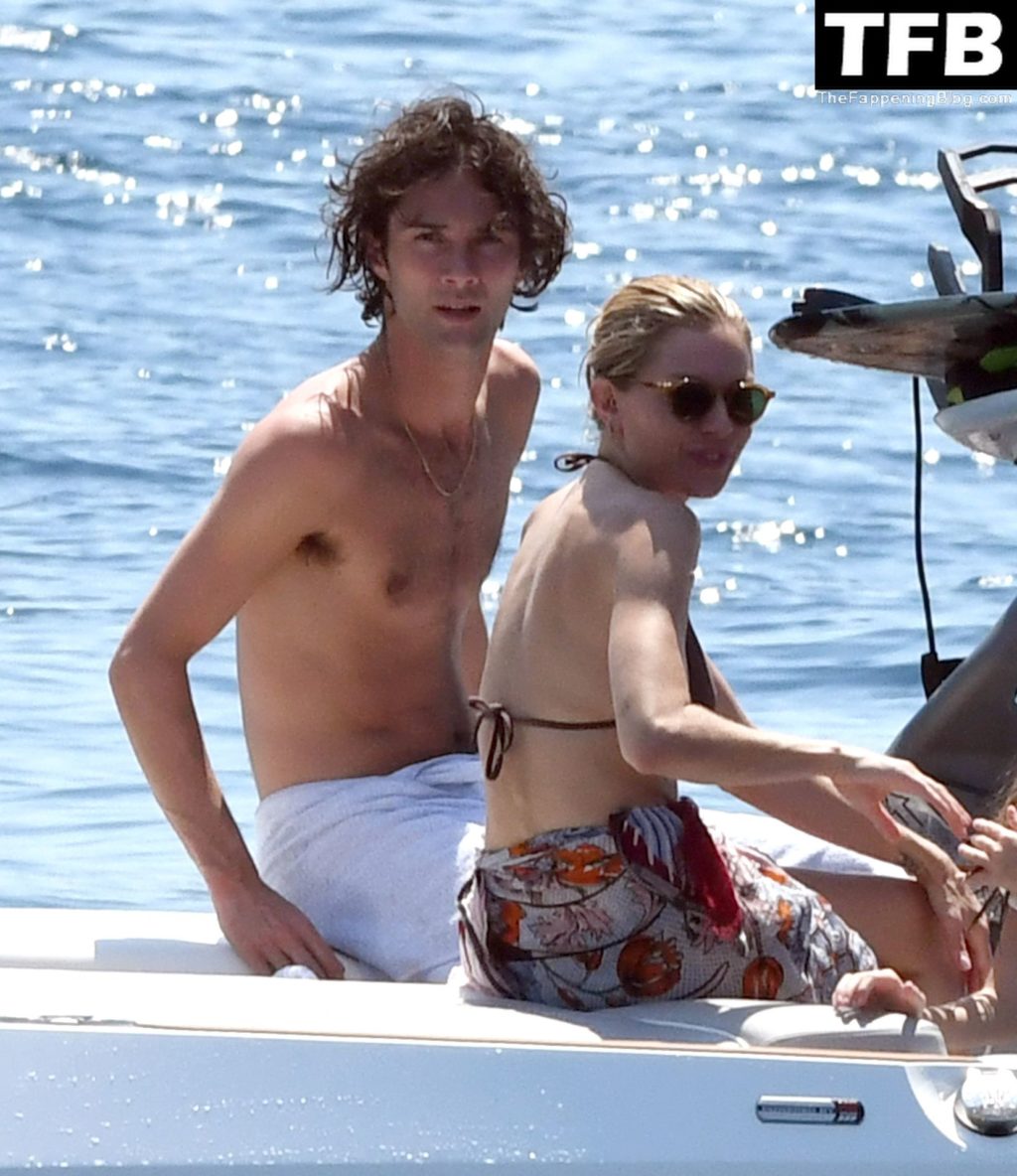 La actriz británica Sienna Miller muestra su sexy físico con un pequeño bikini ajustado junto a su novio Oli Green mientras disfrutan del sol en sus vacaciones en el sur de Francia con la hija de Sienna, Marlowe Sturridge, 21/07/2022.