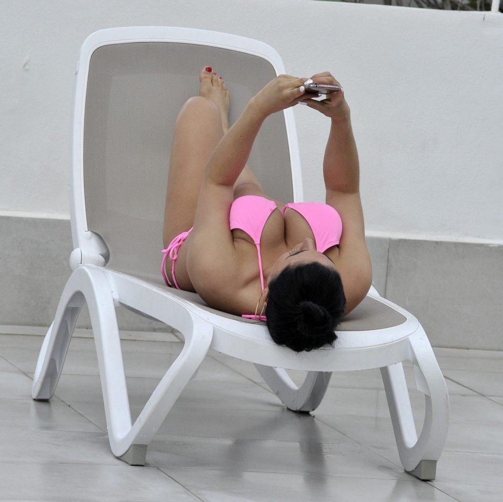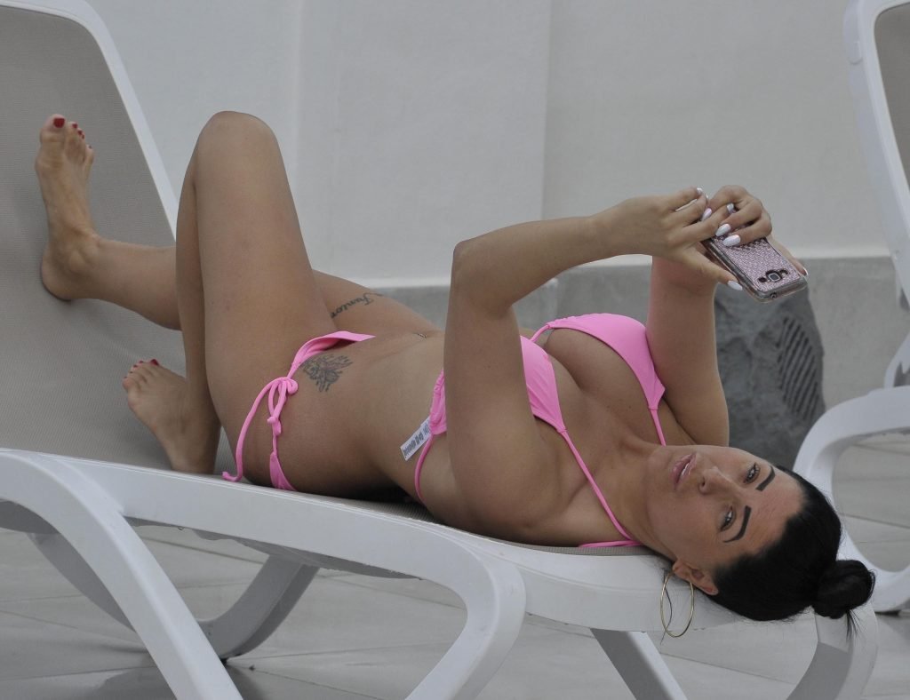 La estrella de reality Simone Reed (29) fue vista luciendo un bikini rosa y tuvo algunos problemas para contener todos sus atributos mientras posaba junto a la piscina en España, 25/05/2018.