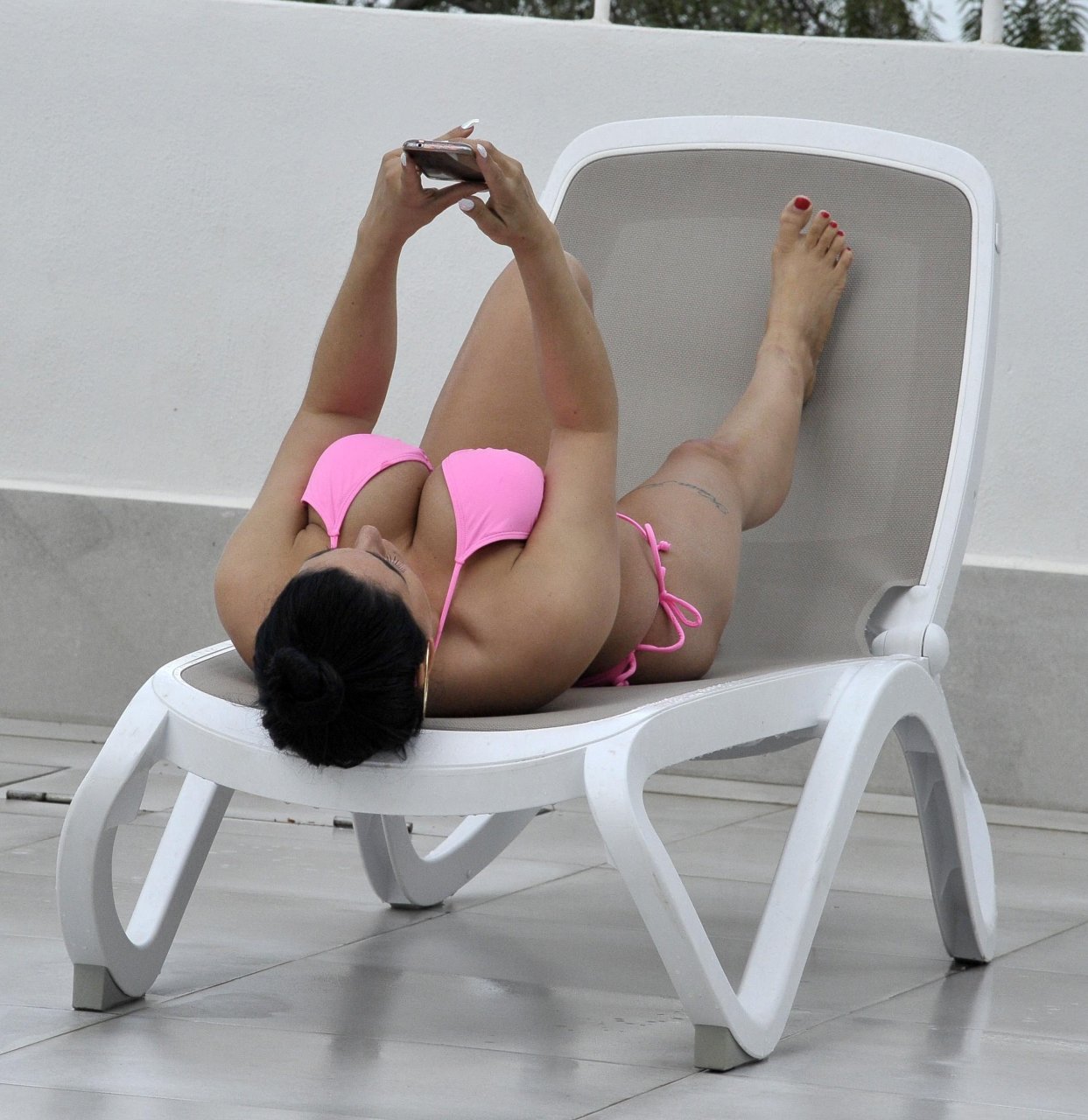 La estrella de reality Simone Reed (29) fue vista luciendo un bikini rosa y tuvo algunos problemas para contener todos sus atributos mientras posaba junto a la piscina en España, 25/05/2018.