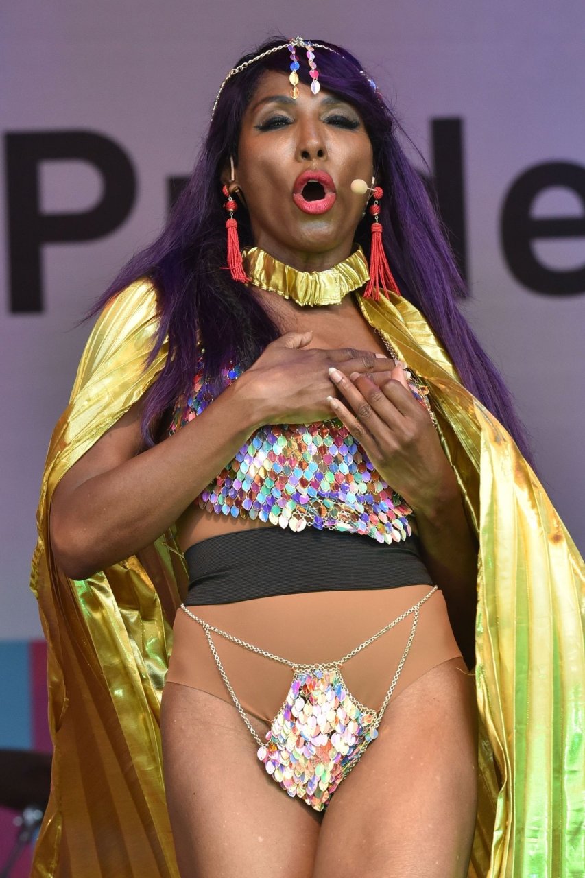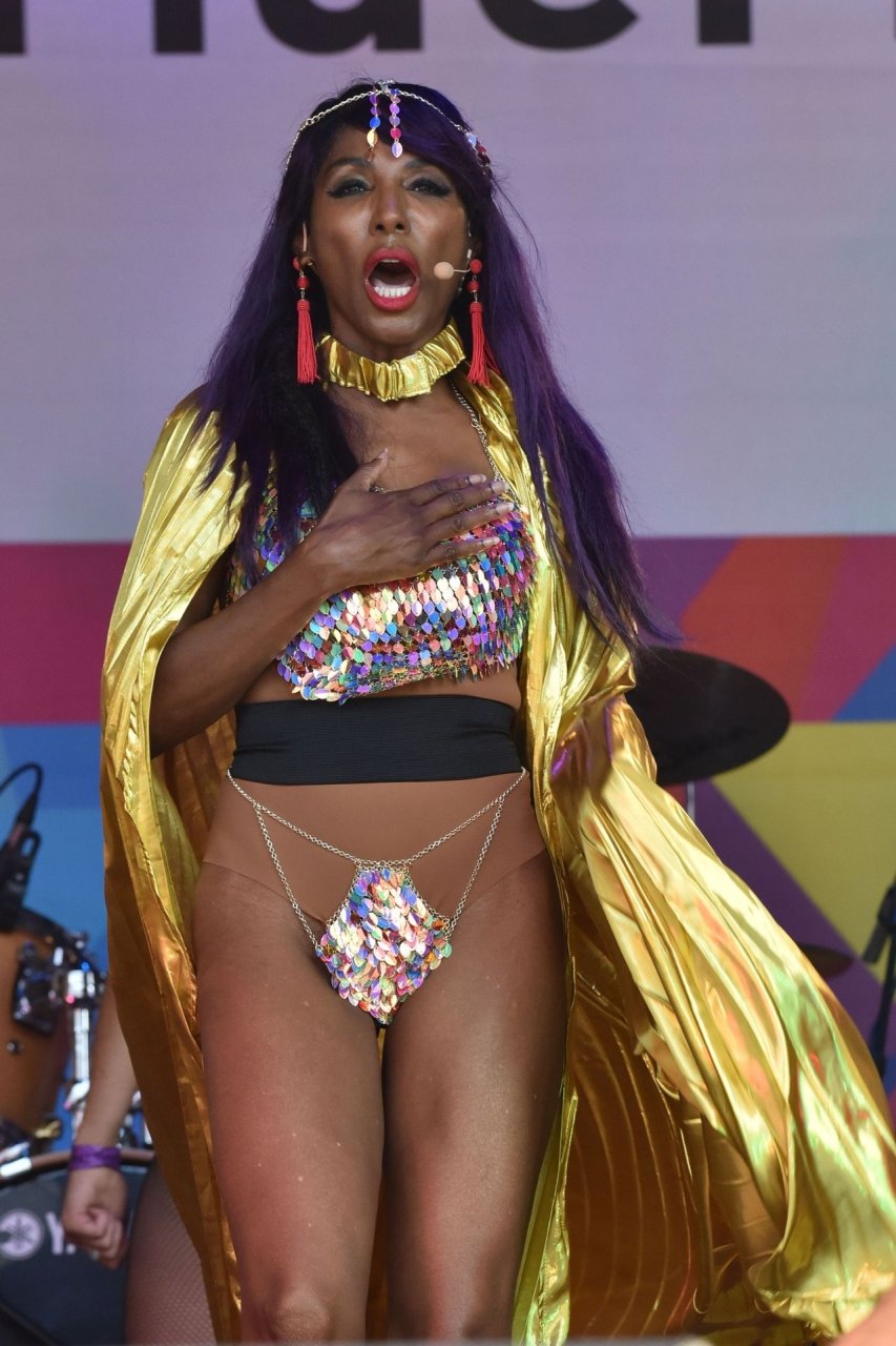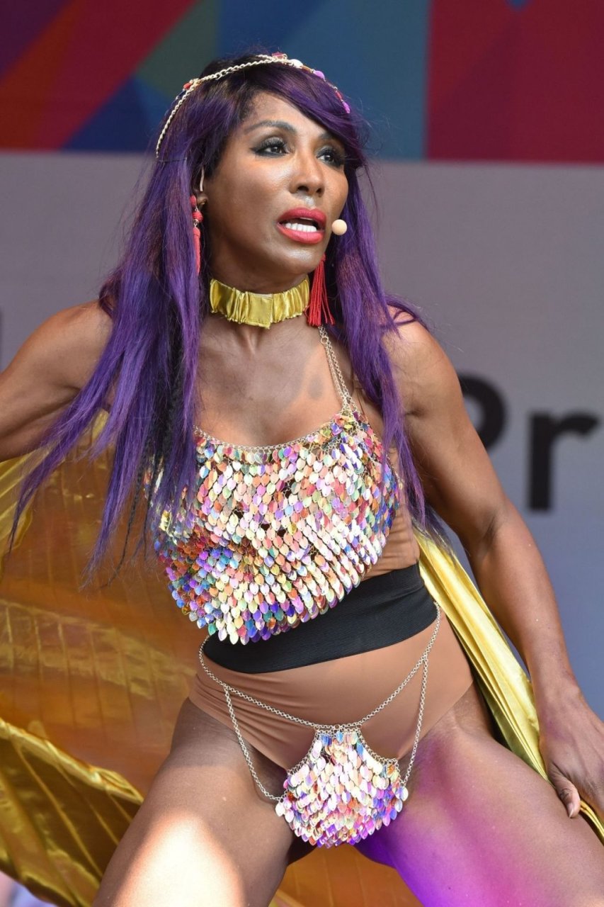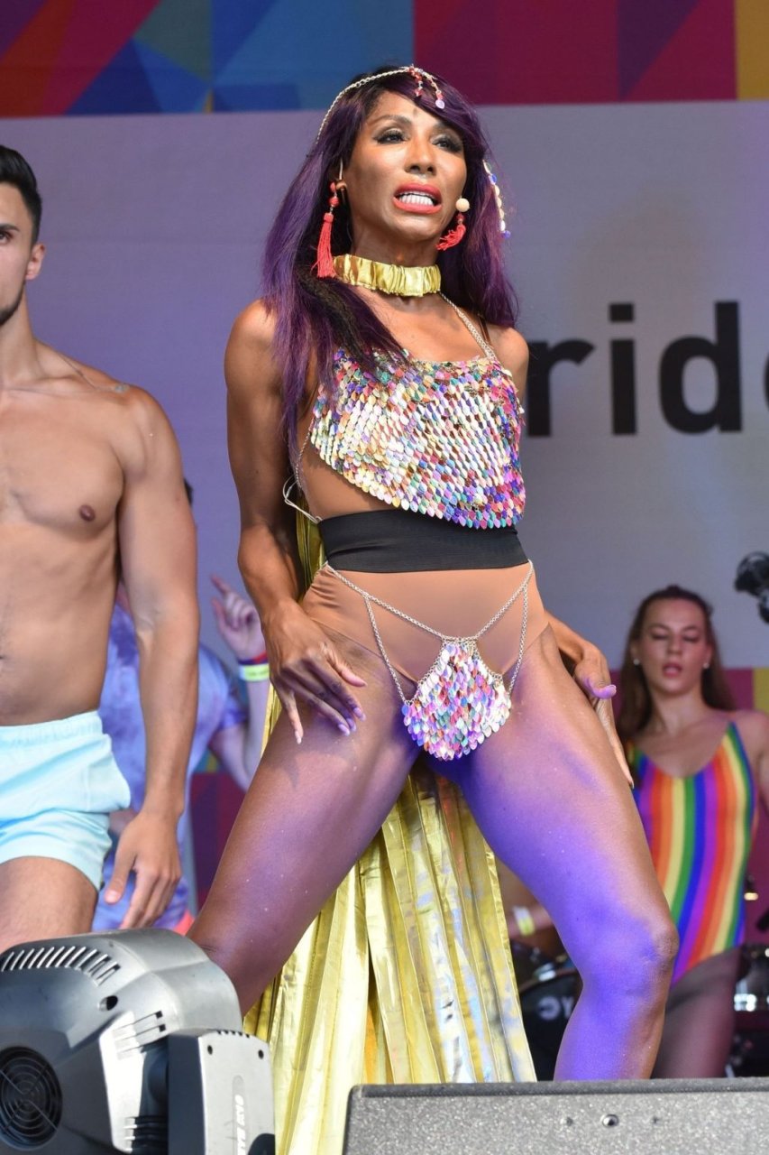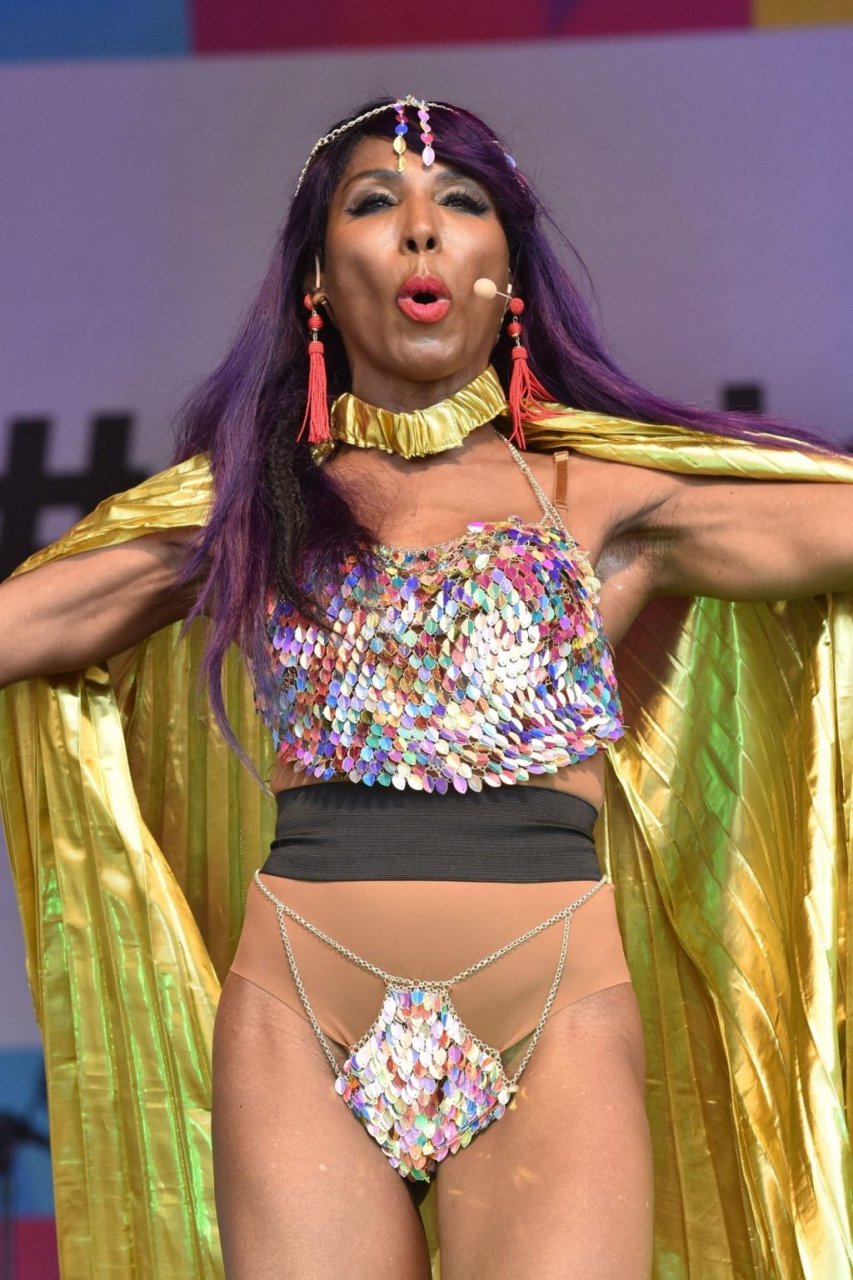 Sinitta fue fotografiada actuando en el escenario principal en Pride en Londres en Trafalgar Square, 07/07/2018. Ya habíamos visto fotos desnudas de Sinitta antes, pero ese día, tuvo un show caliente. La mujer negra de 55 años llevaba un atuendo extraño con un trozo de tela sobre su pussy.
