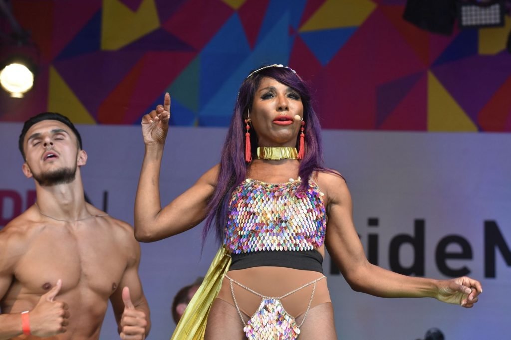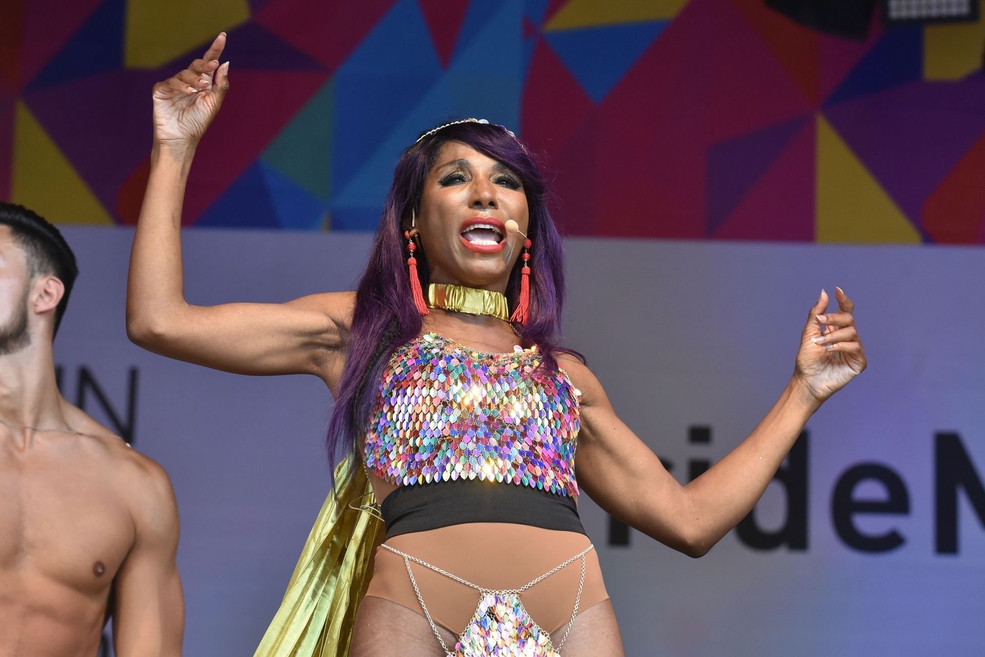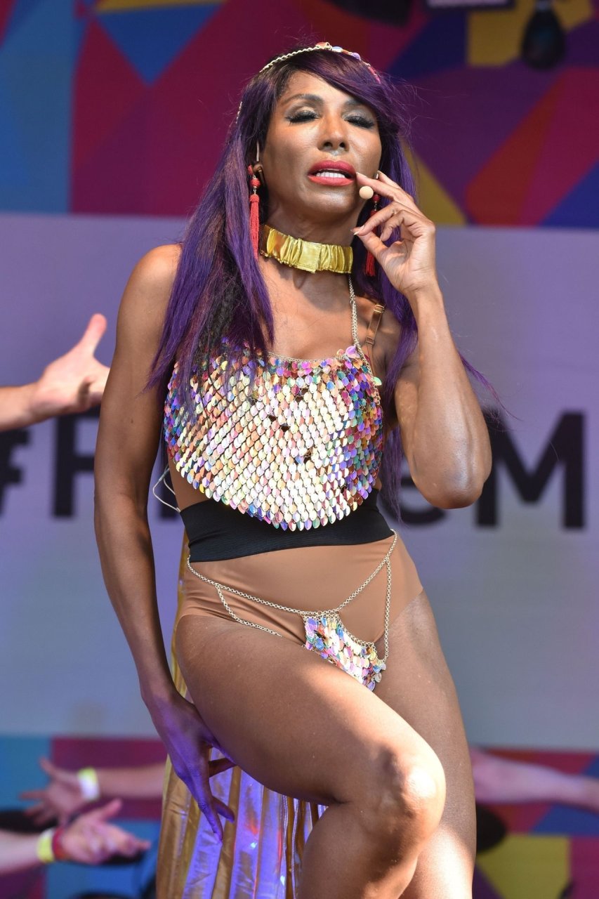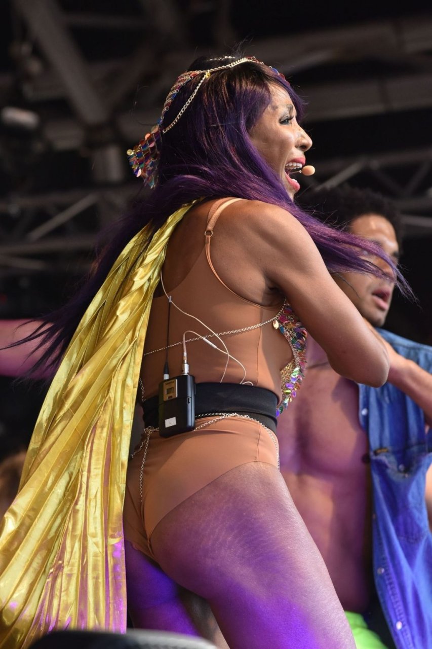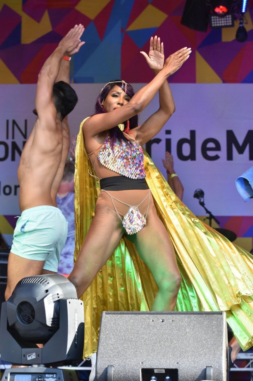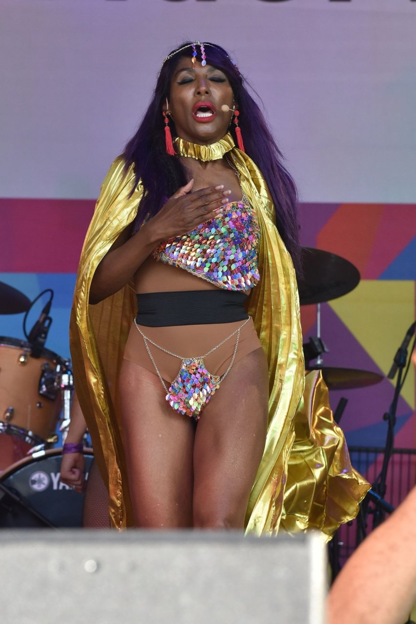 Sinitta fue fotografiada actuando en el escenario principal en Pride en Londres en Trafalgar Square, 07/07/2018. Ya habíamos visto fotos desnudas de Sinitta antes, pero ese día, tuvo un show caliente. La mujer negra de 55 años llevaba un atuendo extraño con un trozo de tela sobre su pussy.