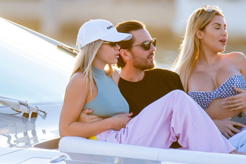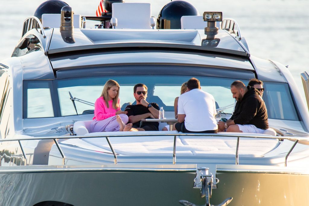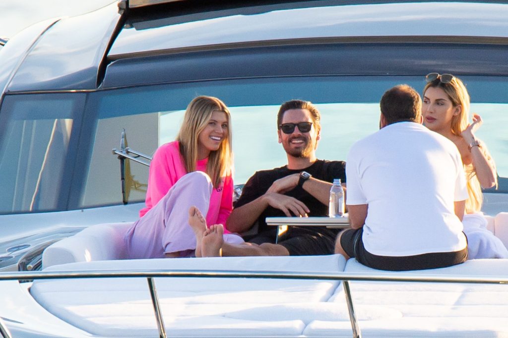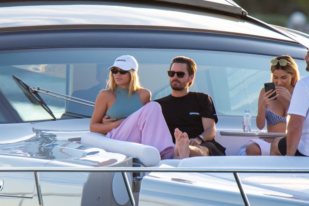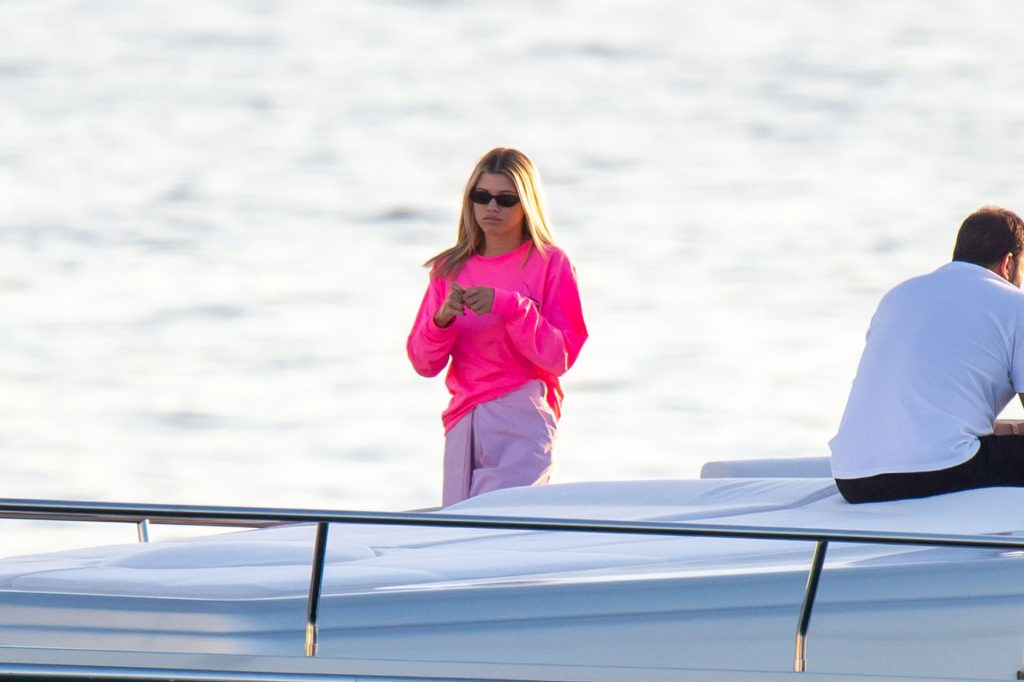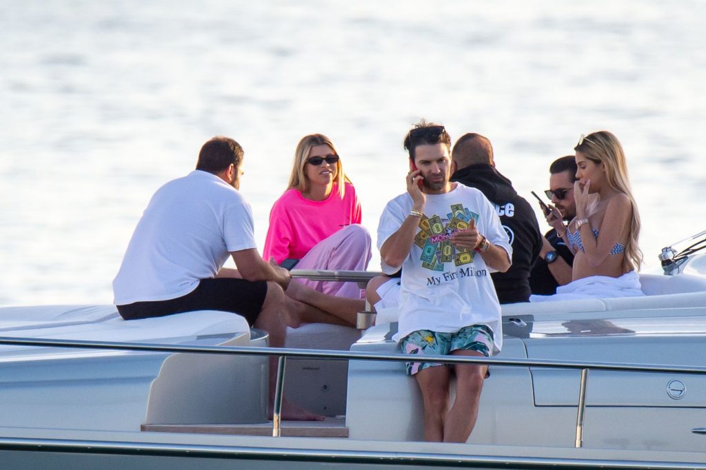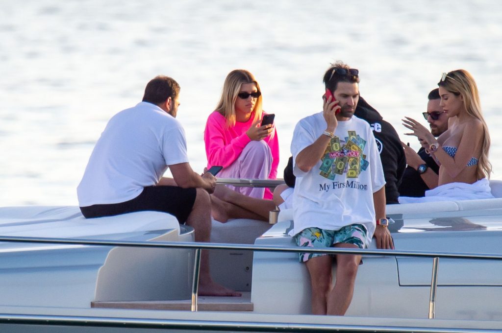 Sofia Richie y Scott Disick se acurrucan en un crucero de lujo en Miami, donde Sofia Richie lleva dos atuendos diferentes. Sofia Richie fue vista primero con una camiseta de manga larga rosa brillante con la frase “cuidado con los tiburones” escrita en la espalda, que forma parte de la colección de merchandising Groot de Dave Grutman. La rubia belleza luego se cambió a una blusa gris sin mangas y se puso su gorra blanca de béisbol. La pareja estaba en el yate de lujo con amigos, incluido Dave Grutman, a quien pertenece el barco.