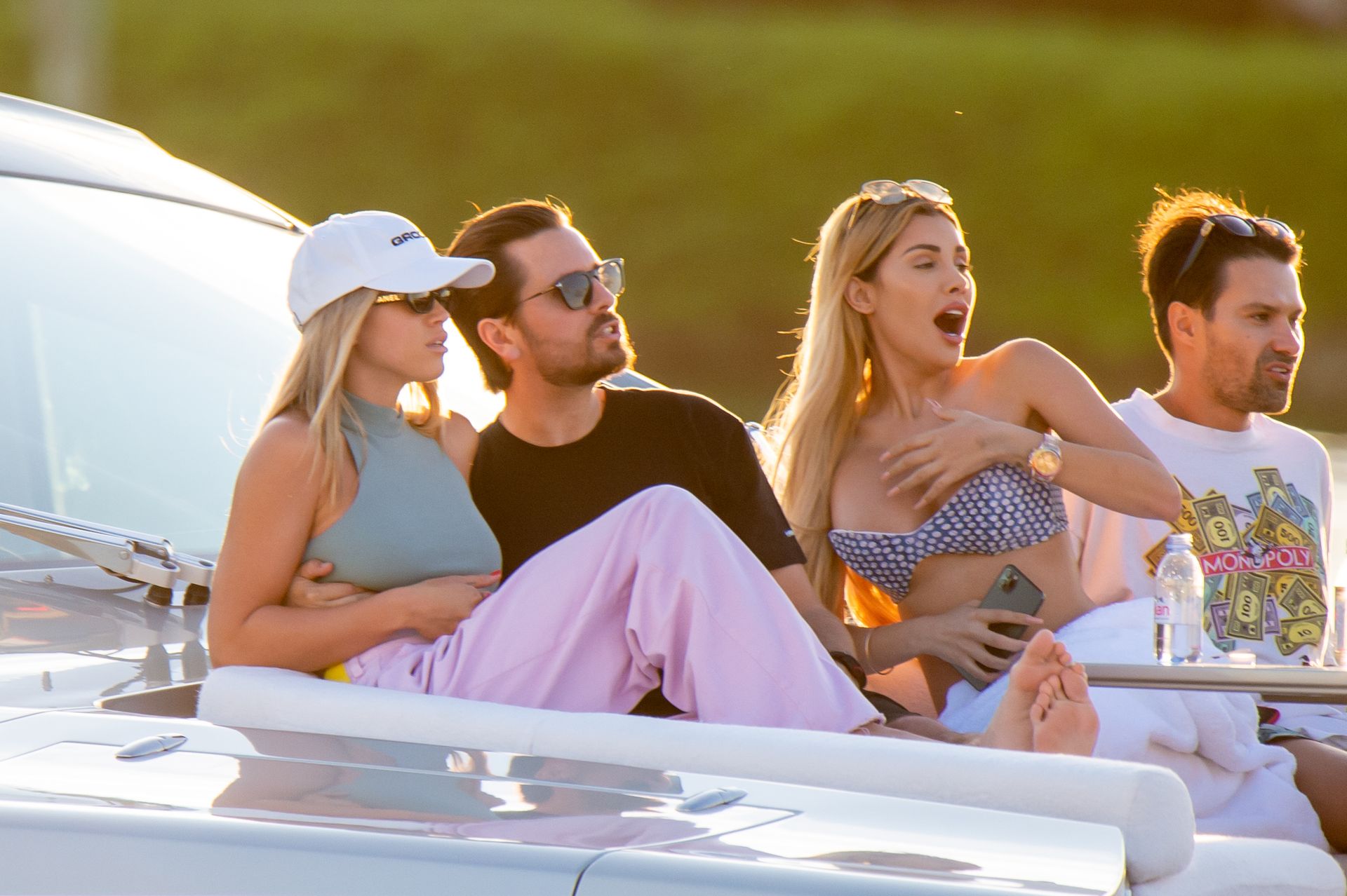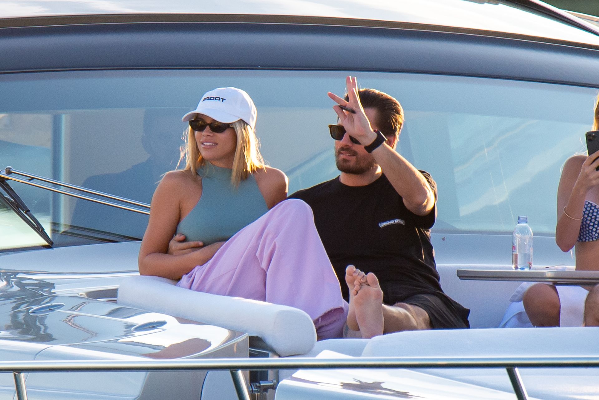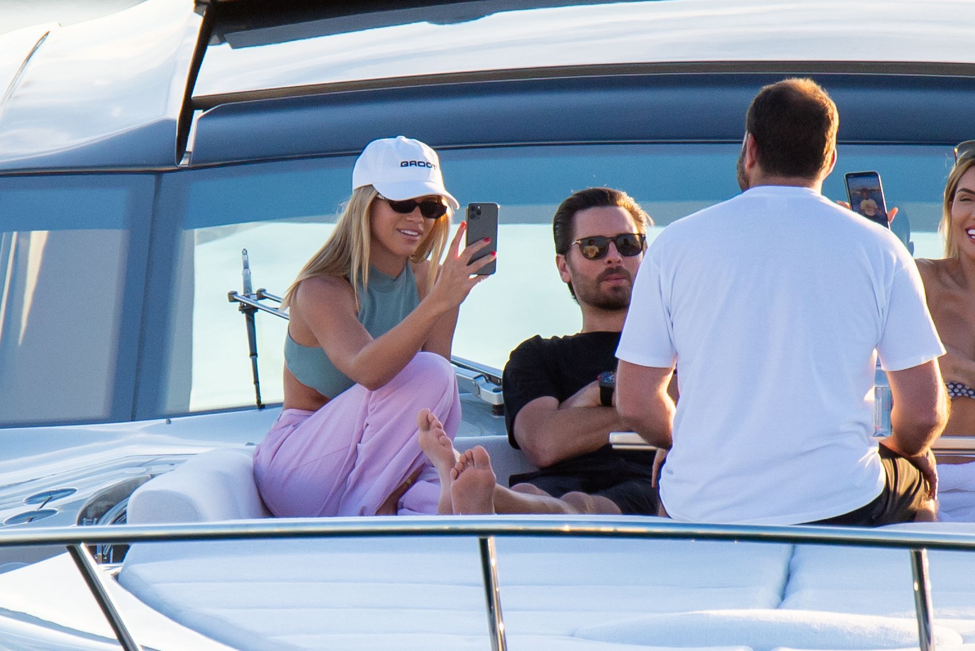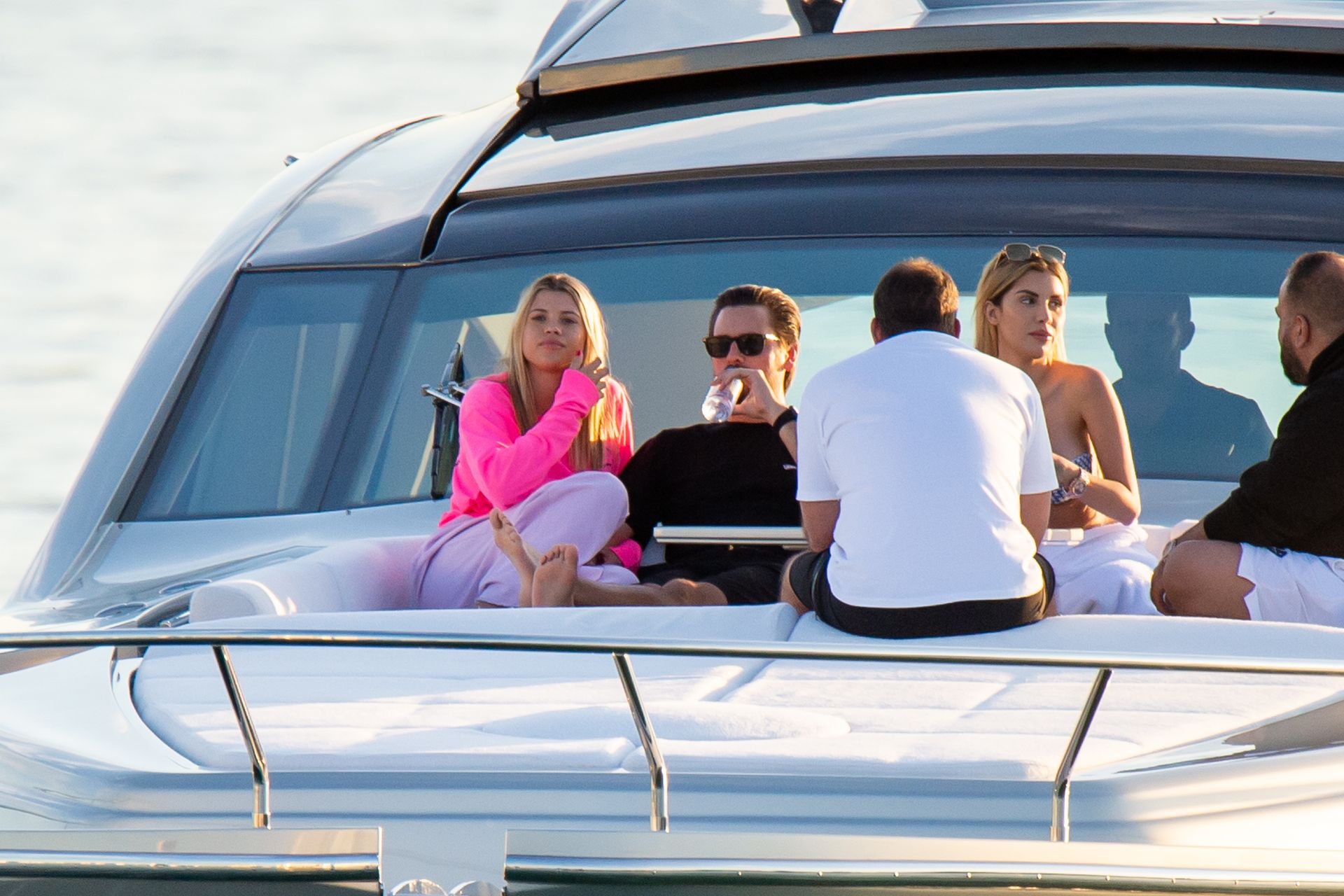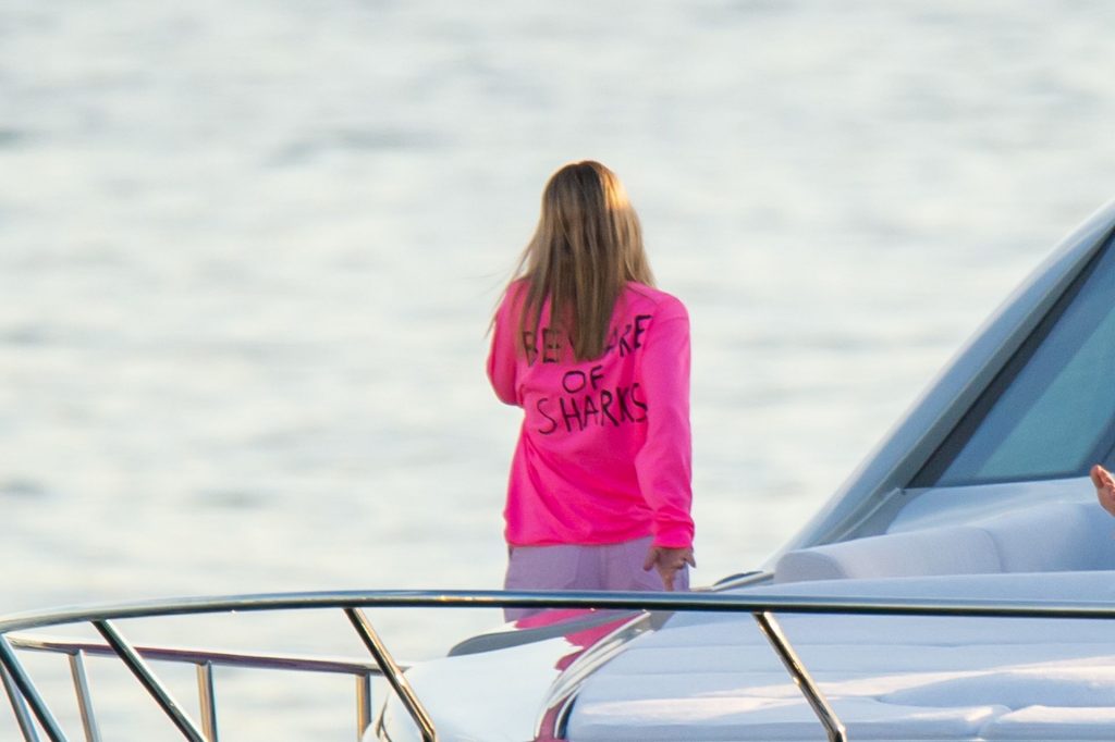 Sofia Richie y Scott Disick se acurrucan en un crucero de lujo en Miami, donde Sofia Richie lleva dos atuendos diferentes. Sofia Richie fue vista primero con una camiseta de manga larga rosa brillante con la frase “cuidado con los tiburones” escrita en la espalda, que forma parte de la colección de merchandising Groot de Dave Grutman. La rubia belleza luego se cambió a una blusa gris sin mangas y se puso su gorra blanca de béisbol. La pareja estaba en el yate de lujo con amigos, incluido Dave Grutman, a quien pertenece el barco.