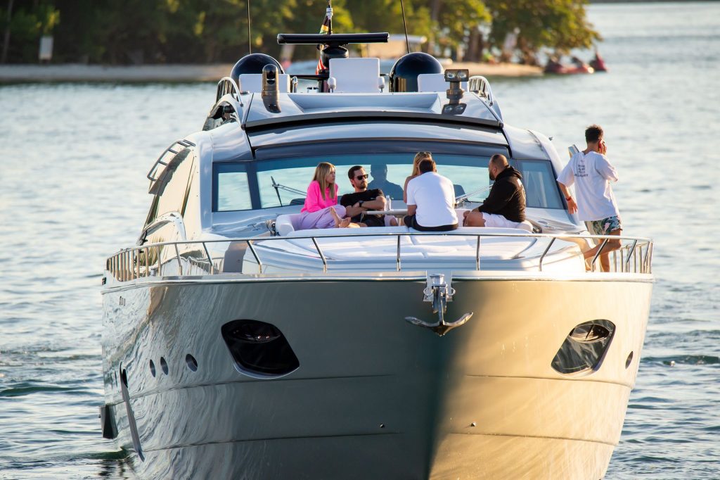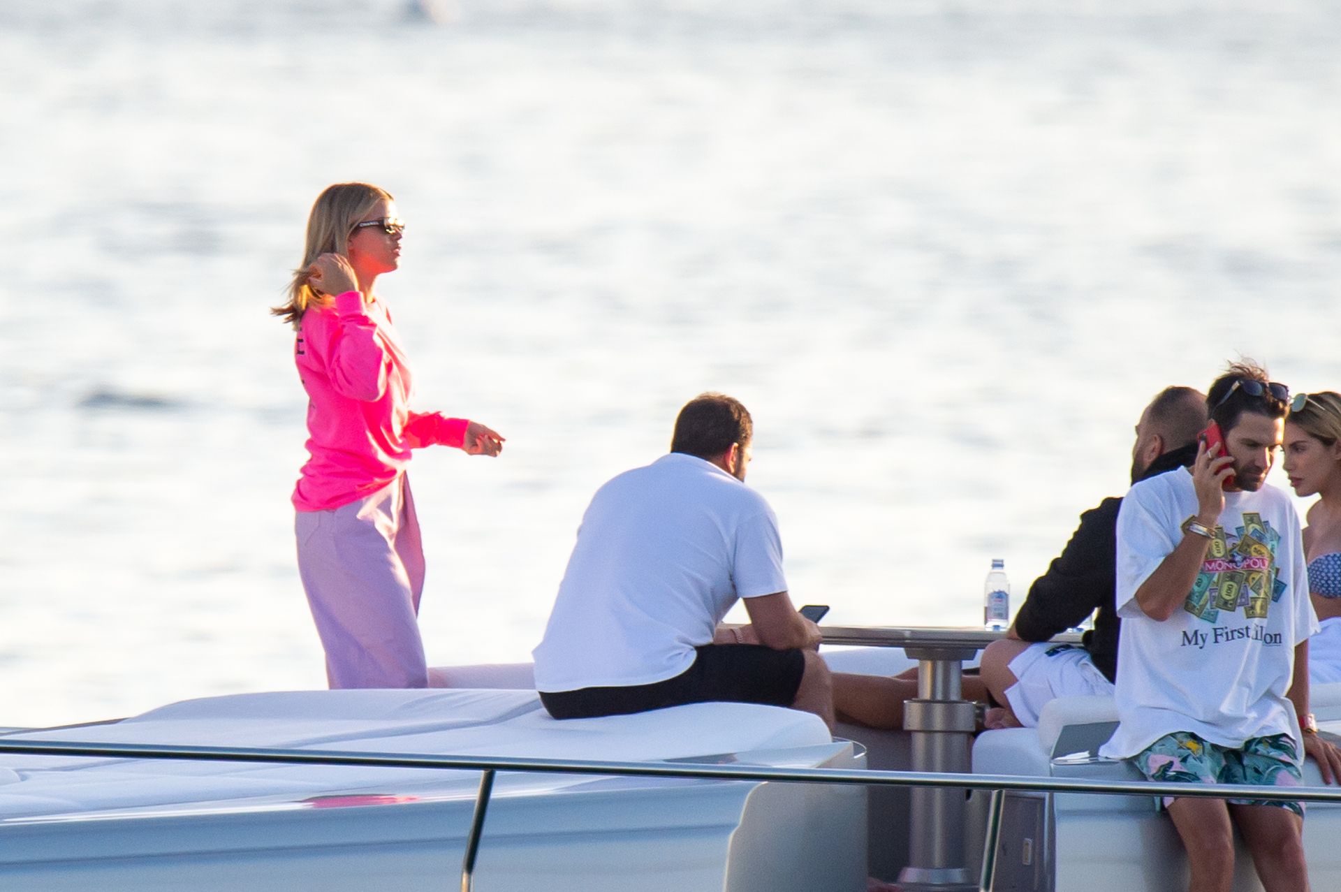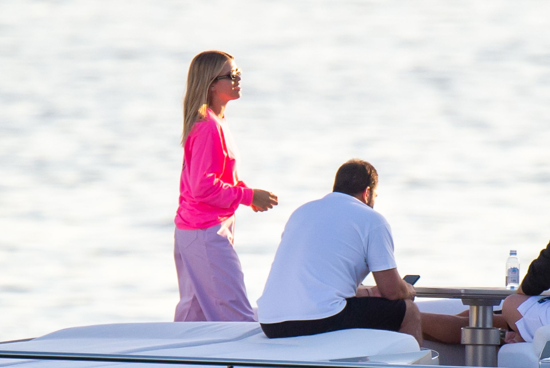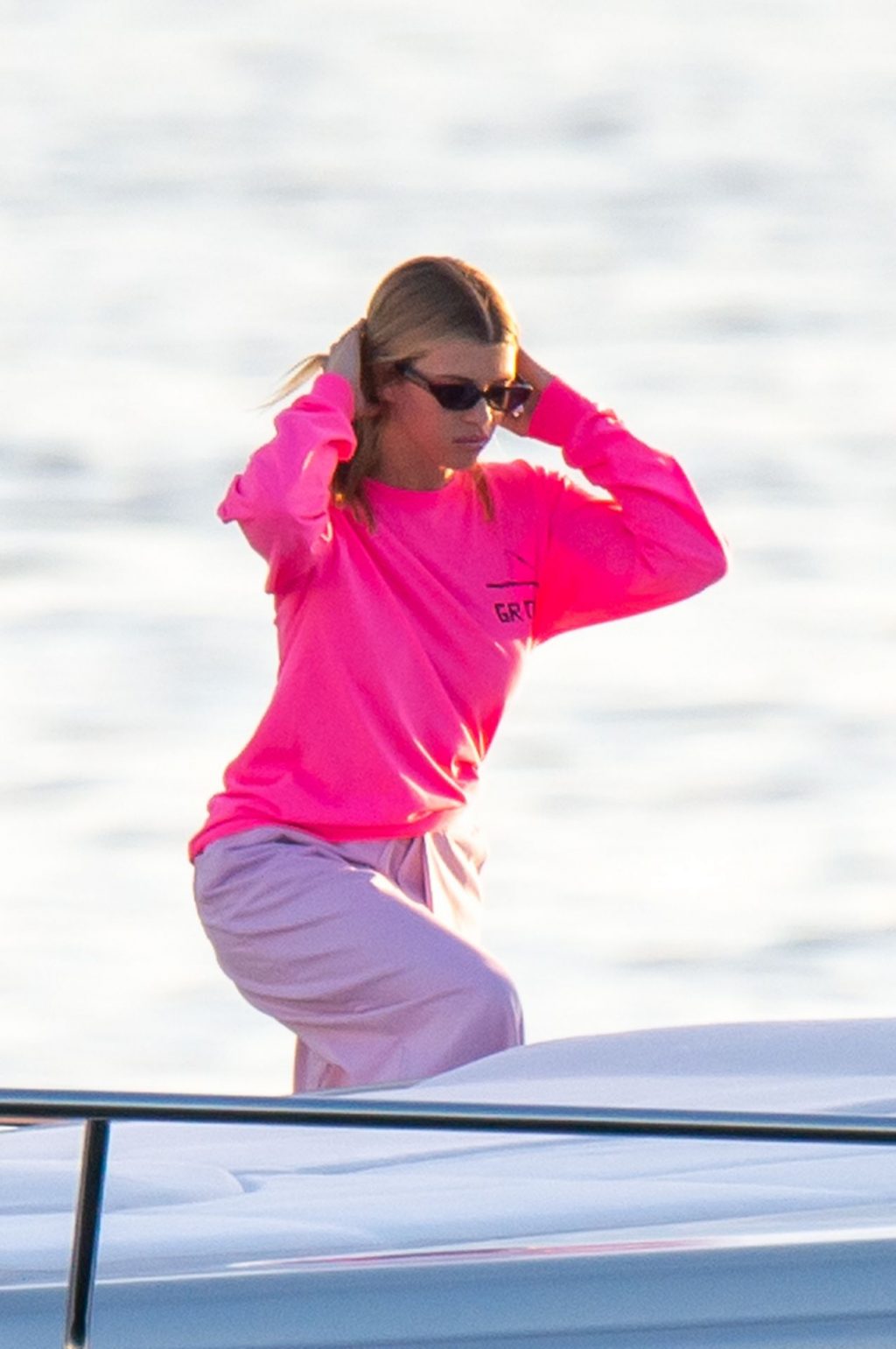 Sofia Richie y Scott Disick se acurrucan en un crucero de lujo en Miami, donde Sofia Richie lleva dos atuendos diferentes. Sofia Richie fue vista primero con una camiseta de manga larga rosa brillante con la frase “cuidado con los tiburones” escrita en la espalda, que forma parte de la colección de merchandising Groot de Dave Grutman. La rubia belleza luego se cambió a una blusa gris sin mangas y se puso su gorra blanca de béisbol. La pareja estaba en el yate de lujo con amigos, incluido Dave Grutman, a quien pertenece el barco.