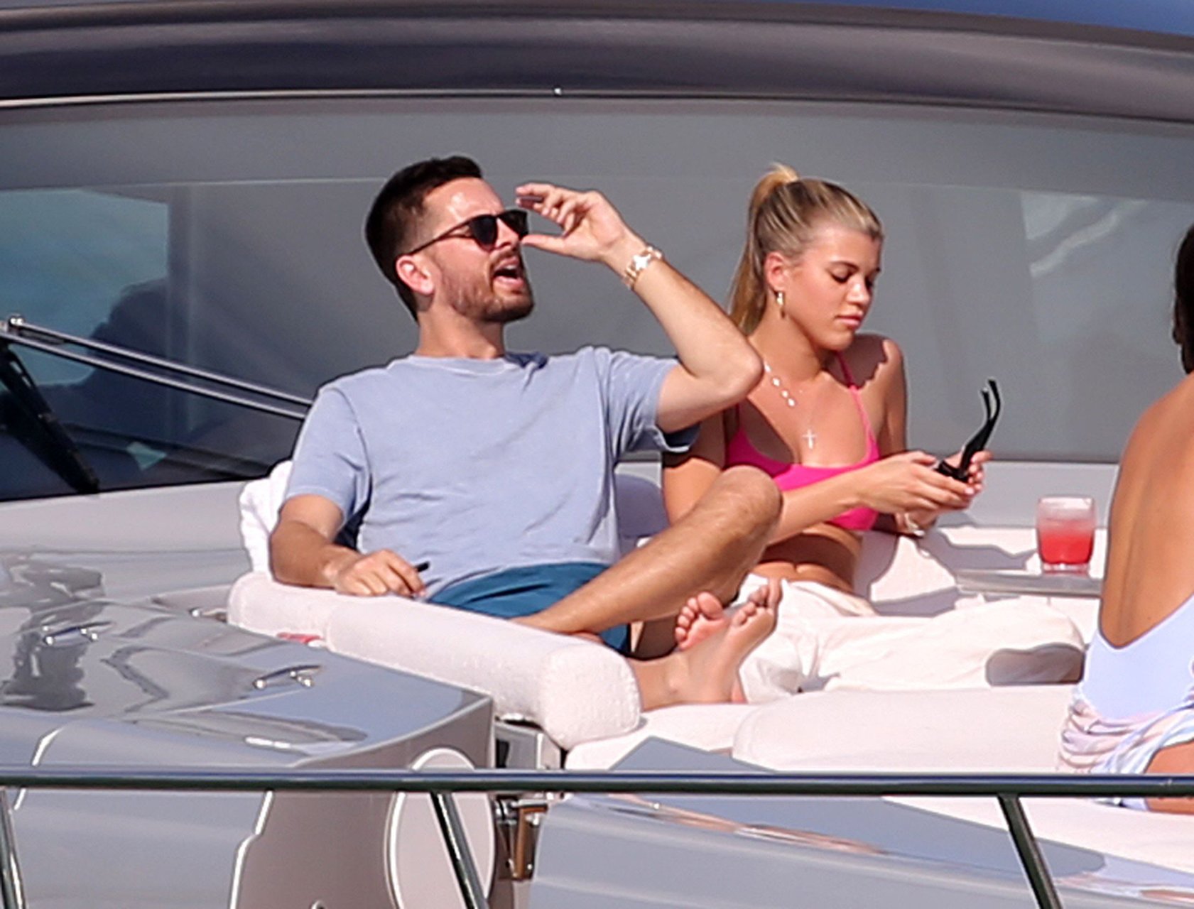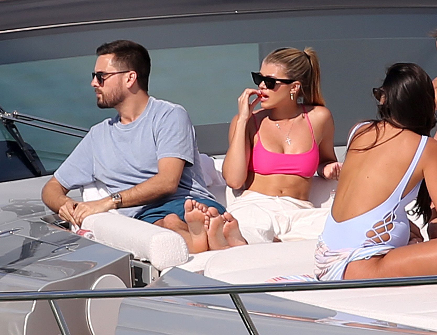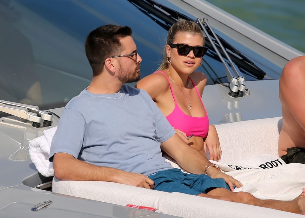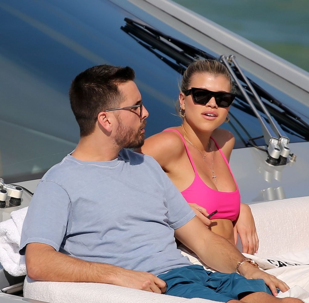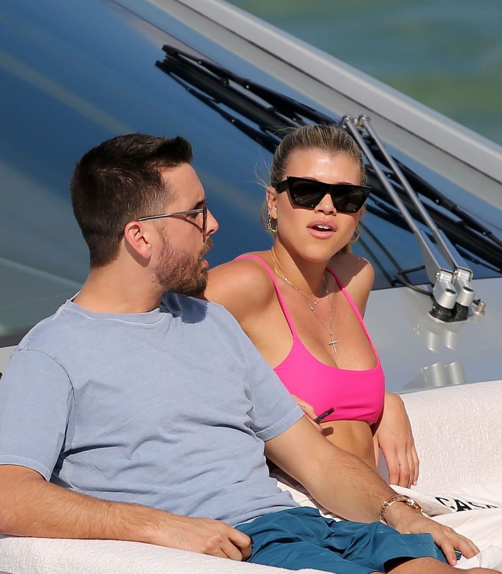 Model Sofia Richie lleva un top de bikini rosa fuerte mientras se relaja en un yate con su novio Scott Disick en Miami, 17/02/2019.