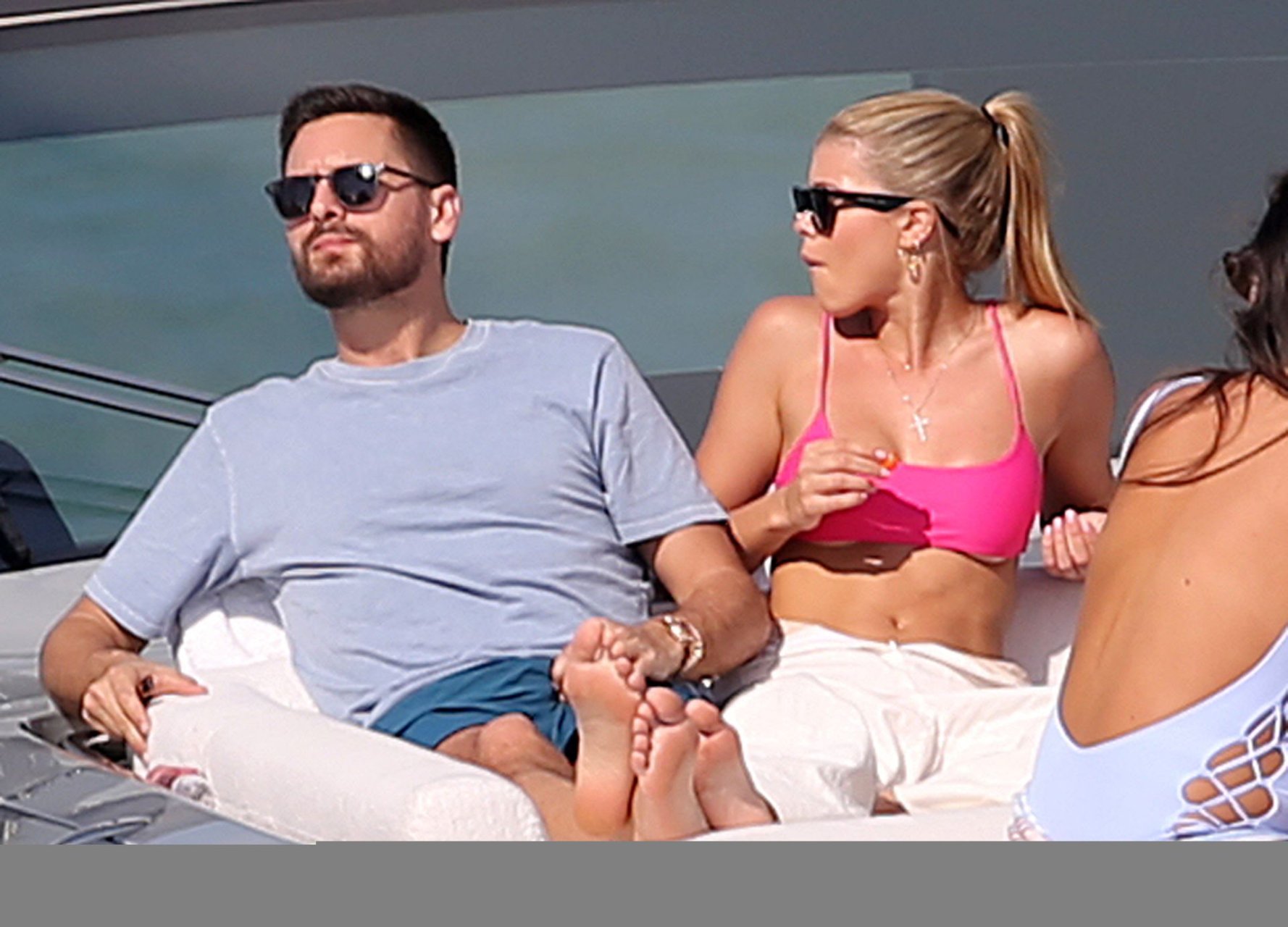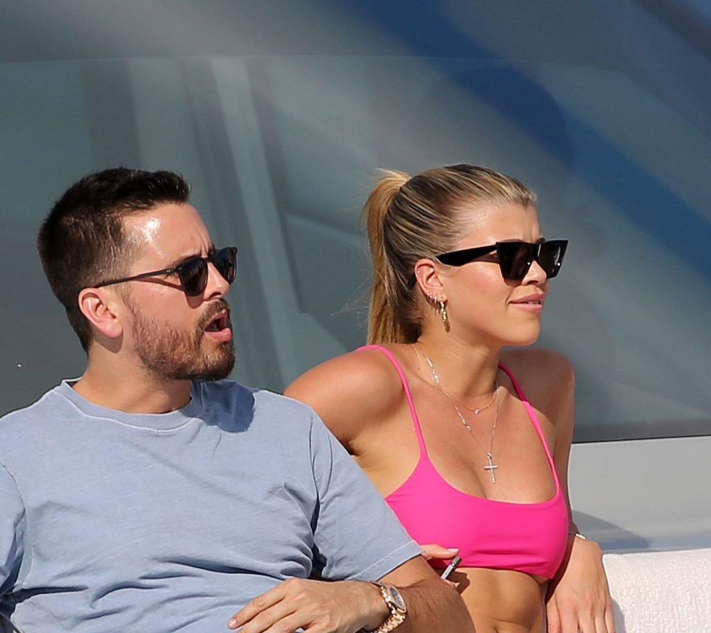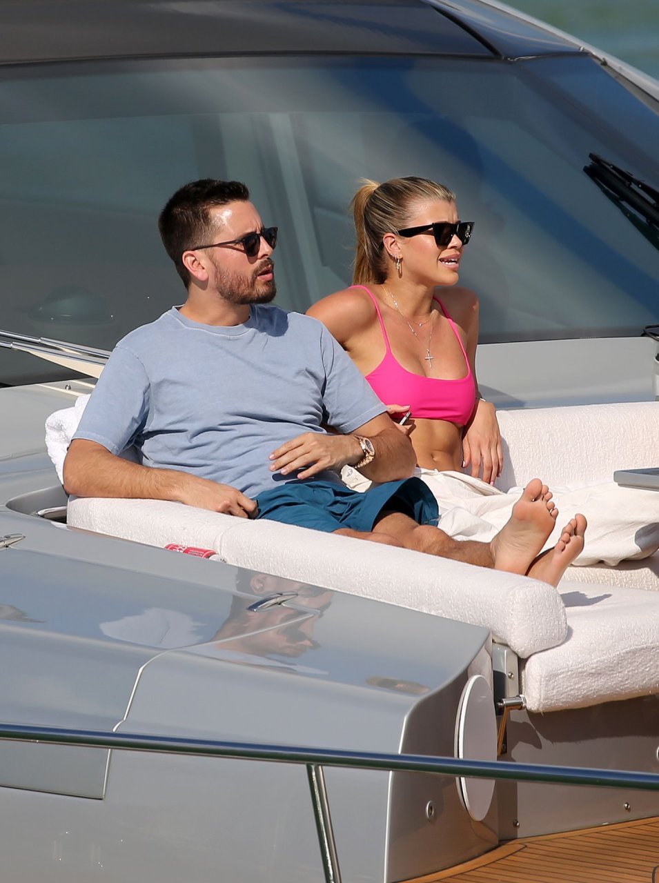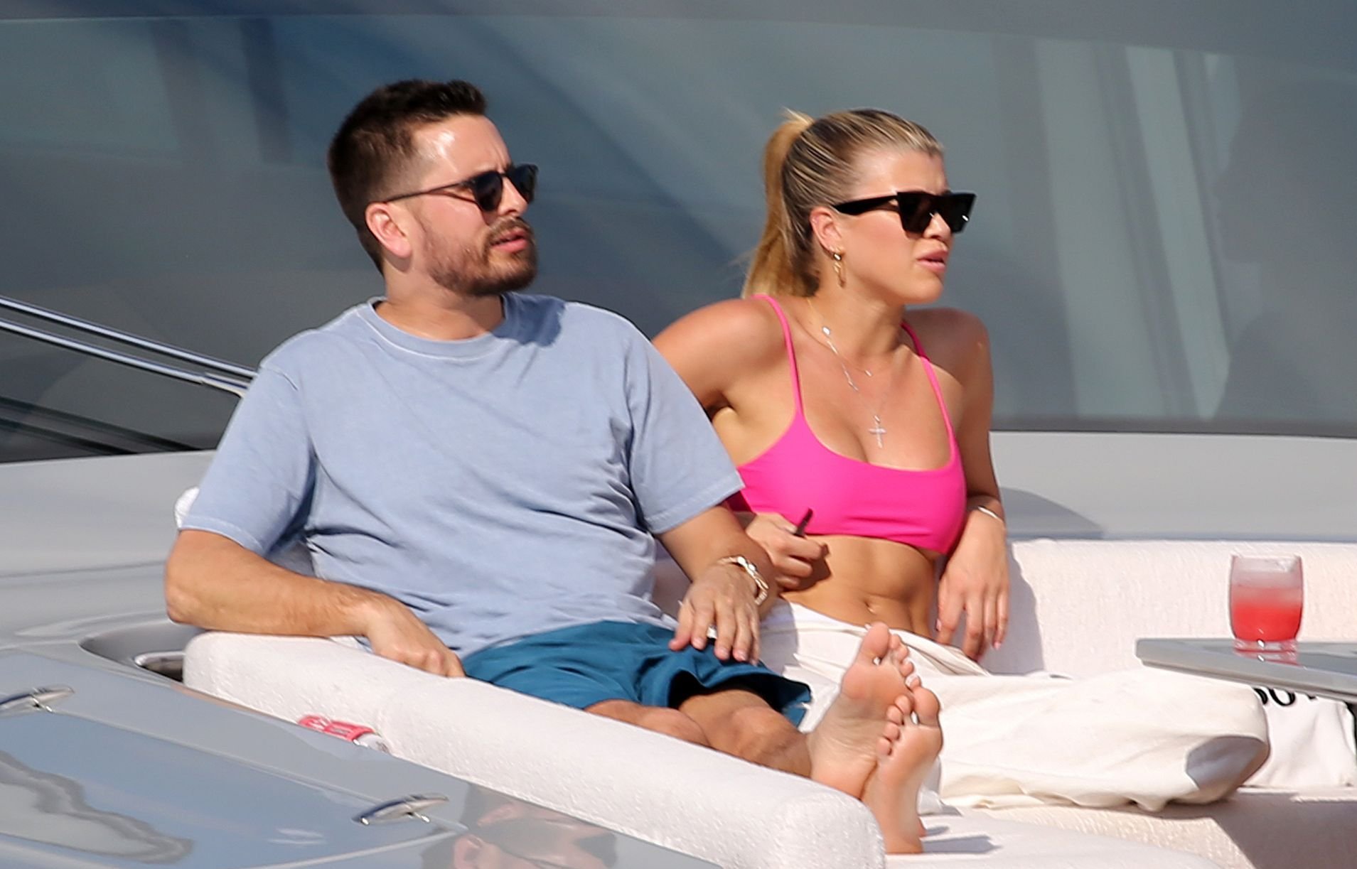 Model Sofia Richie lleva un top de bikini rosa fuerte mientras se relaja en un yate con su novio Scott Disick en Miami, 17/02/2019.