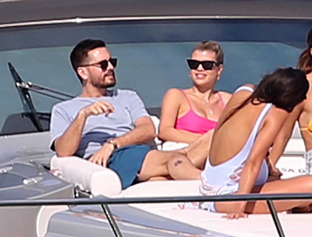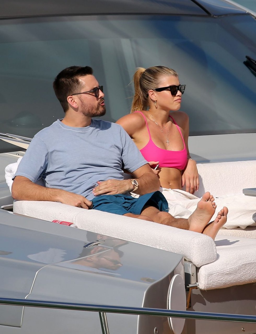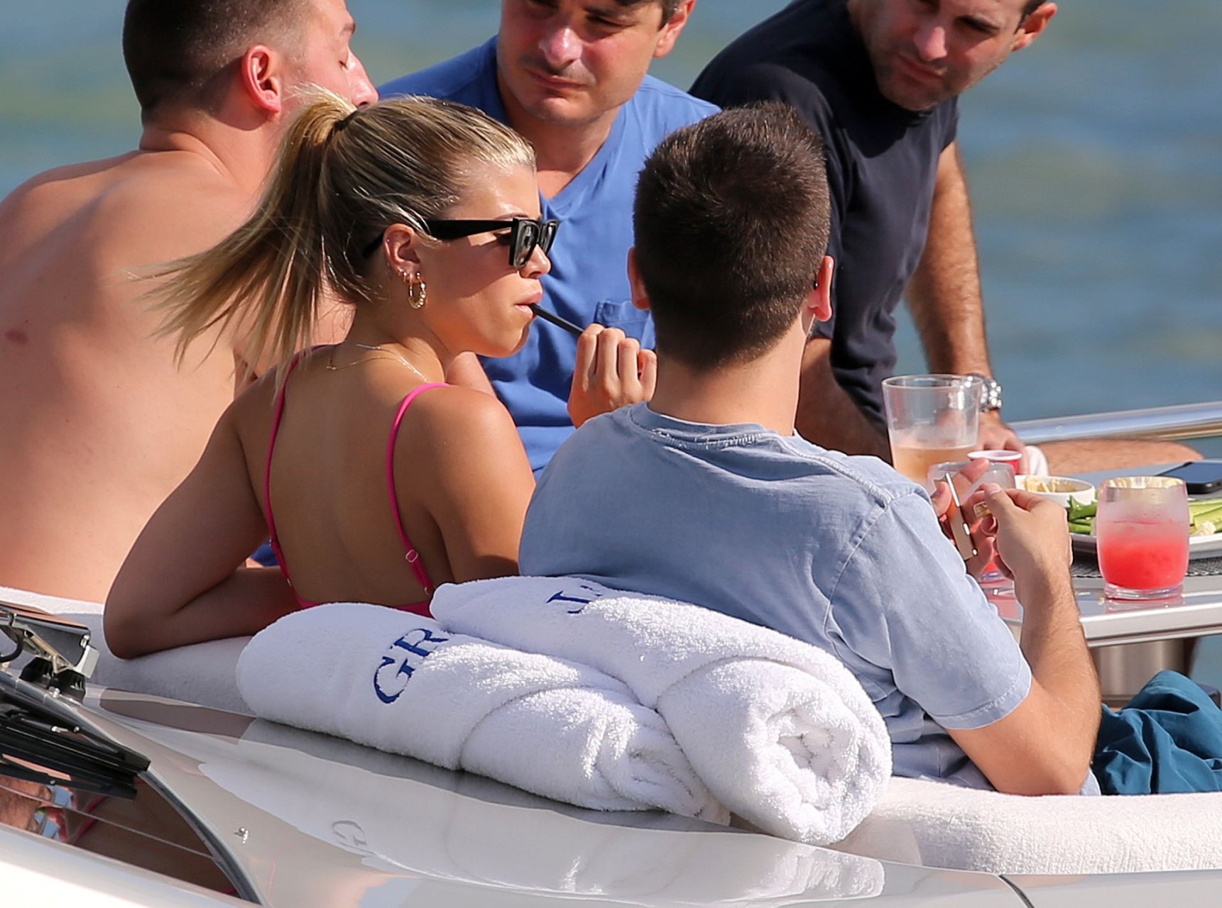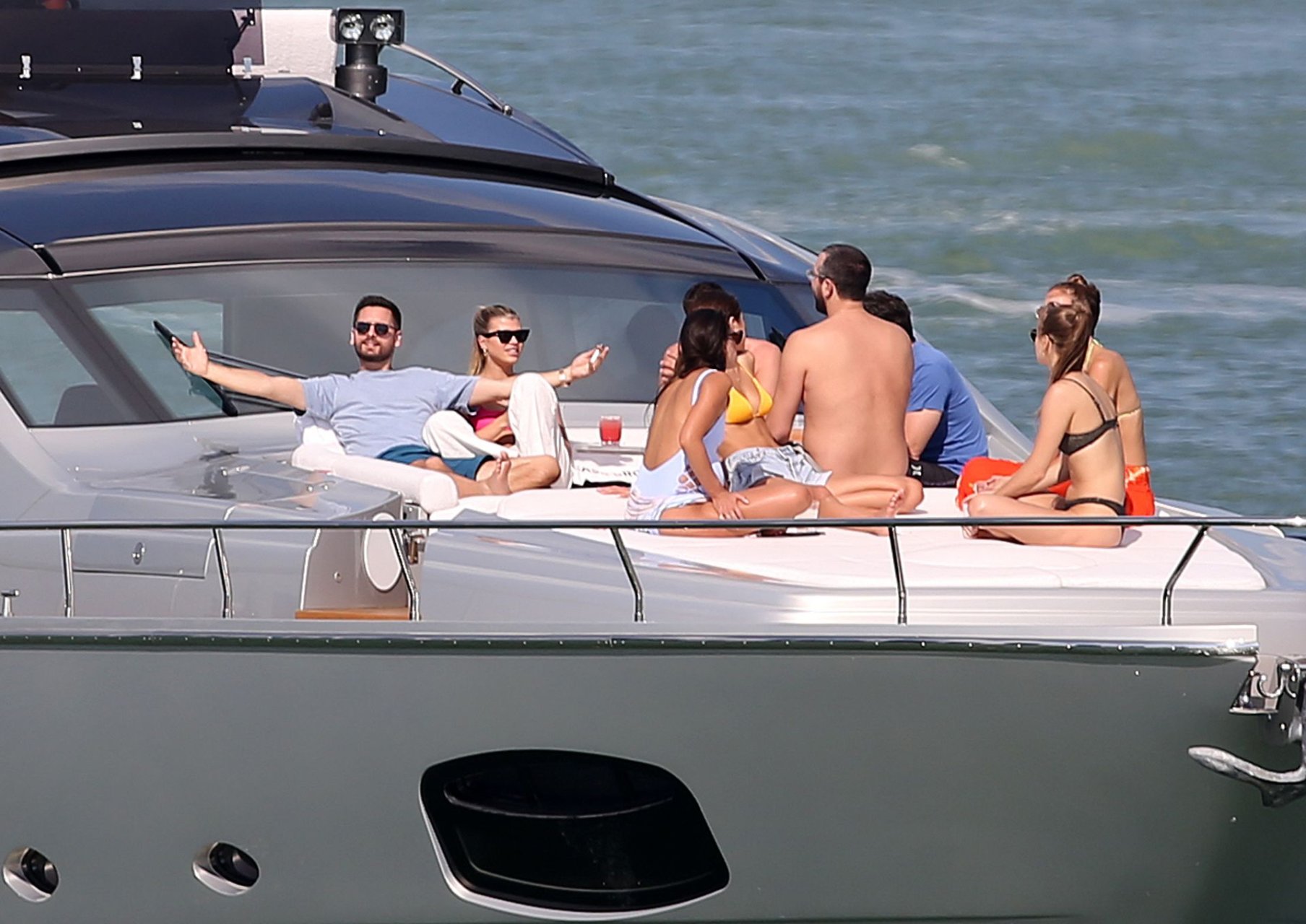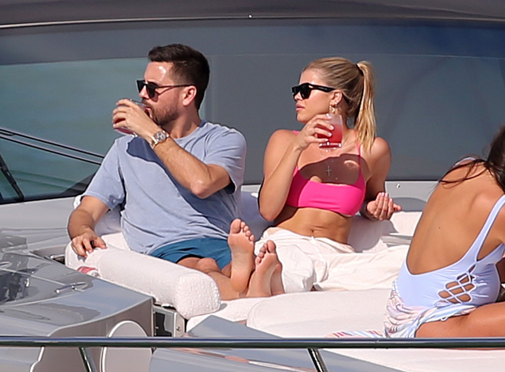 Model Sofia Richie lleva un top de bikini rosa fuerte mientras se relaja en un yate con su novio Scott Disick en Miami, 17/02/2019.