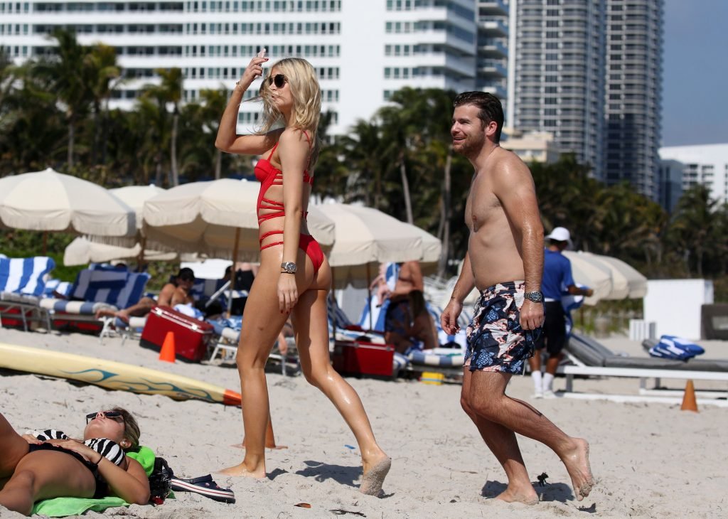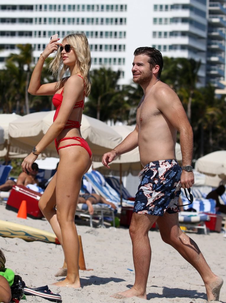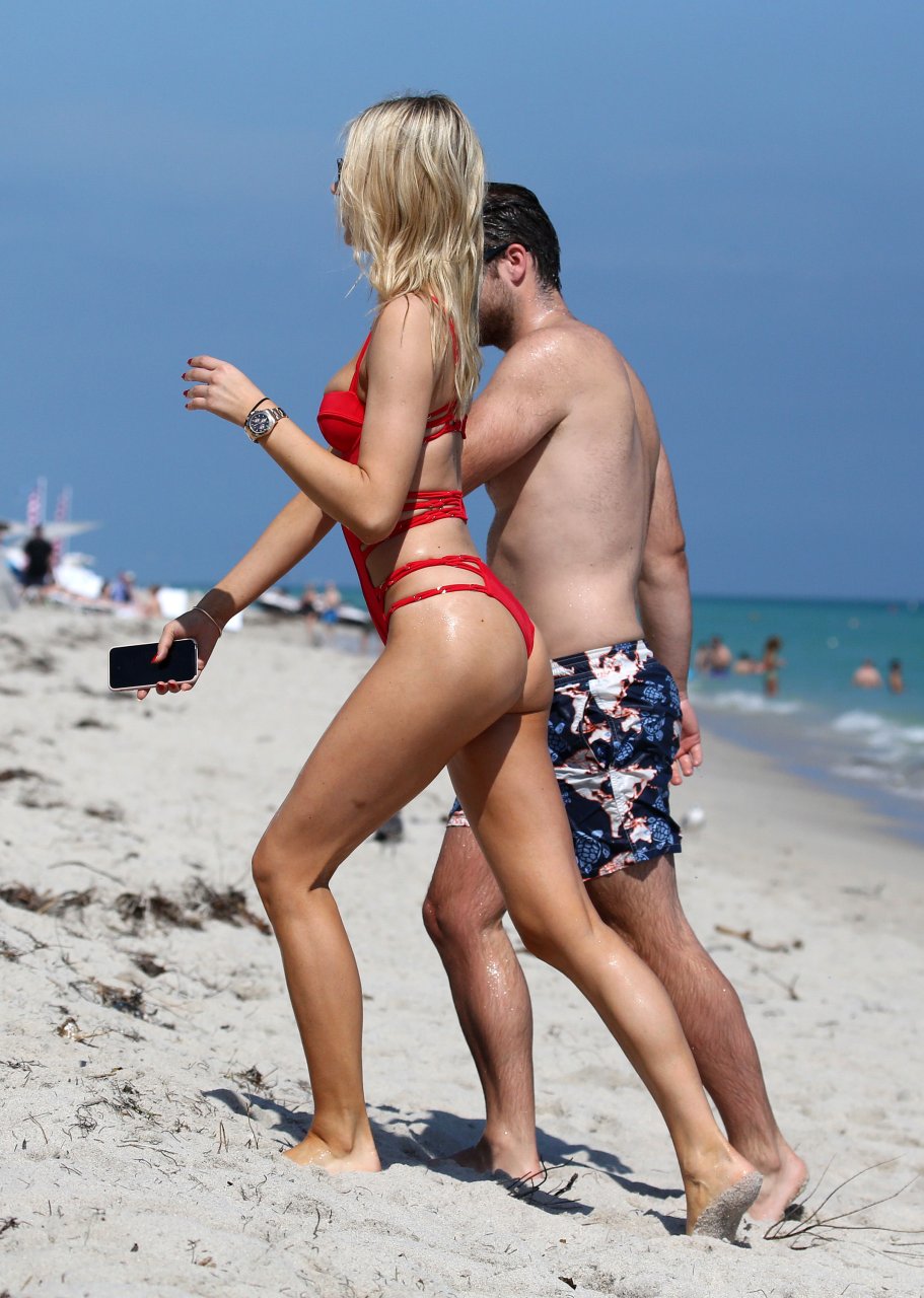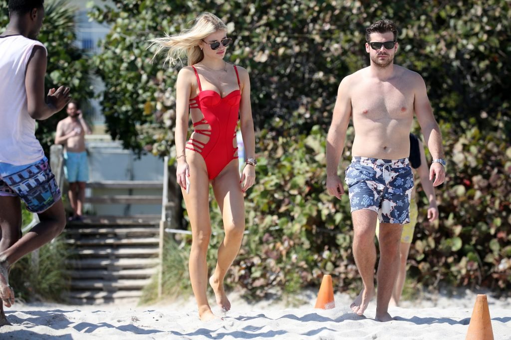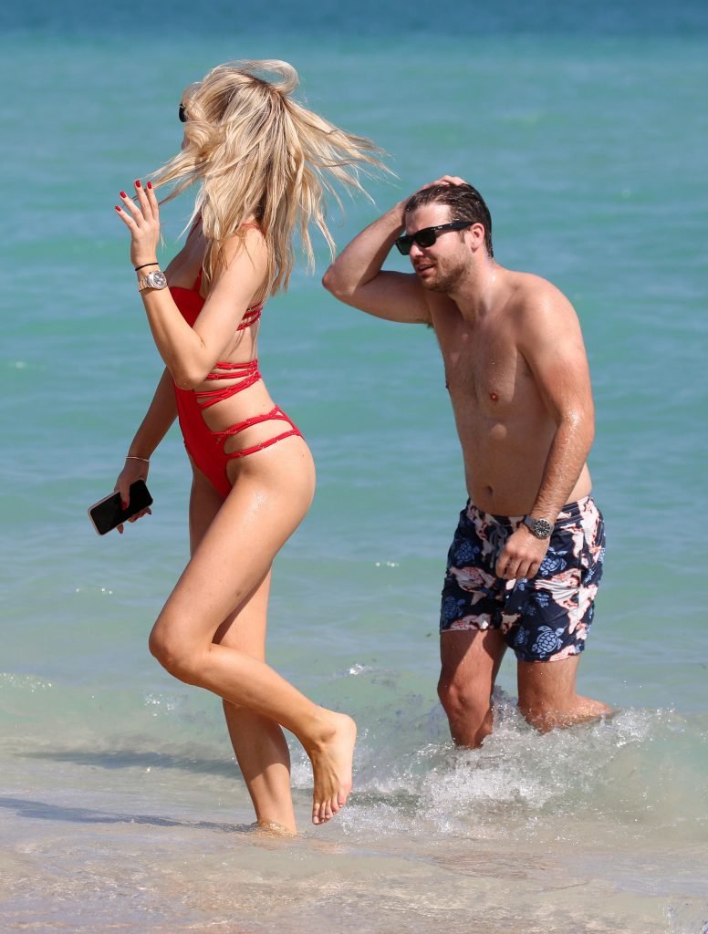 La modelo Sofija Milosevic, de 25 años, lleva un bikini rojo mientras pasa el Día de San Valentín con el futbolista Adem Ljajic en la playa de Miami, 14/02/2018.